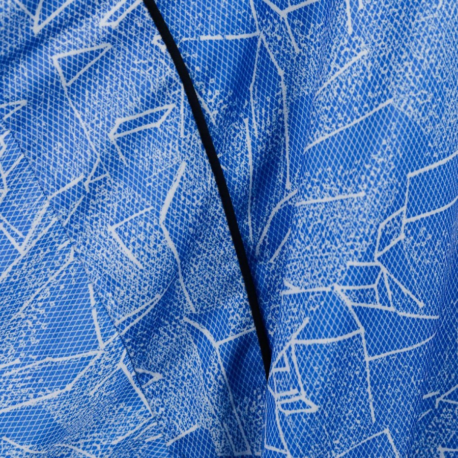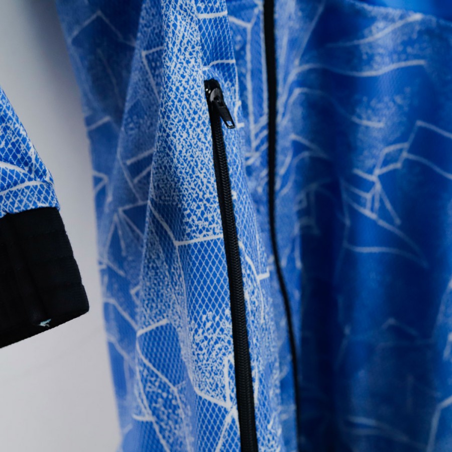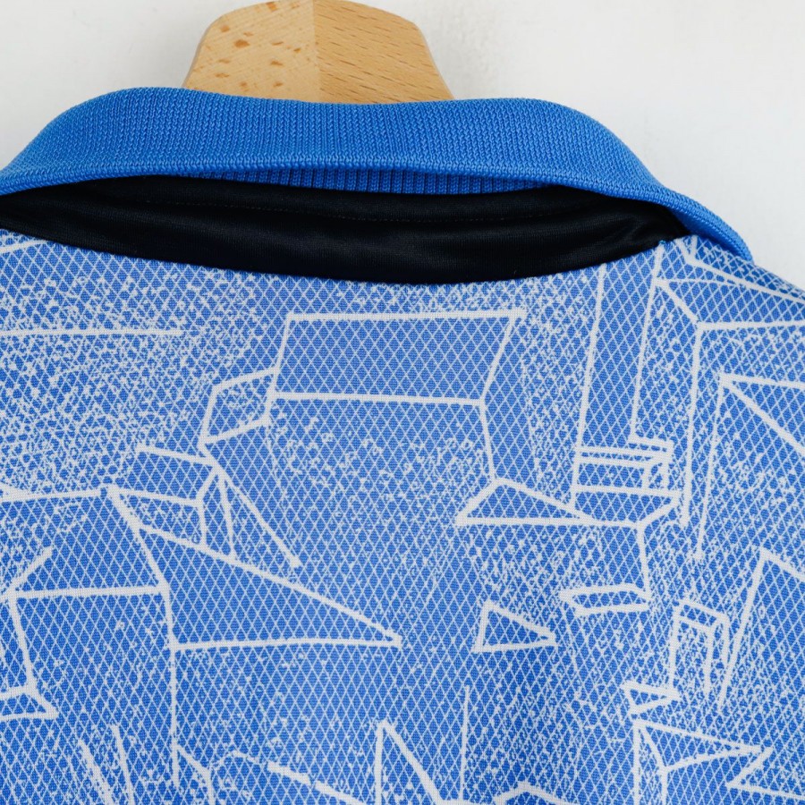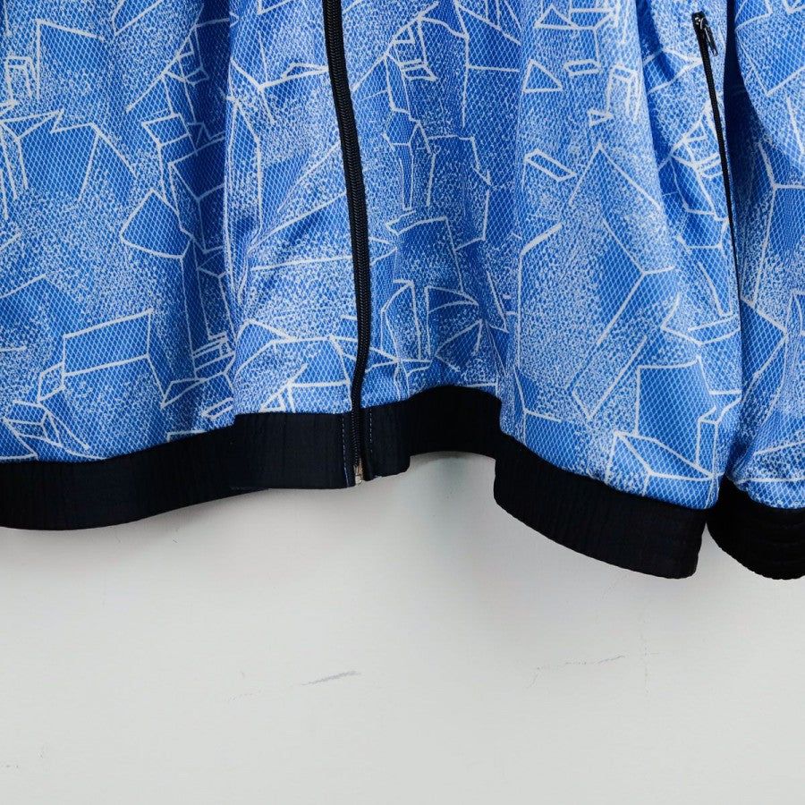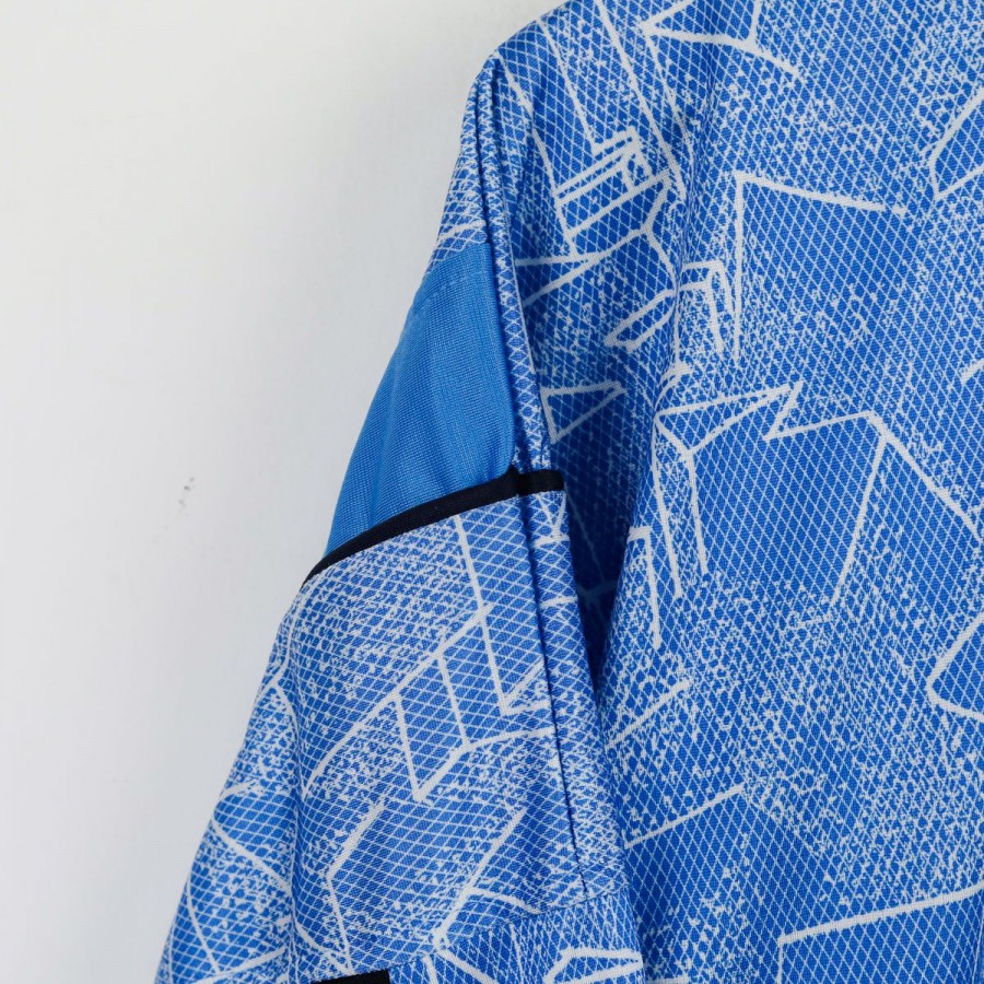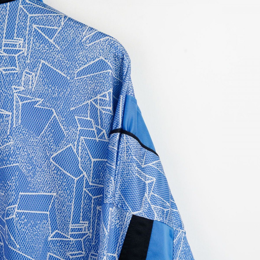 Giacca da allenamento dell'Inter realizzata da Umbro per la stagione 1994/1995. Il design è caratterizzato da un motivo geometrico bianco su base blu, con inserti neroazzurri e chiusura a zip integrale. Presenti il logo Umbro ricamato in giallo e lo stemma dell'Inter con la stella sul petto. Un capo iconico degli anni ‘90, ideale per i collezionisti e gli appassionati nerazzurri. Taglia XL.