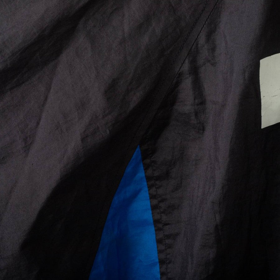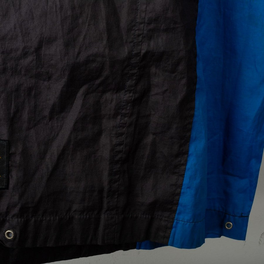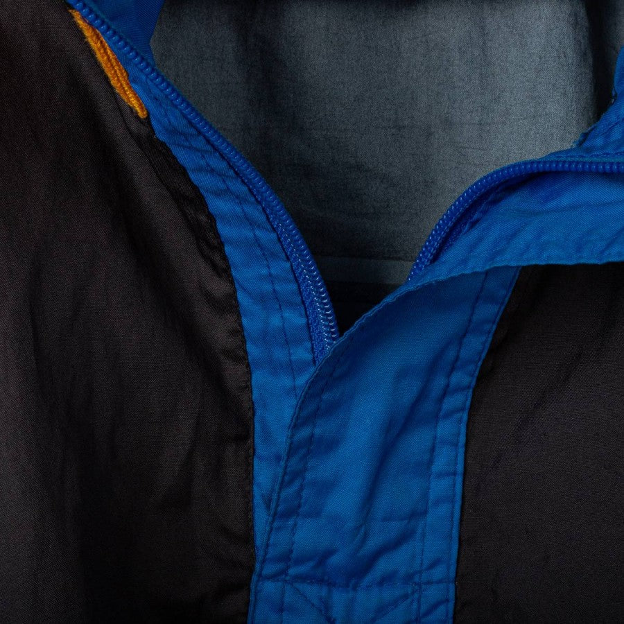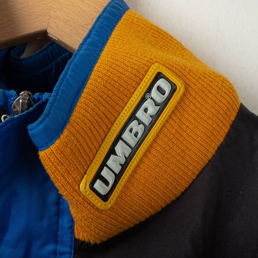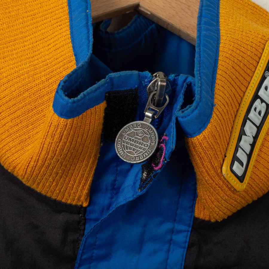 Giacca Inter Umbro Pirelli 1997/1998. Realizzata da Umbro, presenta il logo tecnico al centro del petto e sulla schiena insieme al logo commerciale Pirelli, sponsor storico dei nerazzurri. Il design è caratterizzato da ampie bande blu sulle maniche e sul corpo, con dettagli gialli sul colletto a costine. Taglia M visibile all'interno del colletto. Questa giacca richiama una delle stagioni più iconiche dell'Inter, con Ronaldo "Il Fenomeno" come protagonista assoluto, arrivato a Milano proprio in quell'annata.
