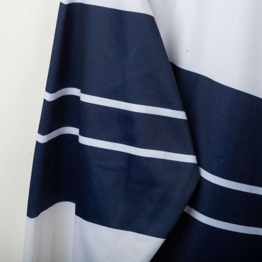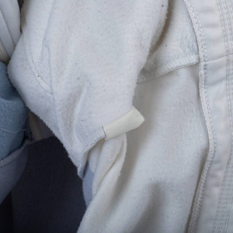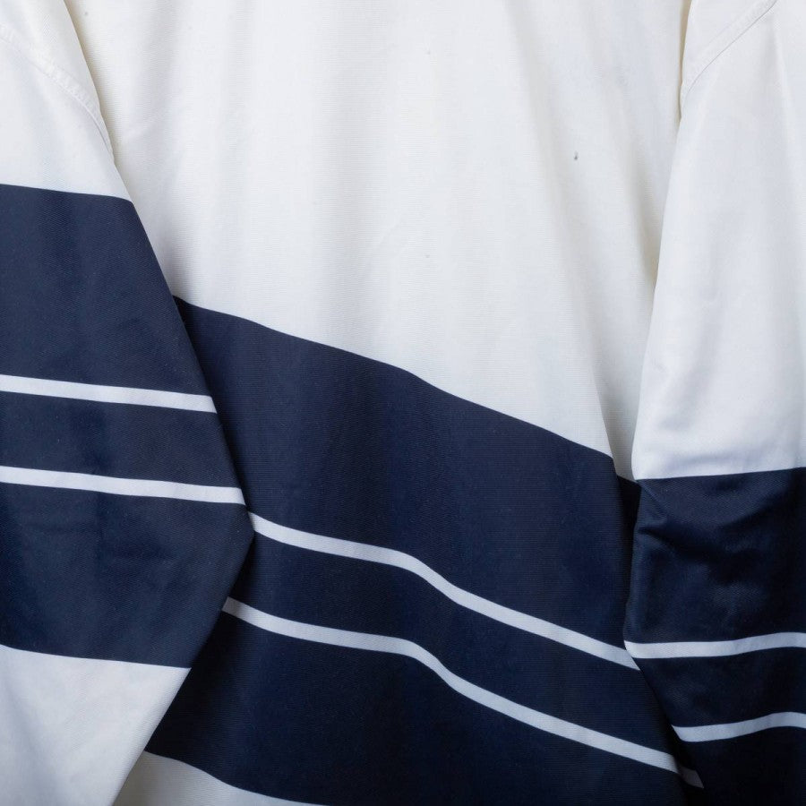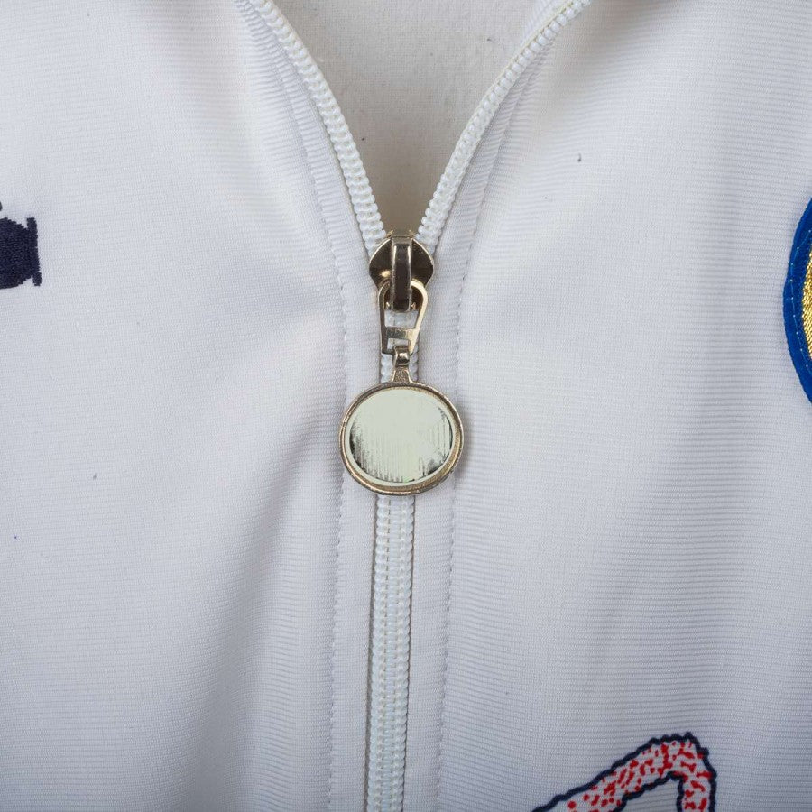 Giacca rappresentativa della Nazionale Italiana realizzata da Diadora per la stagione 1990. Modello iconico a zip intera con base bianca e dettagli grafici blu navy, tricolore stilizzato sul petto e inserti glitterati. Logo Diadora ricamato e stemma FIGC cucito lato cuore con tre stelle dorate. Collo alto e vestibilità regolare. Taglia L.