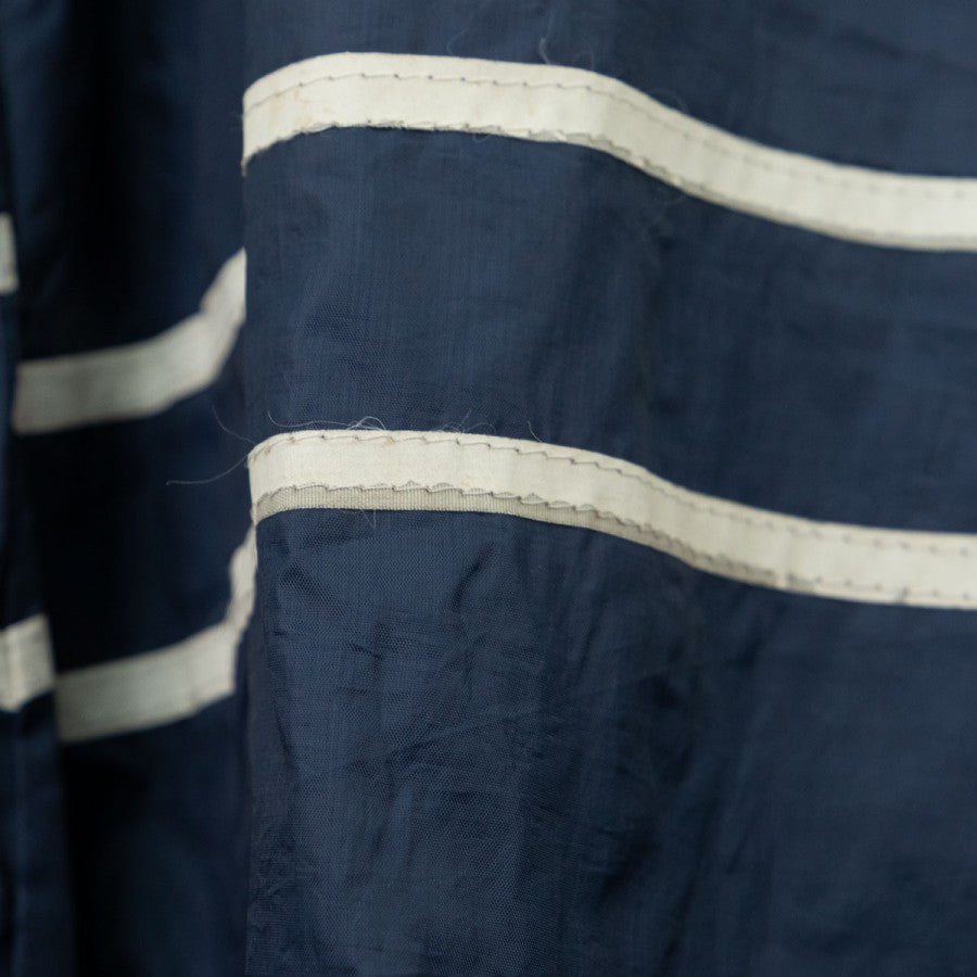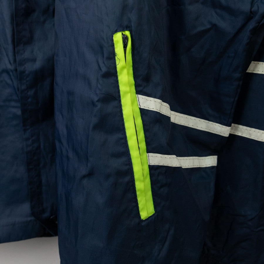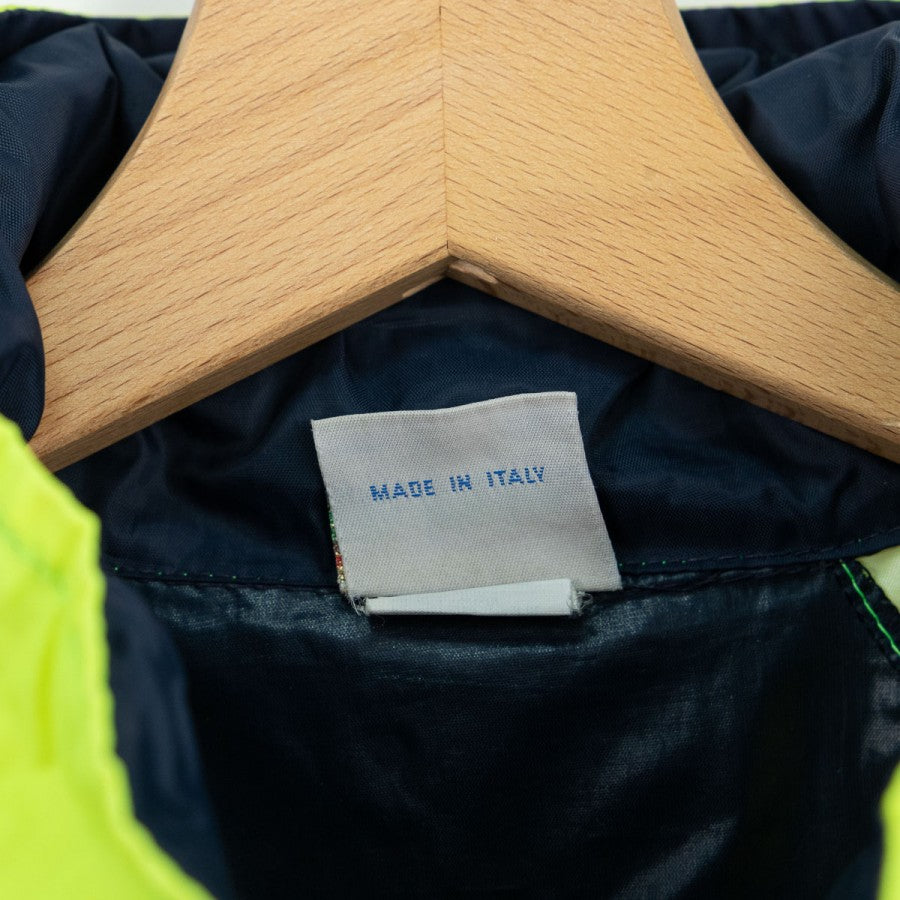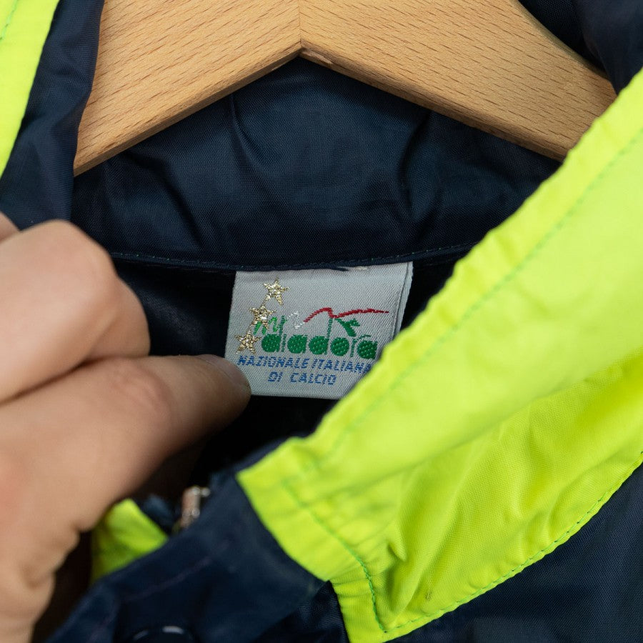 Giacca ufficiale della Nazionale Italiana di calcio risalente ai primi anni '90, prodotta dallo sponsor tecnico Diadora. Il design è un classico dell'epoca, con taglio oversize, chiusura a zip coperta e fondo elasticizzato. I colori predominanti sono il blu navy e il bianco, arricchiti da inserti giallo fluo e dettagli grafici tricolore lungo le maniche. Sul petto sono presenti lo stemma FIGC dell'epoca cucito lato cuore e il logo Diadora sul lato destro, accompagnato dal tricolore stilizzato. Sulla schiena spiccano le decorazioni grafiche che richiamano lo stile vibrante degli anni Novanta. La taglia indicata è XL.