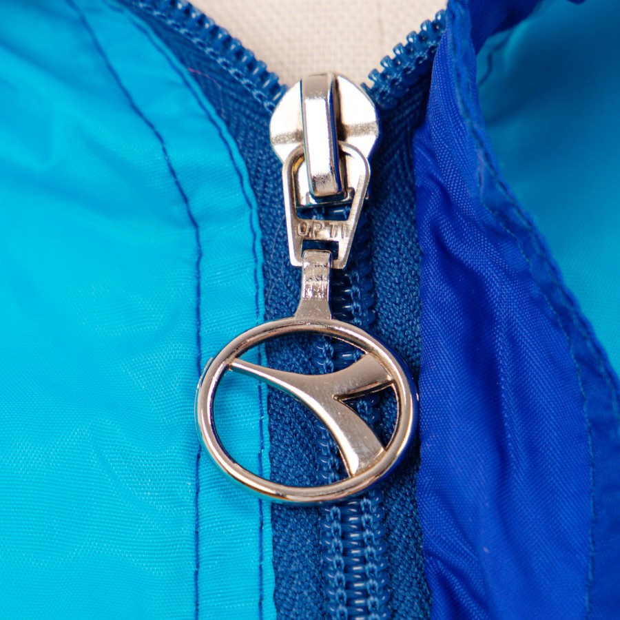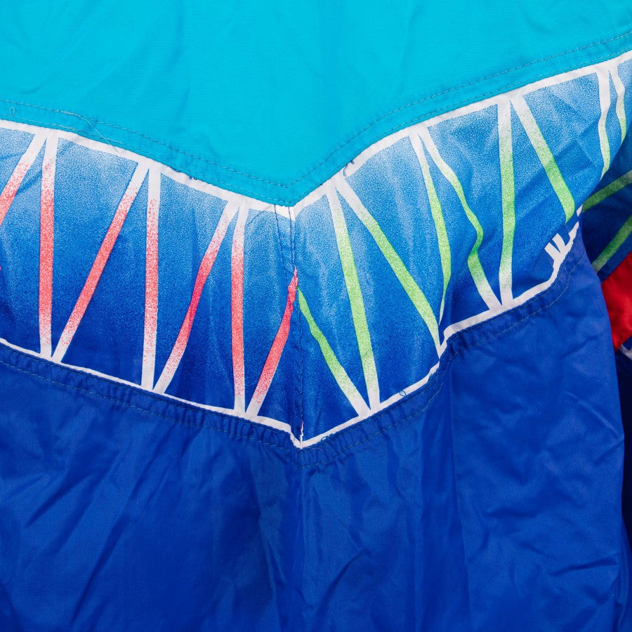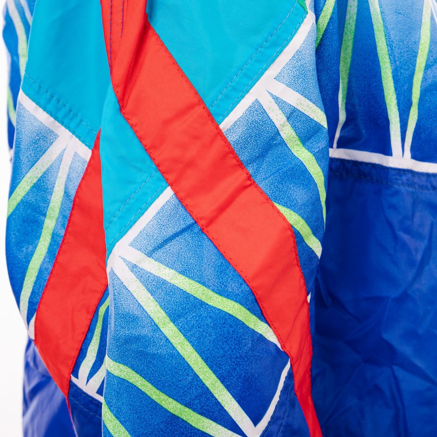 La giacca antivento è in azzurro e celeste ma presenta anche fantasie geometriche in bianco, rosso e verde. Chiusura assicurata da sistema in full zip in acciaio.