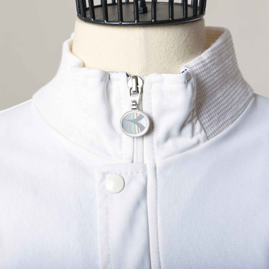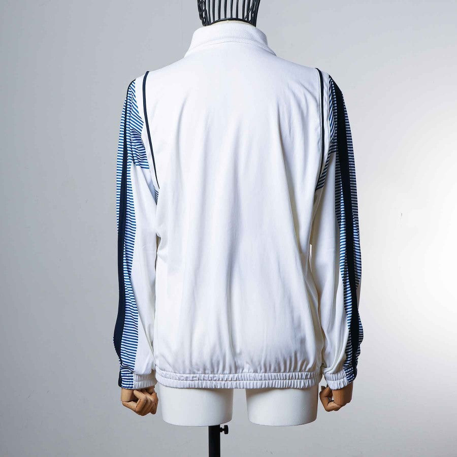 Giacca Diadora in buone condizioni, tessuto scivoloso e morbido al tatto, colori vividi, ricamo sponsor tecnico leggermente consumato dal tempo, toppa in regola e zip completamente funzionante.