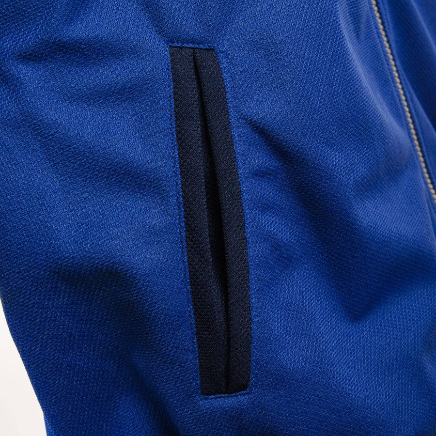 Modello tuta walk out, utilizzata dal calciatori della nazionale nei momenti pre gara. Si presenta dal colore tradizionale: l' azzurro, tonalità di un blu più scuro nelle maniche e colletto; quest'ultimo in maglina, come i polsini. La tuta è dotata di una cerniera funzionante full zip e delle tasche laterali a scomparsa con orli in blu. Frontalmente, al centro, è ricamato il lettering ITALIA, in bianco con bordini blu. Sul petto a destra in ricamo il logo dello sponsor tecnico Kappa, lato cuore è ricamato lo stemma della Nazionale italiana. Sul dorso, e lungo le maniche ripetuto il logo Kappa.