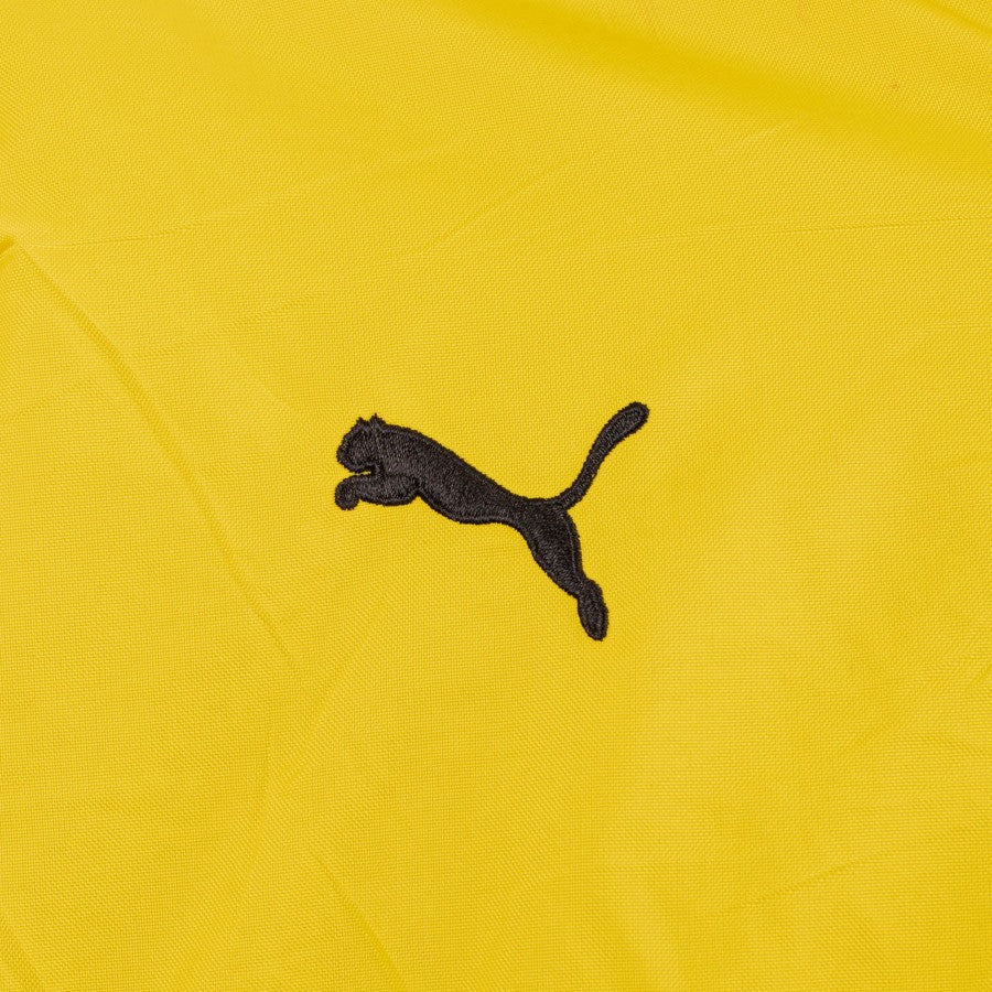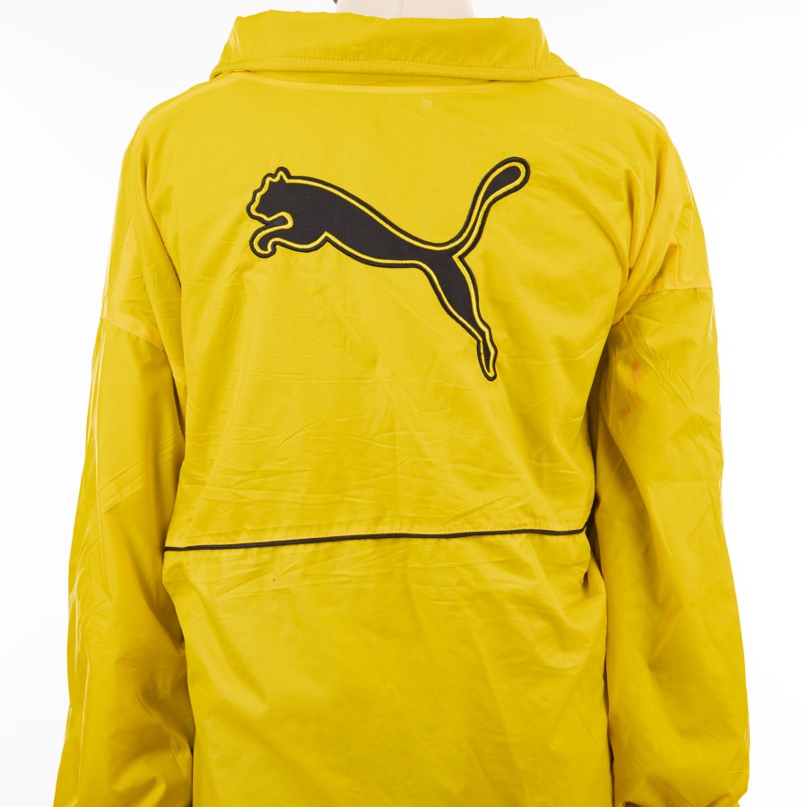 La giacca della squadra laziale con cappuccio è gialla, con cuciture nere e chiusura in full zip nera. Appena sotto il petto è presente una sottile striscia orizzontale che abbraccia l'intera circonferenza, mentre sul lato sinistro è cucito lo stemma della società sportiva e sul lato destro il logo dello sponsor tecnico Puma, in nero, che viene richiamato in formato più ampio sul retro del prodotto.