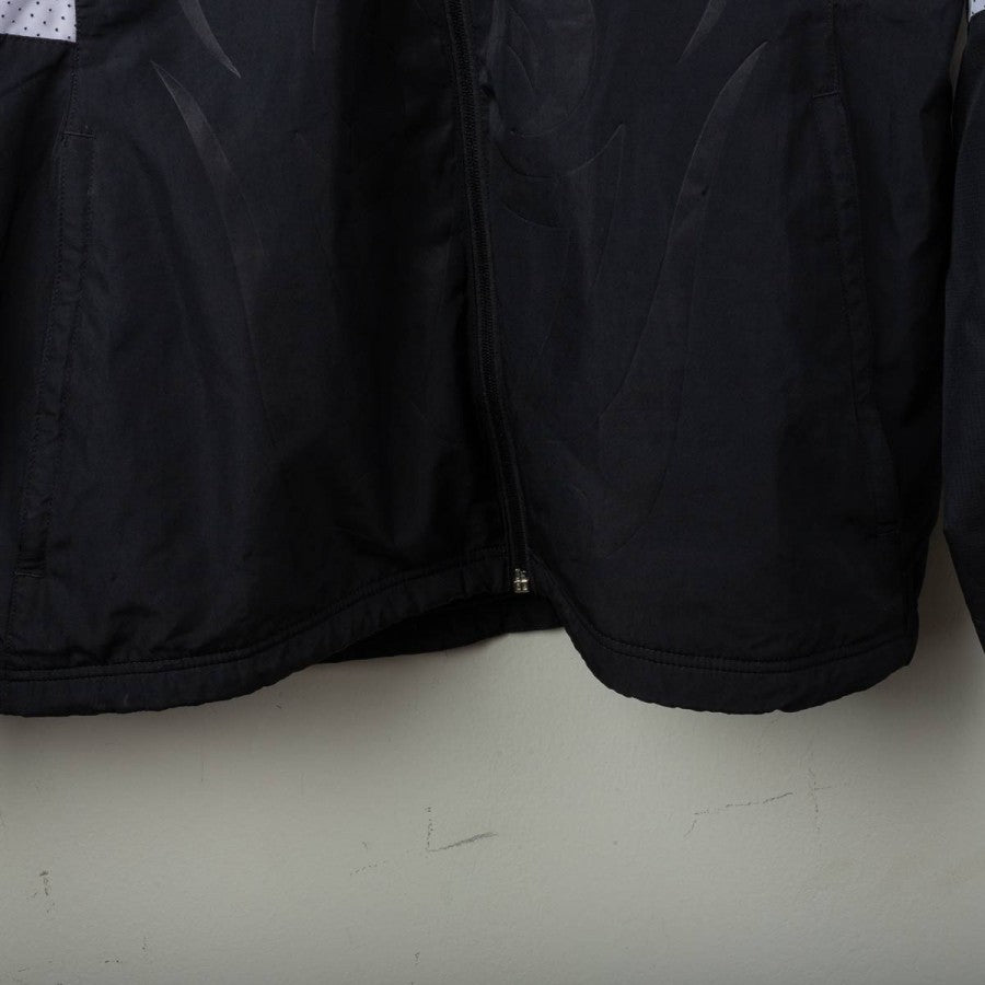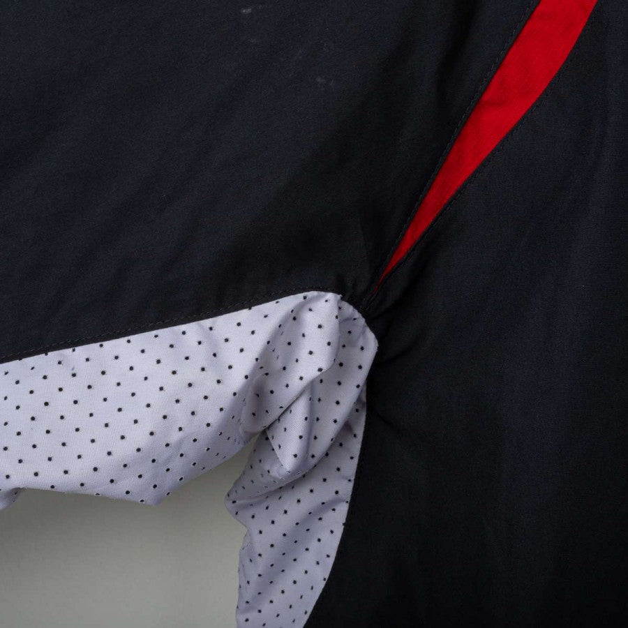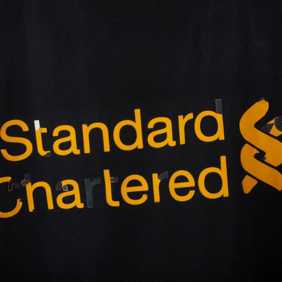 Giacca da allenamento del Liverpool indossata durante la stagione 2013/2014, prodotta da Warrior. Colore nero con inserti bianchi traforati sui fianchi e dettagli rossi. Logo Warrior e stemma L.F.C. ricamati in giallo sul petto. Sponsor Standard Chartered stampato in giallo sul retro. Motivo grafico tono su tono sul fronte. Cappuccio integrato, chiusura full zip e tasche laterali. Vestibilità comoda, taglia L. Capo originale vintage firmato Warrior, utilizzato nei training dei Reds sotto la guida di Brendan Rodgers.