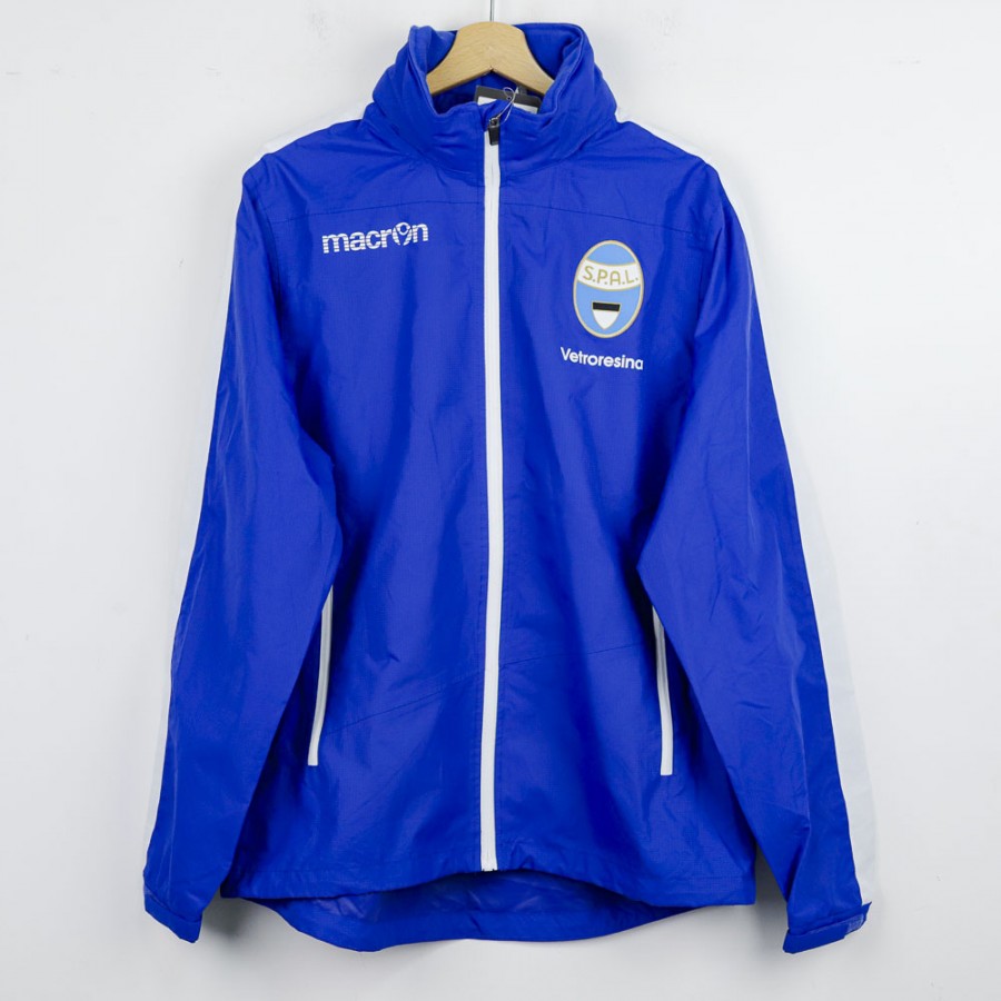Giacca ufficiale della SPAL, stagione 2018/2019, prodotta dallo sponsor tecnico Macron. Di colore blu con inserti bianchi sulle maniche, presenta lo stemma della SPAL ricamato sul lato cuore e il logo Macron sul lato destro del petto. Lo sponsor commerciale Vetroresina è stampato in bianco sotto lo stemma del club. Sul retro, si trovano il grande logo Macron e la scritta "S.P.A.L." stampati in bianco. Dotata di zip centrale e cappuccio, questa giacca è ideale per affrontare le giornate di pioggia o vento, mantenendo uno stile sportivo. La taglia di questo modello è M.