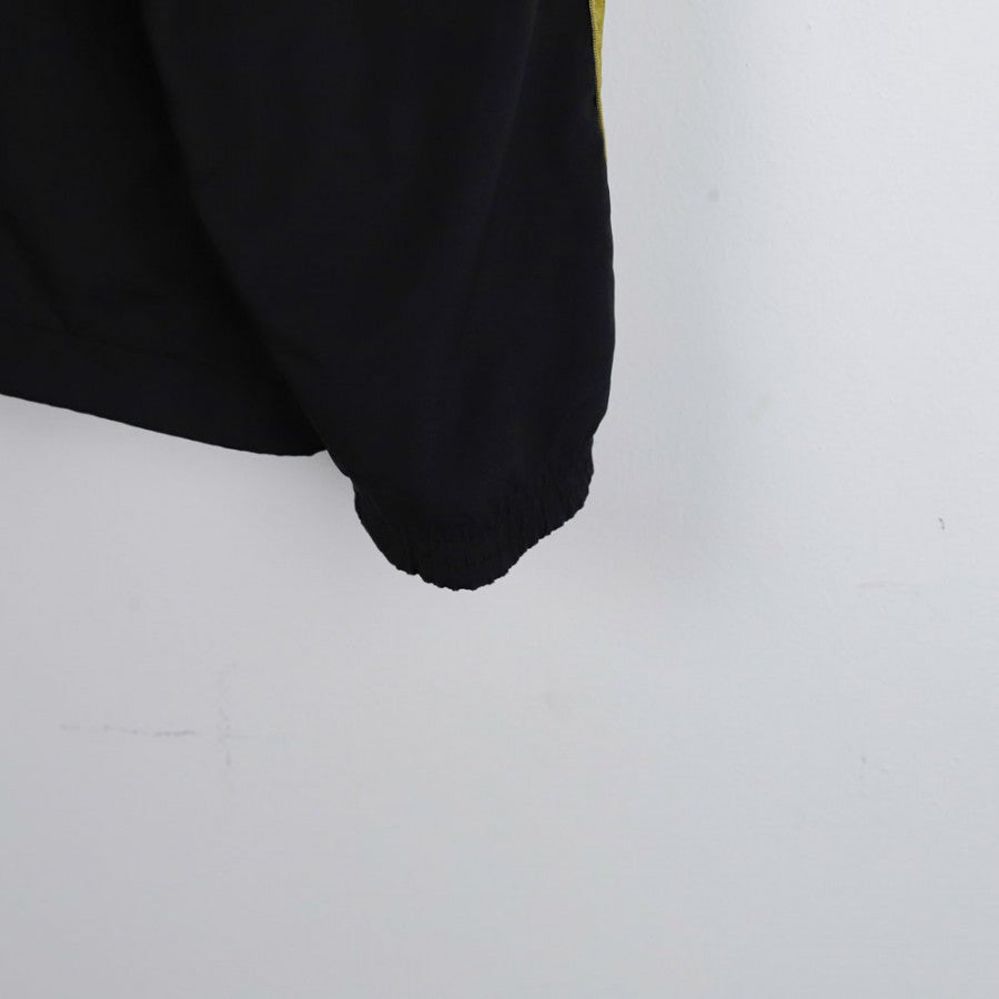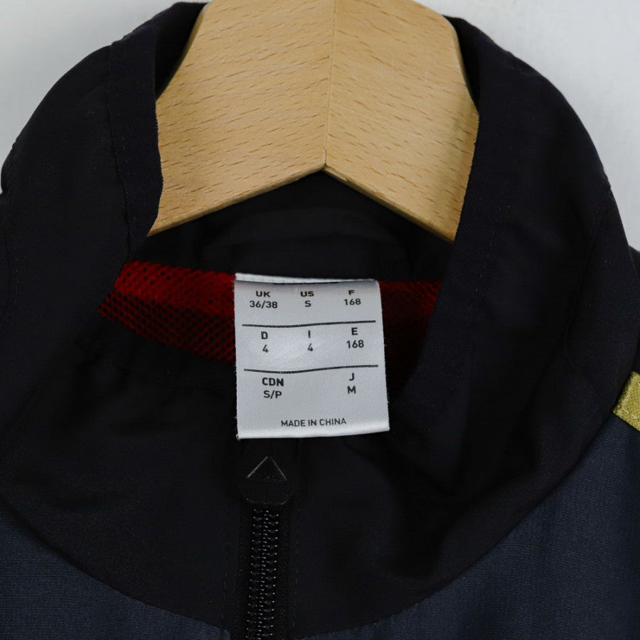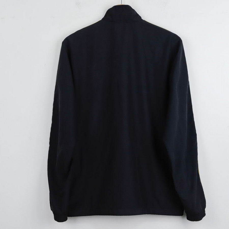 Giacca ufficiale del Milan, stagione 2013/2014, prodotta dallo sponsor tecnico Adidas. Questa giacca in tessuto tecnico è di colore nero con dettagli dorati, tra cui le iconiche tre strisce Adidas lungo le maniche. Sul petto, lo stemma del Milan è applicato a sinistra, accompagnato dal logo dello sponsor commerciale Fly Emirates. Un tocco tricolore è presente al centro, con una banda che richiama i colori della bandiera italiana. Il design elegante e sportivo rende questa giacca perfetta sia per l'uso quotidiano che per il supporto alla squadra nelle fredde giornate allo stadio.