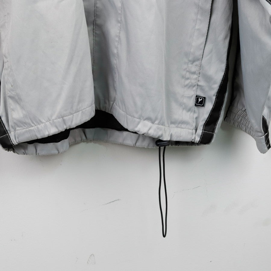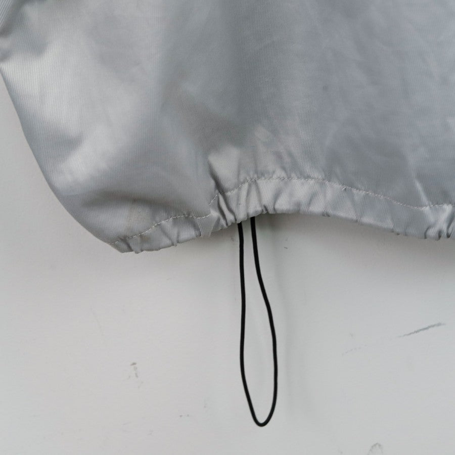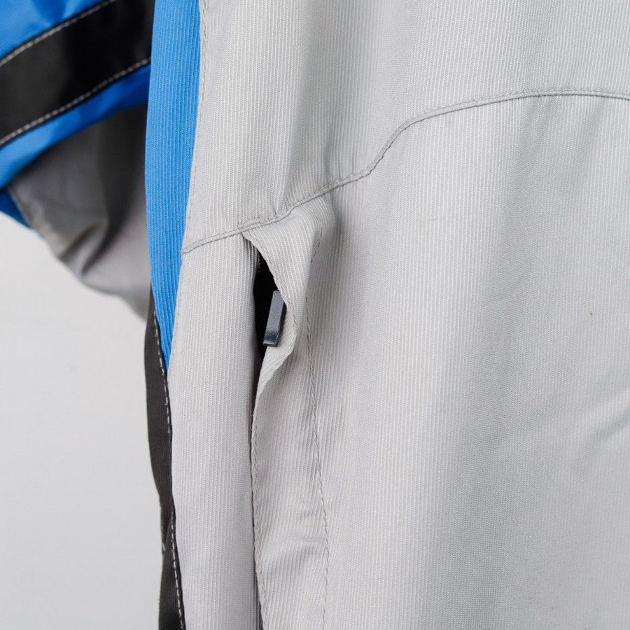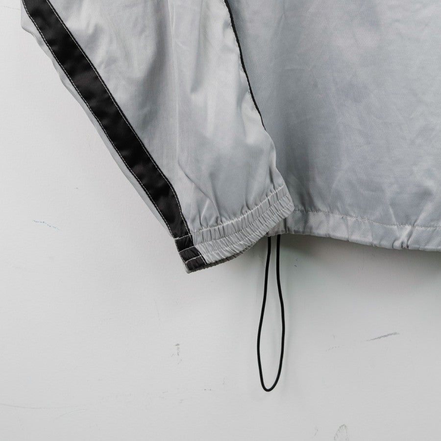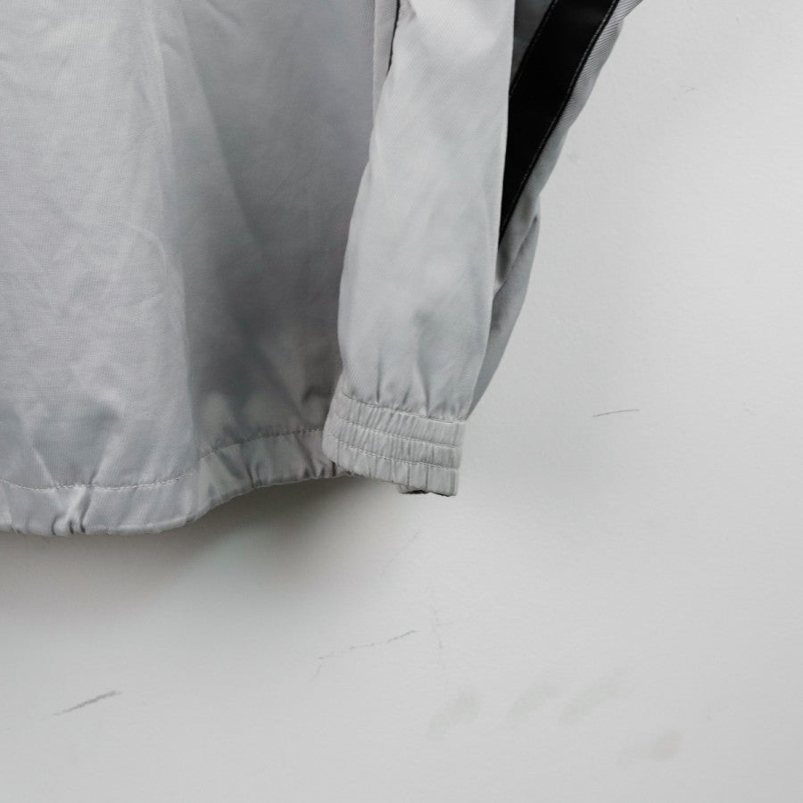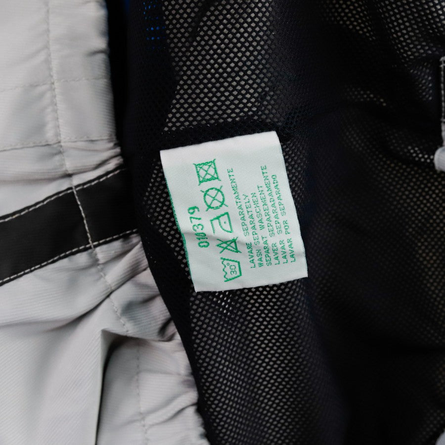 Giacca Napoli Diadora Grigia 2001/2002 in classico stile da allenamento, con taglio oversize e design bicolore grigio e azzurro. Il logo tecnico Diadora e lo stemma della Società Sportiva Calcio Napoli sono posizionati sul lato cuore e lato destro del petto, mentre sul retro la giacca rimane pulita, con un inserto nero lungo le maniche che contrasta con l'azzurro laterale. Pratica da indossare grazie alla chiusura frontale a zip e al bordo inferiore regolabile con cordino.