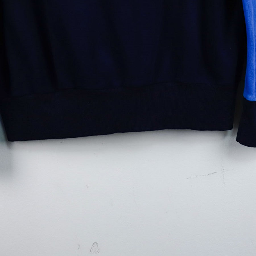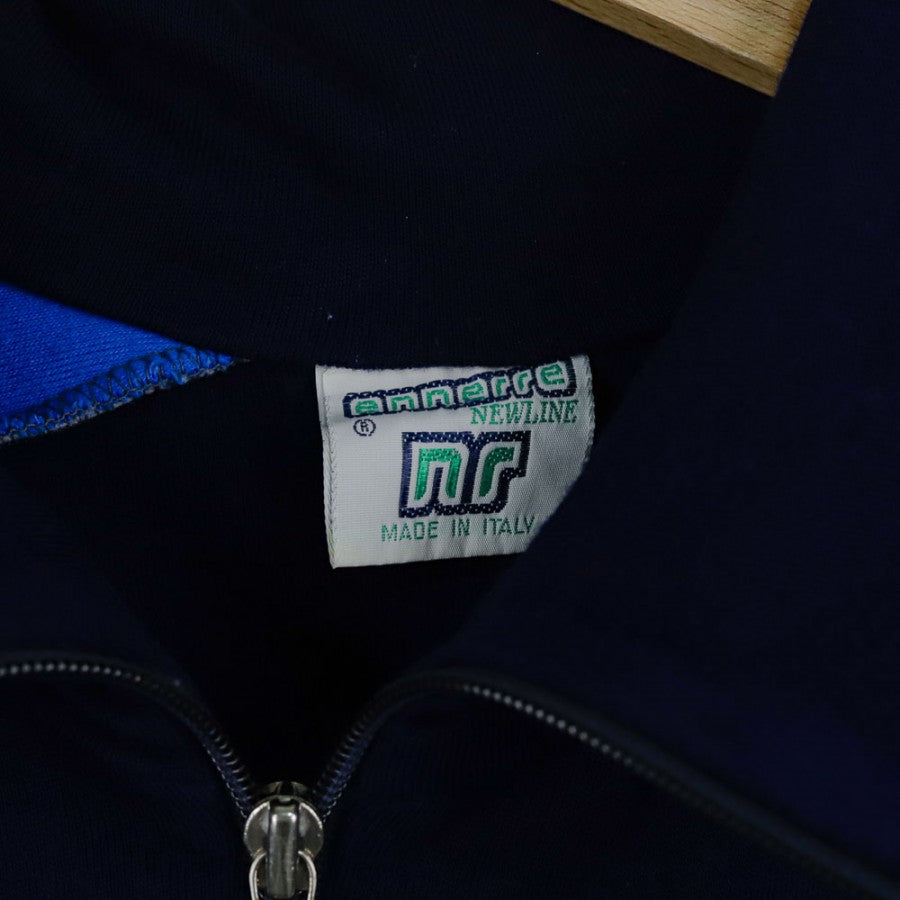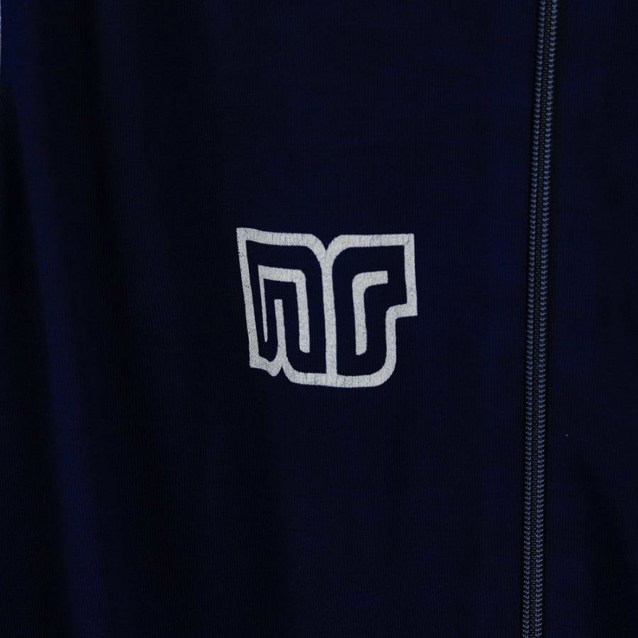 Giacca ufficiale del Napoli della stagione 1982/1983, realizzata dallo sponsor tecnico Ennerre. Questo modello storico presenta un design a zip completa con corpo blu scuro e maniche azzurre, rifinite con dettagli bianchi sulle cuciture. Sul petto, il logo Ennerre è accompagnato dallo sponsor commerciale "Cirio Napoli" ricamato in bianco, mentre sul retro campeggia il grande logo "Cirio". La giacca rappresenta uno stile iconico degli anni '80 e riflette l'identità visiva del Napoli durante quella stagione.