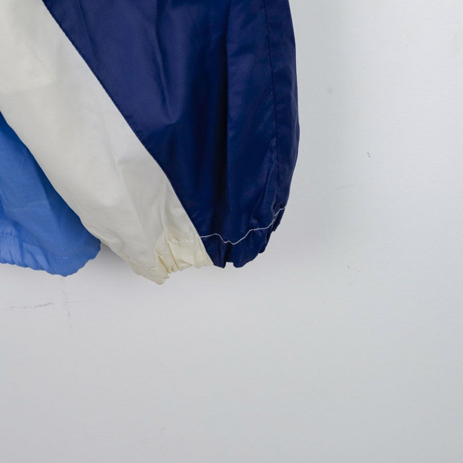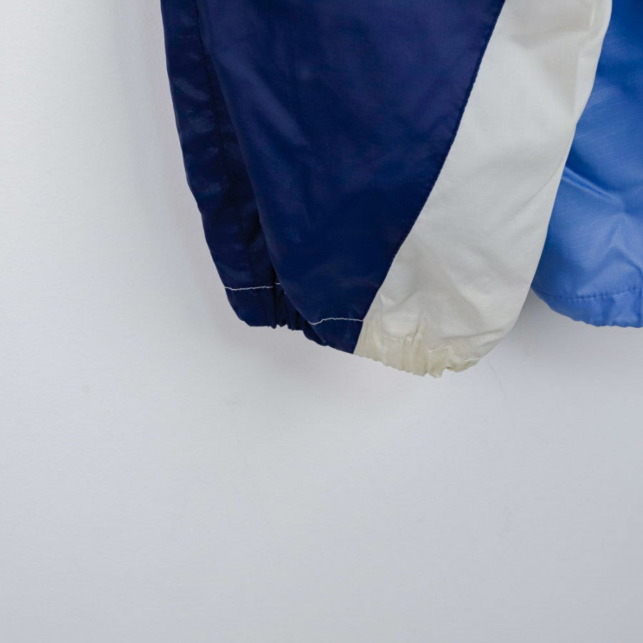 Giacca ufficiale del Napoli, stagione 1993/1994, realizzata dallo sponsor tecnico Umbro. Il design, tipico degli anni '90, combina tonalità di azzurro, blu navy e bianco con un motivo geometrico audace. Sul lato cuore è ricamato lo stemma ufficiale del club, mentre il logo Umbro è presente sia sul petto destro che sulla schiena in formato oversize. La giacca è dotata di cappuccio integrato, chiusura a zip, tasche frontali e interno in mesh traspirante. La taglia è XL, perfetta per collezionisti e tifosi che desiderano un capo autentico e iconico della storia partenopea.