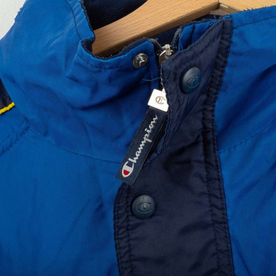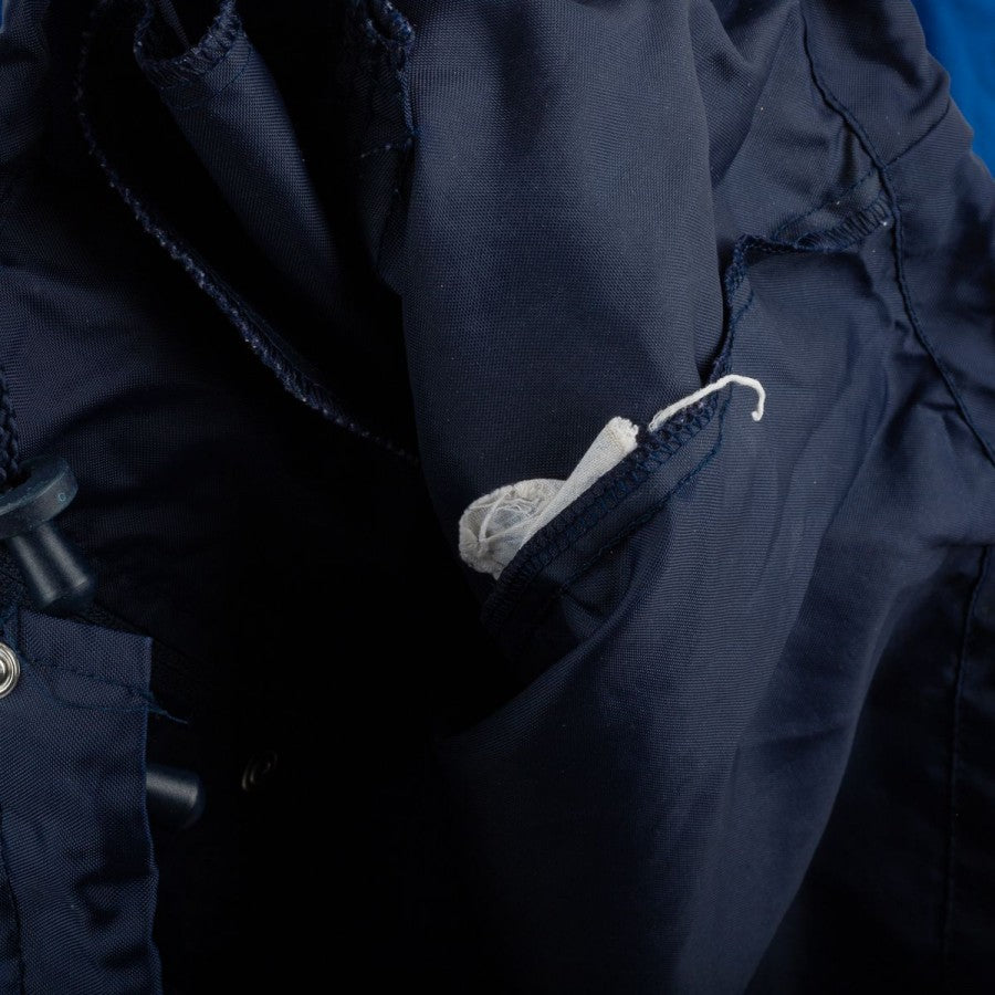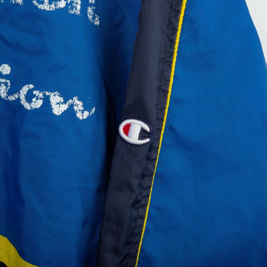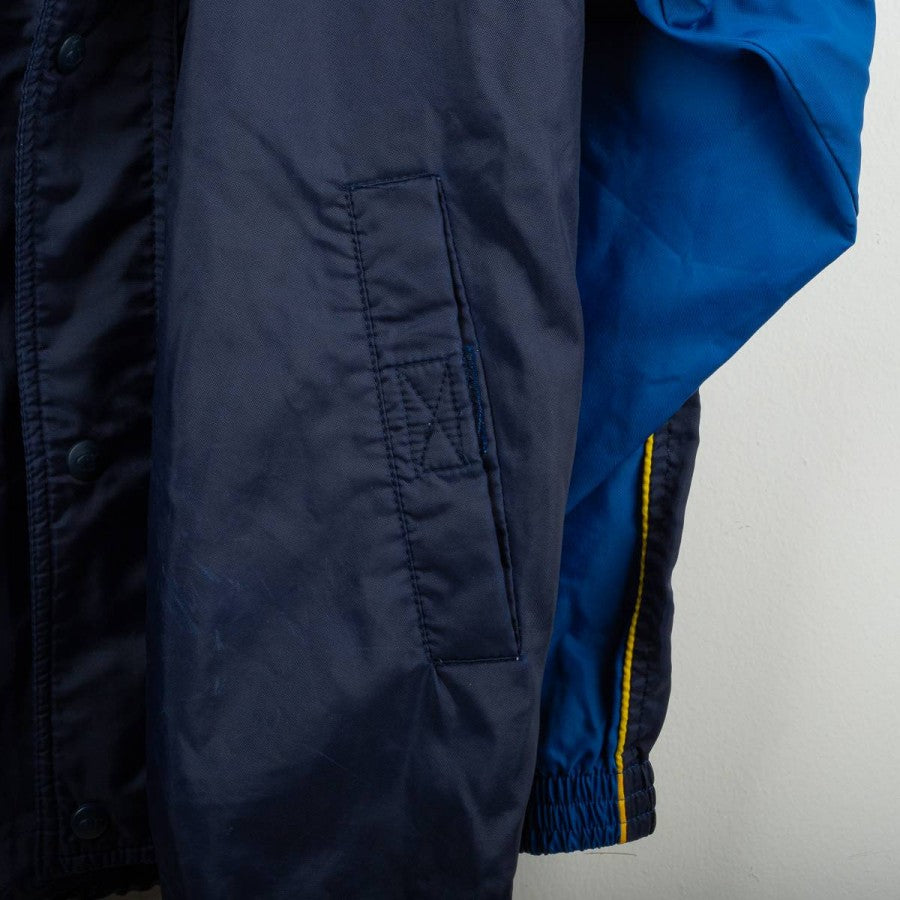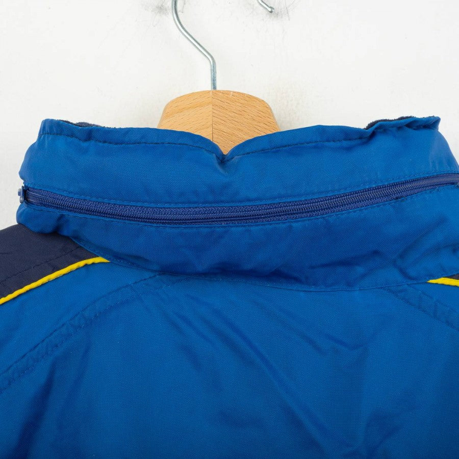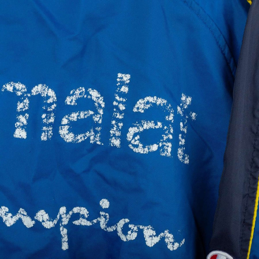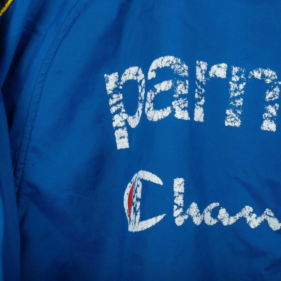 Giacca vintage del Parma realizzata da Champion per la stagione 2000/2001. Modello full zip con chiusura a bottoni, coulisse regolabile e tasche laterali. Colore blu con dettagli gialli e navy. Logo Parma A.C. e sponsor commerciale Parmalat ricamati sul petto, con ulteriore sponsor Mr.Day lato cuore. Logo Champion ricamato sulle maniche. Sul retro grande scritta “Parmalat” e “Champion”. Vestibilità comoda. Taglia XL.