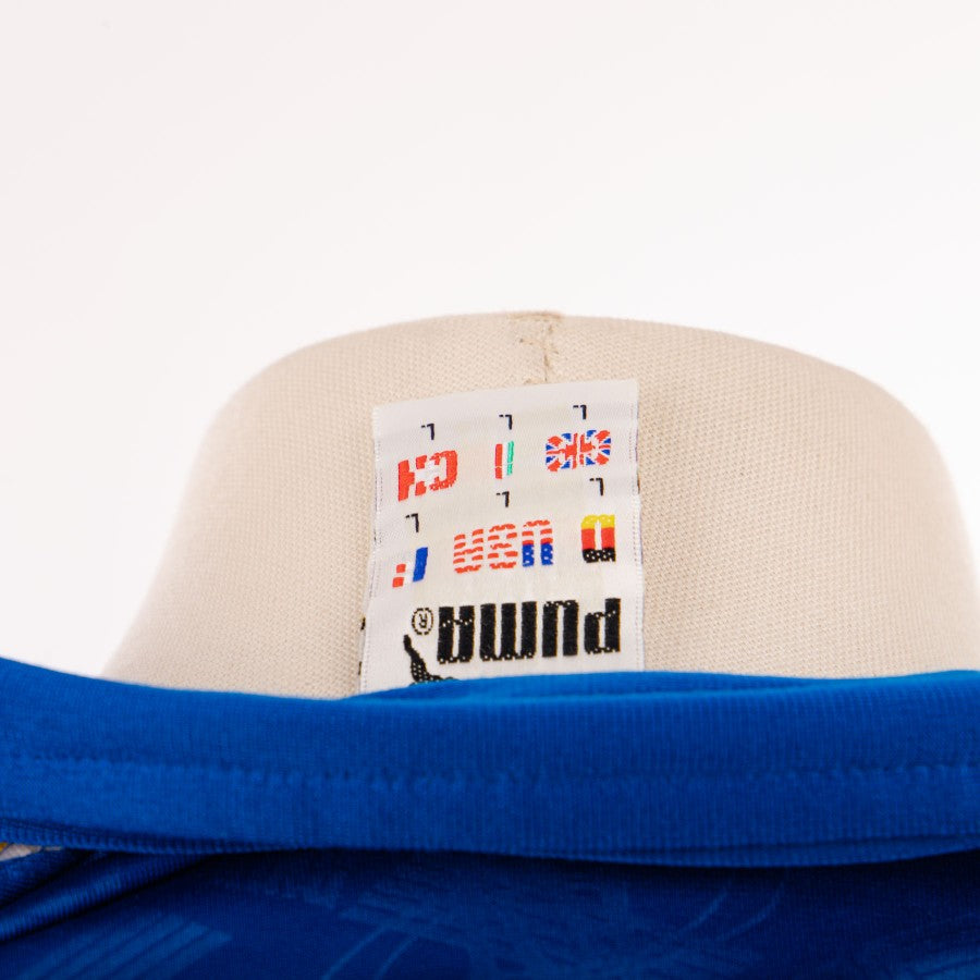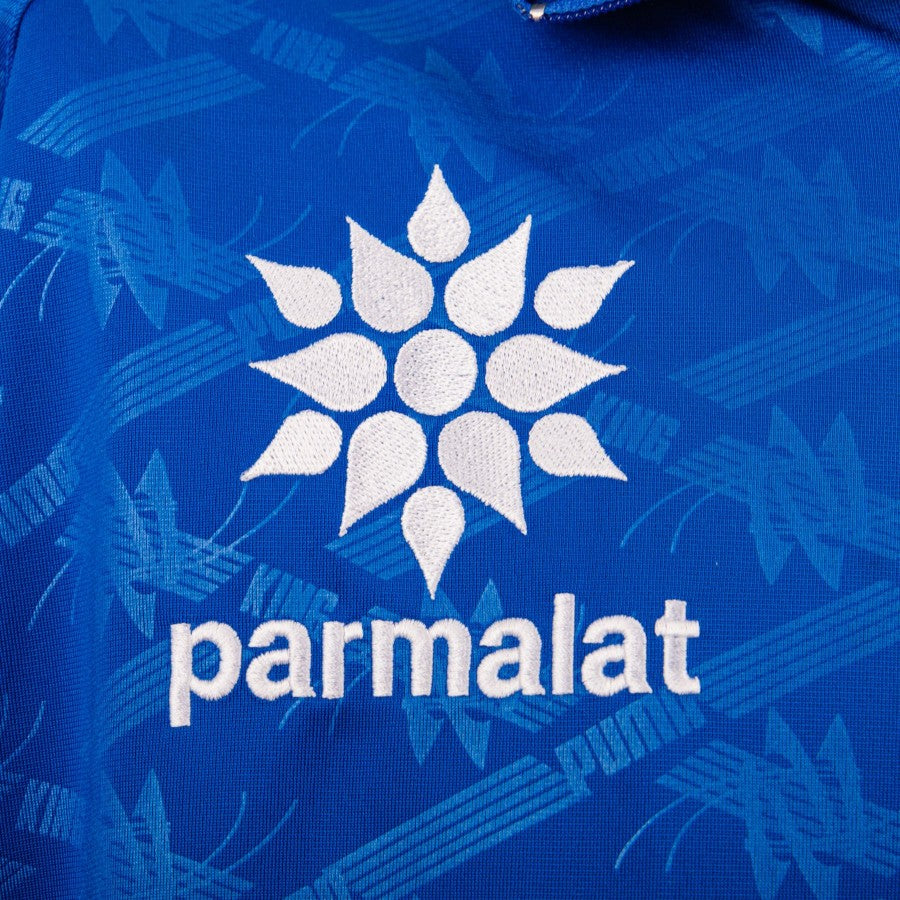 Stemma della società sportiva cucito sul lato cuore, unitamente al marchio dello sponsor tecnico Puma king, con logo in oro, e marchio dello sponsor commerciale Parmalat, in bianco, applicato sul lato destro. Marchio Puma king richiamato, in bianco, anche sul colletto.