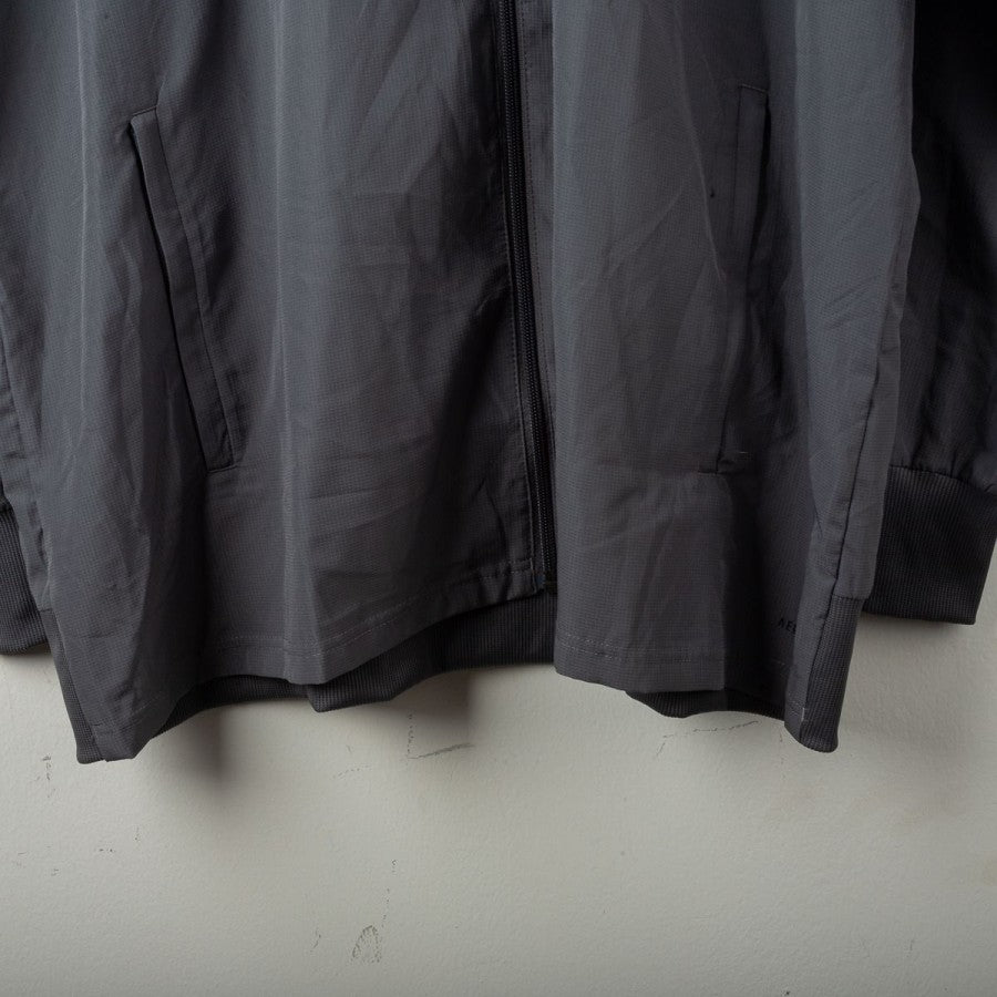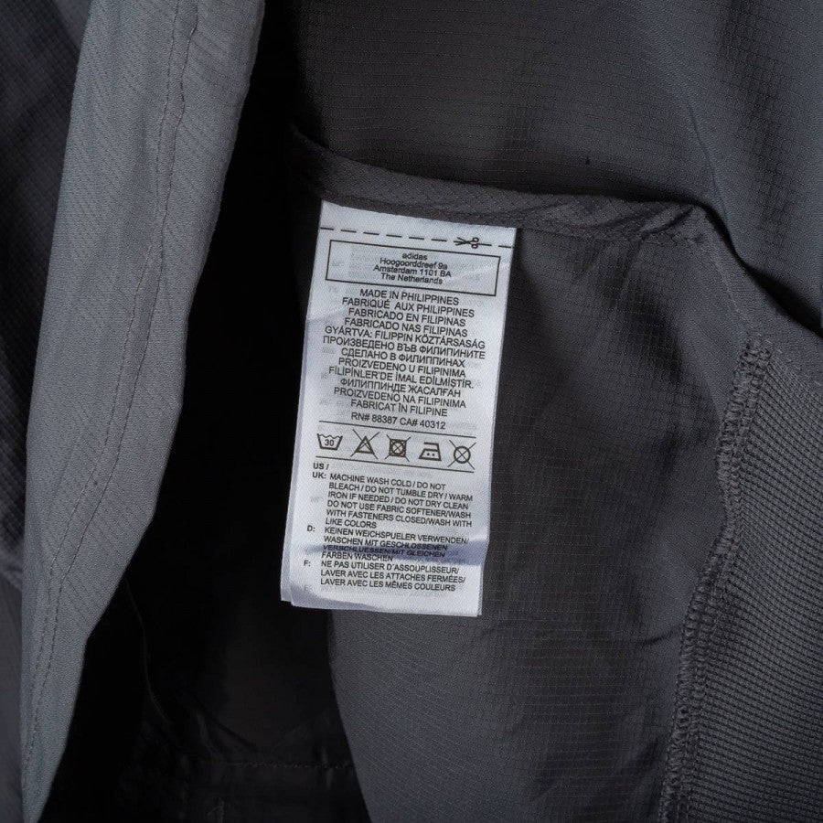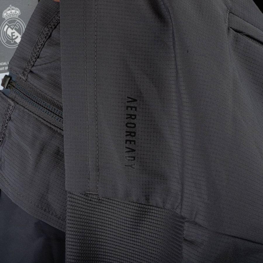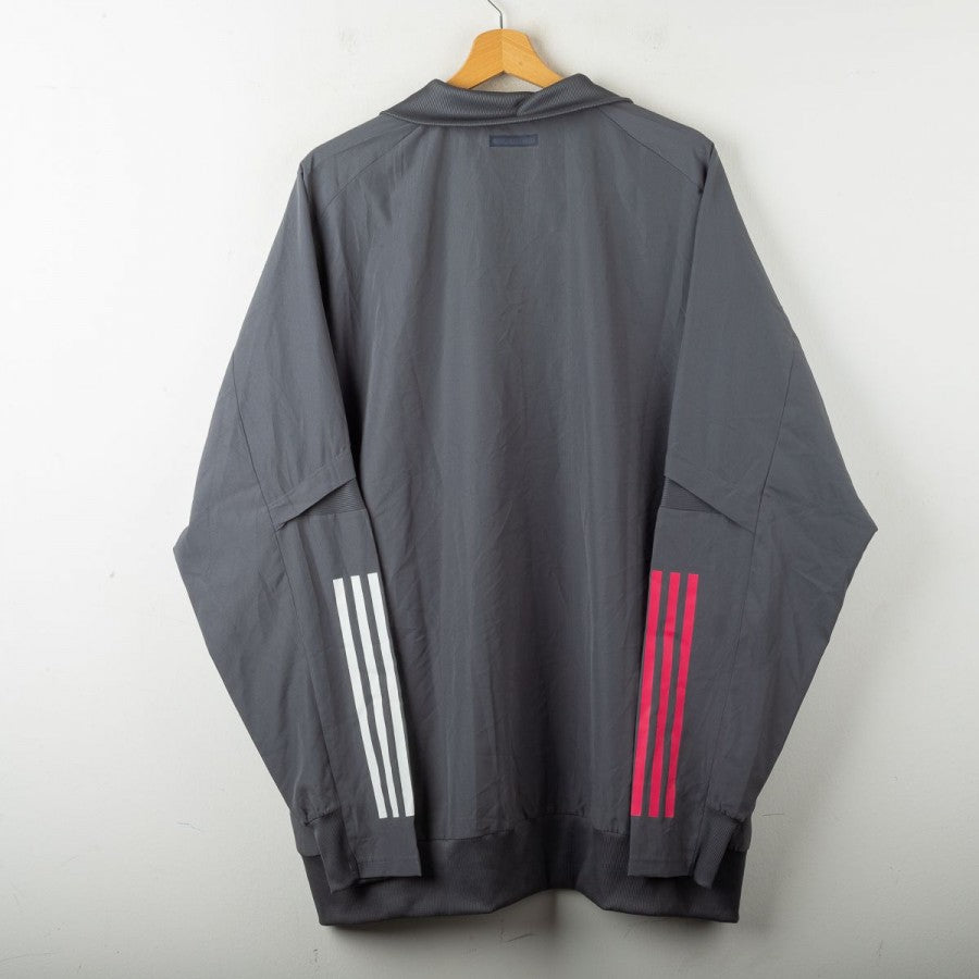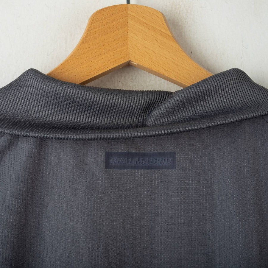 Giacca ufficiale del Real Madrid per la stagione 2020/2021, realizzata da Adidas. Il modello è caratterizzato da una colorazione grigio scuro con dettagli a contrasto: le tre strisce Adidas in rosa sul braccio sinistro e in bianco su quello destro. Sul petto sono presenti lo stemma del club in grigio chiaro e il logo Adidas in rosa. Chiusura a zip integrale, tasche laterali e taglio sportivo. Taglia 2XL.