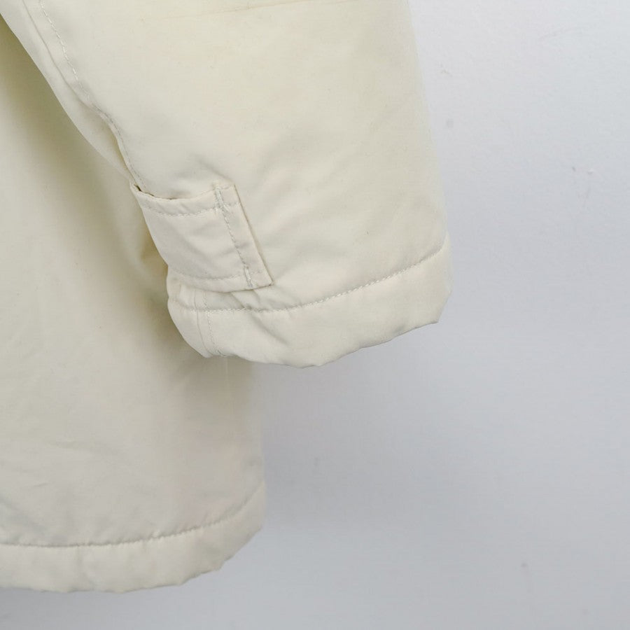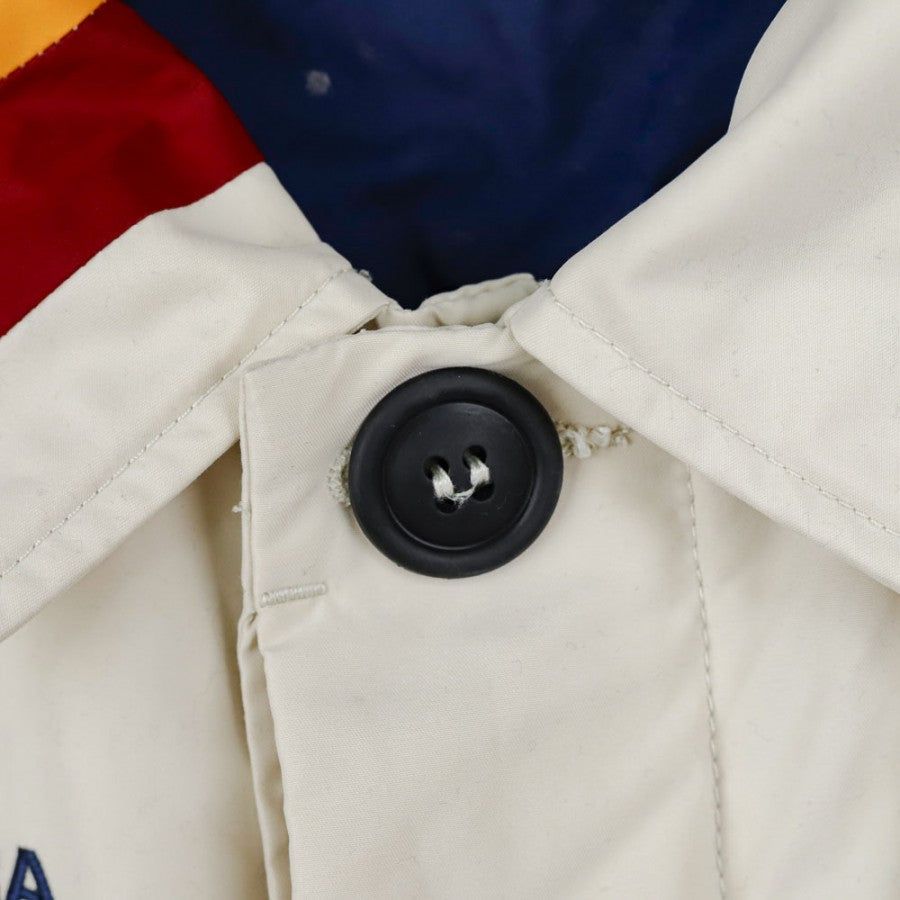 Giacca ufficiale della AS Roma per la stagione 2003/2004, prodotta da Diadora. Questa giacca, di colore beige, presenta un design semplice e funzionale, con il logo Diadora ricamato sul petto a destra e lo stemma della Roma, con la tradizionale lupa capitolina, applicato su entrambe le maniche. Il colletto alto offre protezione e comfort, mentre all'interno è presente una fodera blu. Sul retro, al centro, è presente un piccolo logo Diadora giallo e nero, insieme alla scritta "a. roma" per enfatizzare l'identità del club.