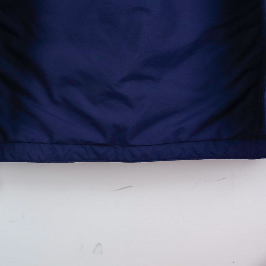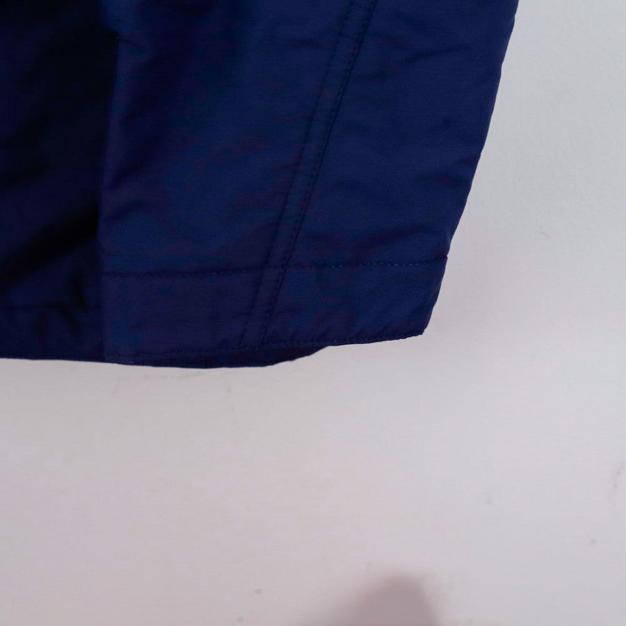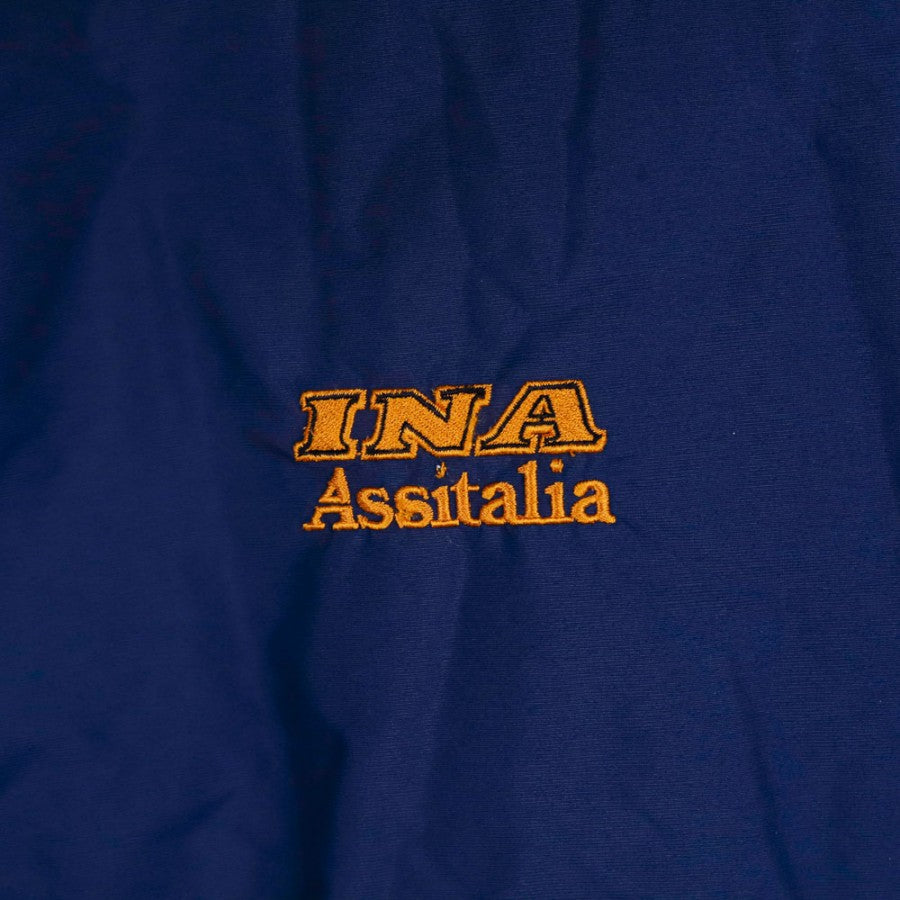 Giacca ufficiale della AS Roma per la stagione 2000/2001, prodotta dallo sponsor tecnico Kappa. Il capo, realizzato in tessuto tecnico di colore blu, presenta il logo Kappa ricamato su entrambe le maniche e sul petto, accompagnato dallo stemma della Roma lato cuore. Sul retro spicca il logo dello sponsor commerciale INA Assitalia in arancione, conferendo un ulteriore elemento distintivo. Dotata di cappuccio regolabile e chiusura con zip integrale, questa giacca è ideale per i tifosi giallorossi che vogliono possedere un pezzo di storia del club. La taglia è L.