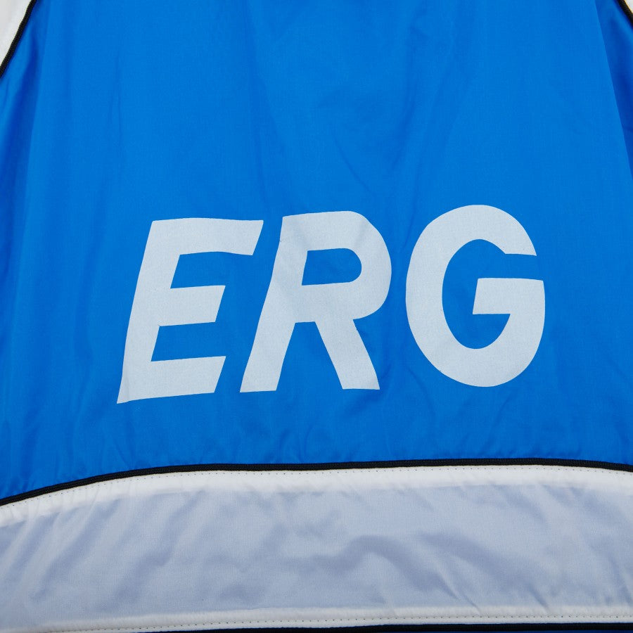 Sul retro, oltre al cappuccio, ritroviamo le bande bianche oblique e quella orizzontale già viste nella sezione anteriore della giacca; inoltre, in grandi dimensioni, compare la dicitura in colore bianco di ERG.