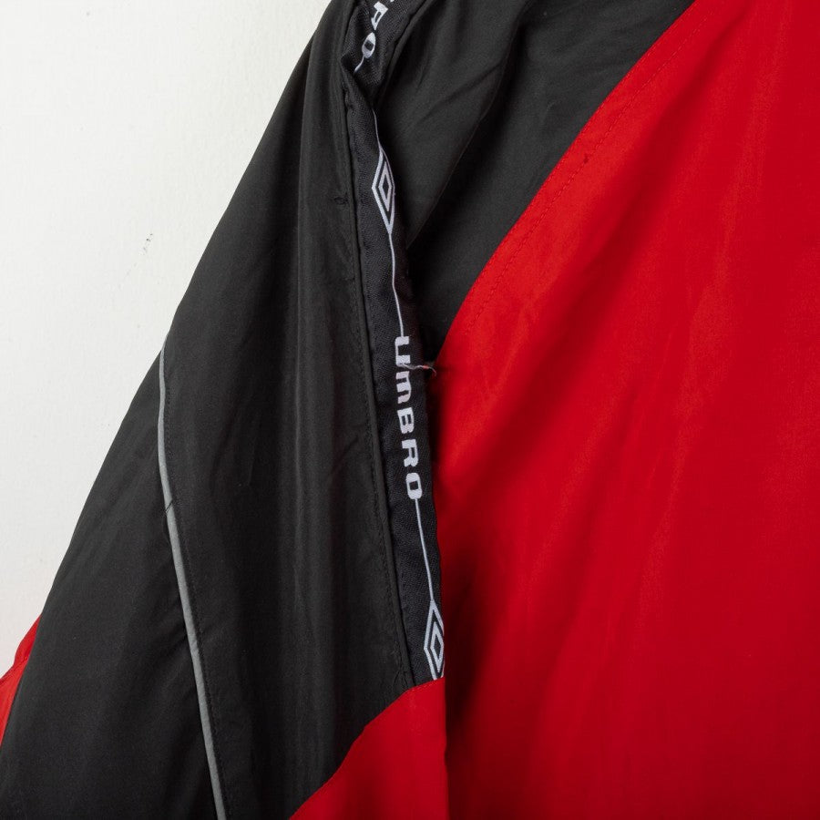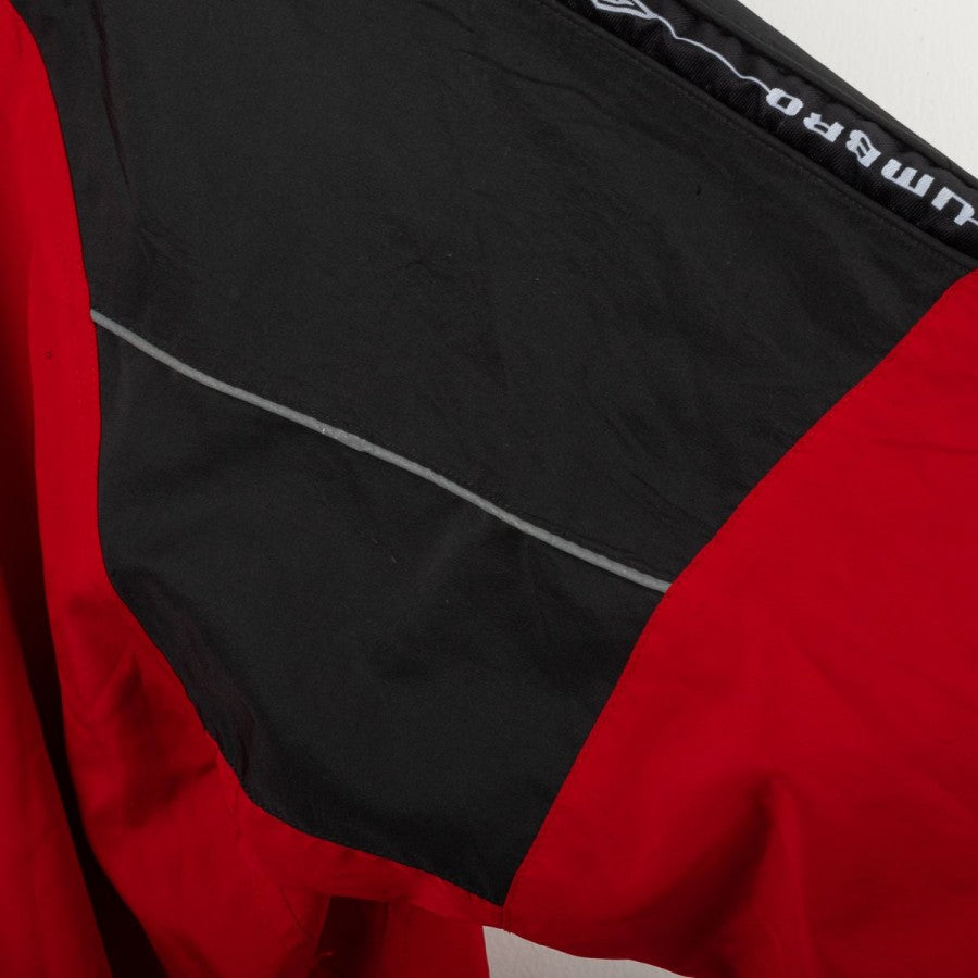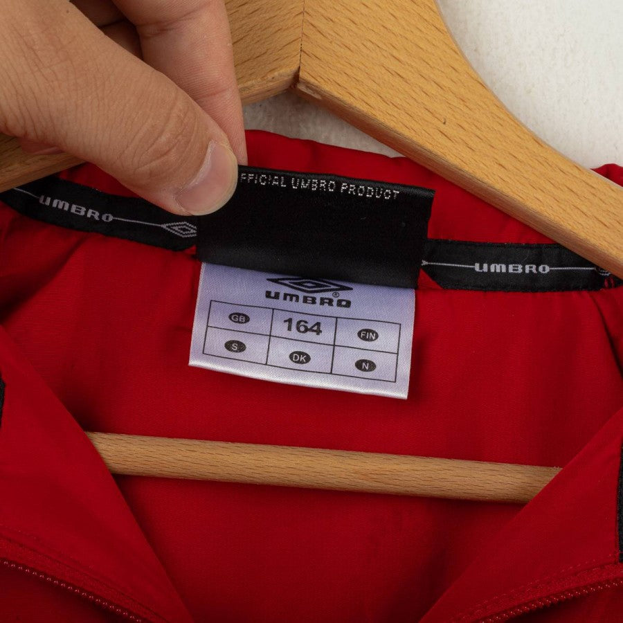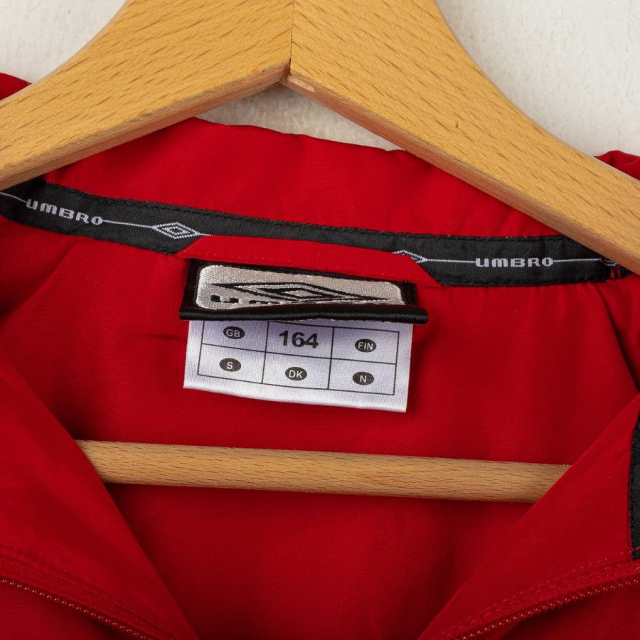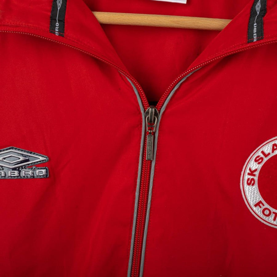 Giacca ufficiale da allenamento dello Slavia Praga, stagione 2007/2008, prodotta da Umbro. Colore rosso con inserti neri su spalle e maniche, piping riflettente grigio e loghi Umbro ricamati. Stemma del club cucito lato cuore, zip frontale integrale con cursore marchiato. Tasche laterali con chiusura a zip, polsini e fondo con elastico regolabile. Taglia S (vestibilità 164 cm).