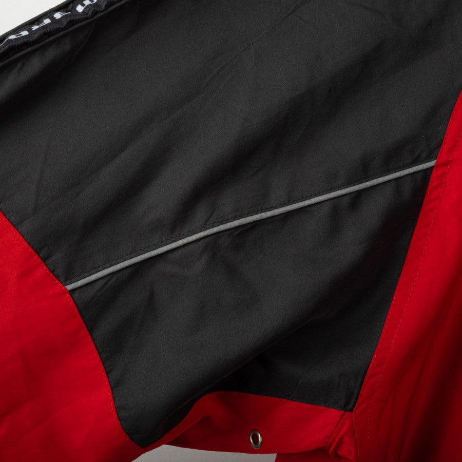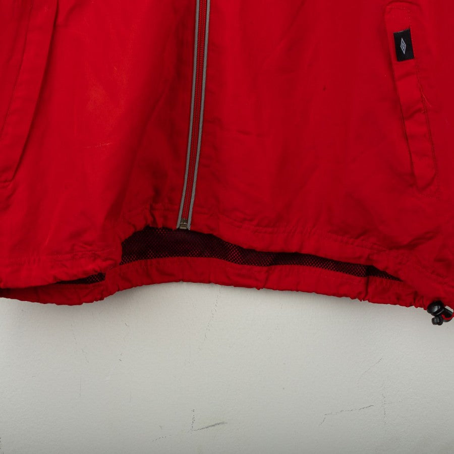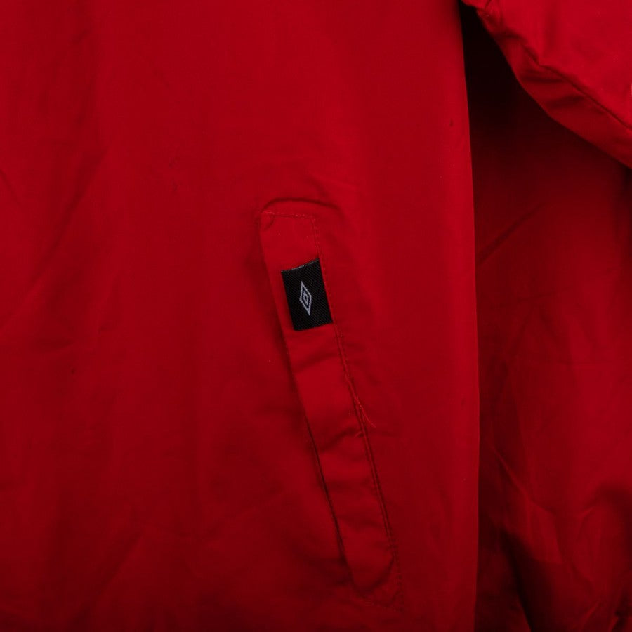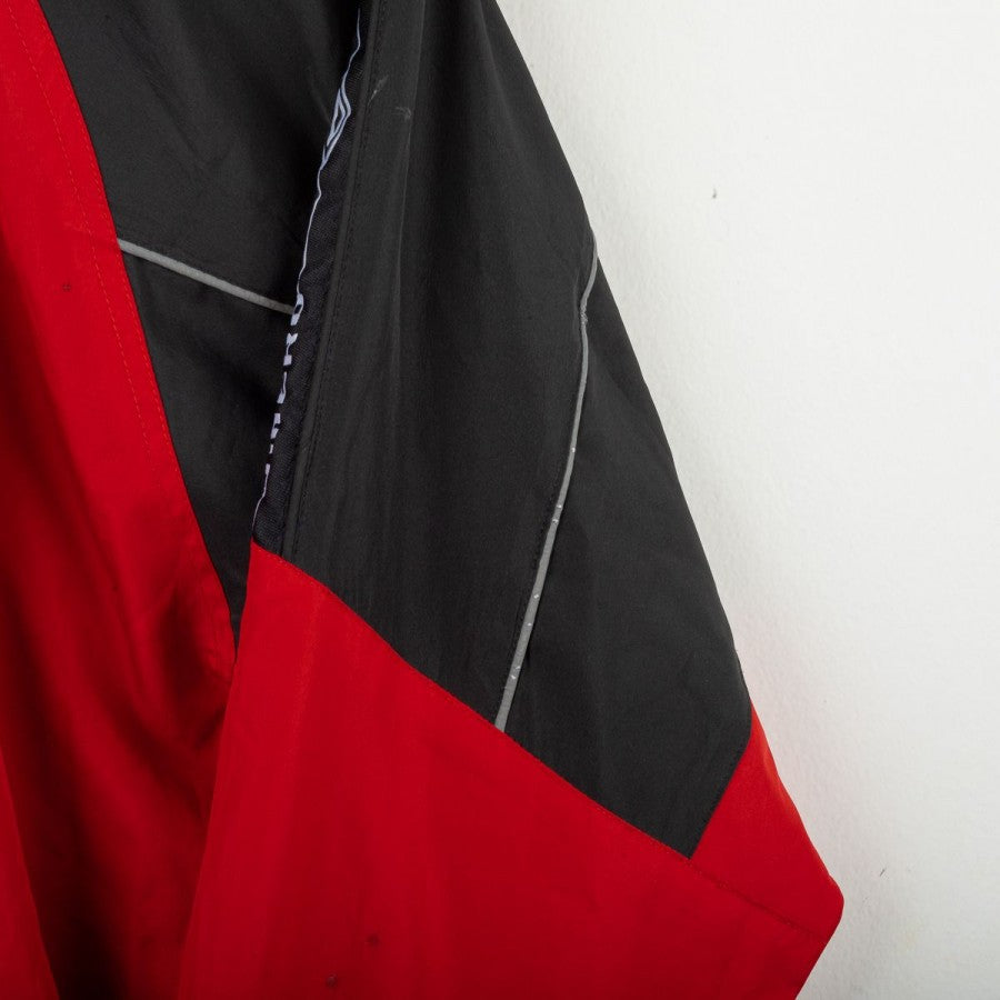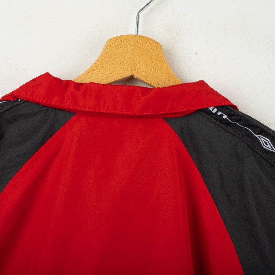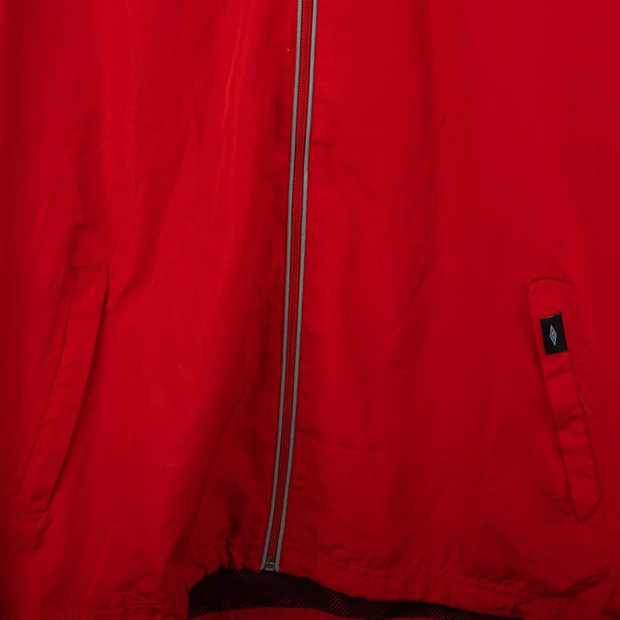 Giacca ufficiale da allenamento dello Slavia Praga, stagione 2007/2008, prodotta da Umbro. Colore rosso con inserti neri su spalle e maniche, piping riflettente grigio e loghi Umbro ricamati. Stemma del club cucito lato cuore, zip frontale integrale con cursore marchiato. Tasche laterali con chiusura a zip, polsini e fondo con elastico regolabile. Taglia S (vestibilità 164 cm).