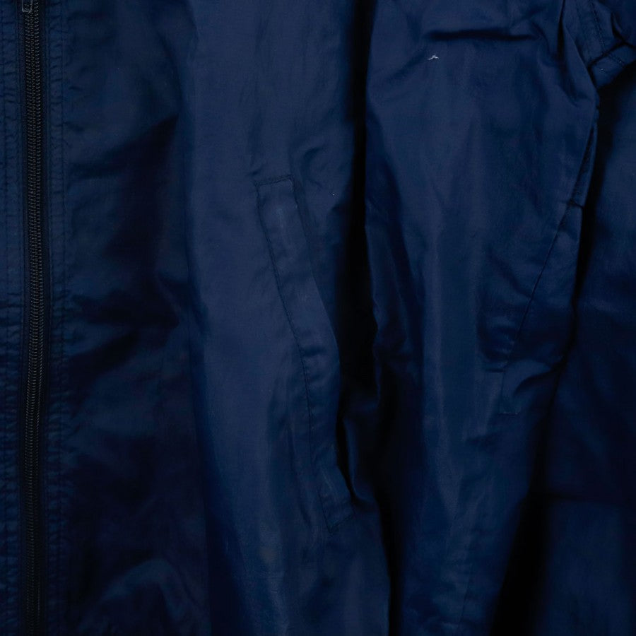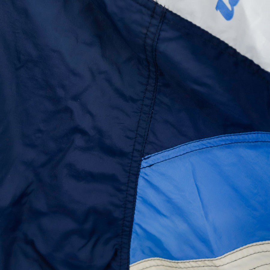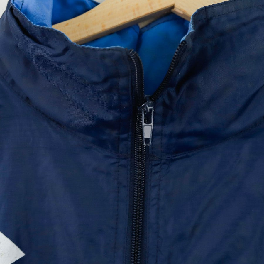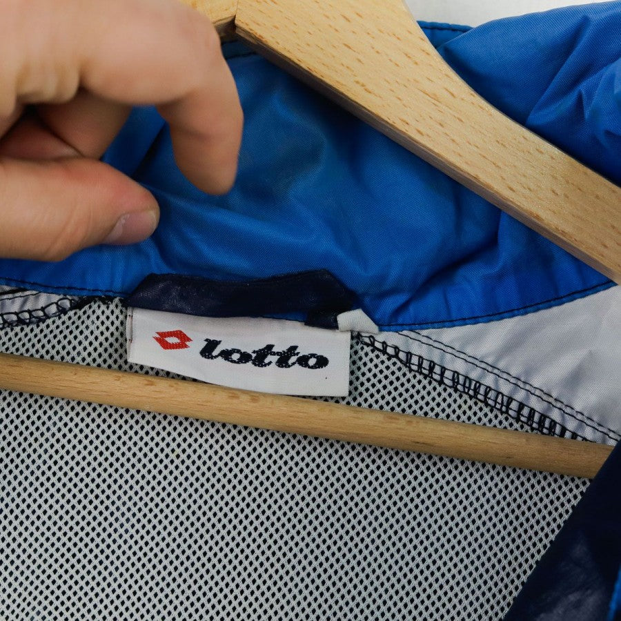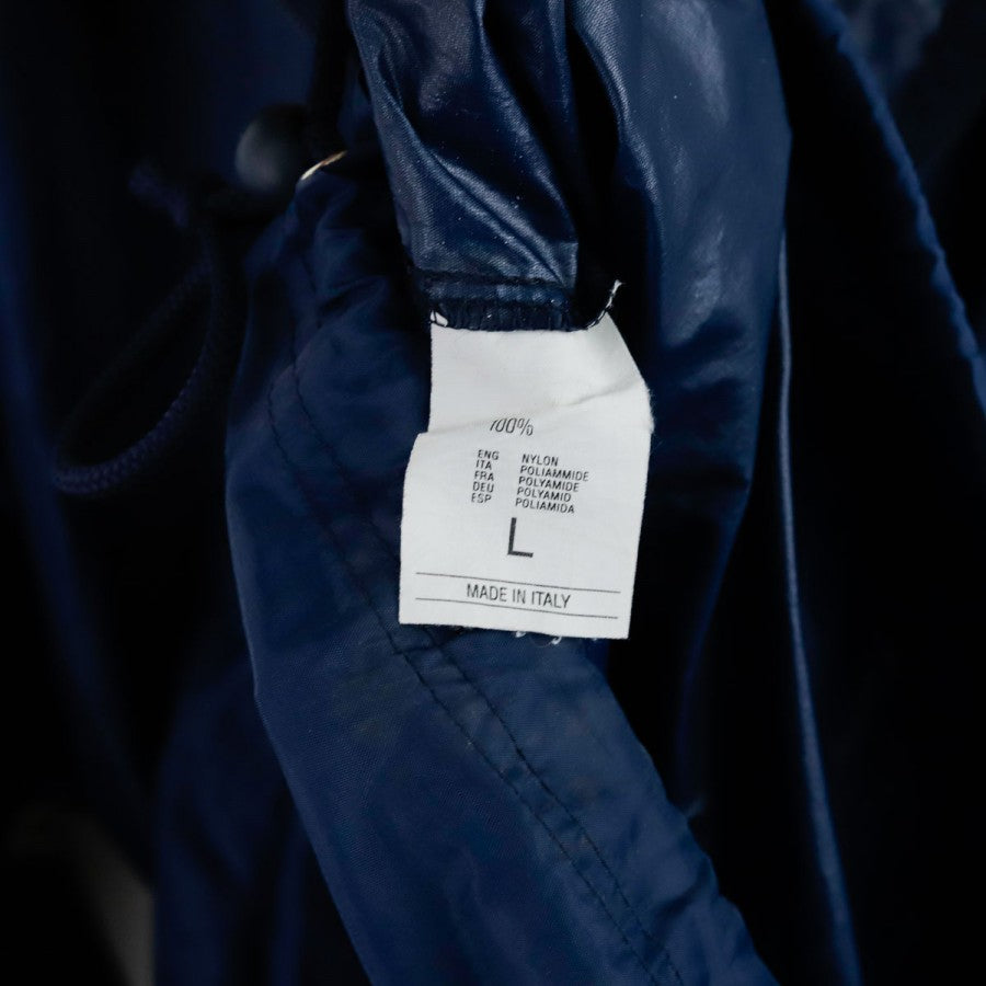 Giacca SSC Napoli Lotto Centrale del Latte 1996/1997, realizzata da Lotto per la stagione 1996/1997. Il design classico anni '90 è caratterizzato da una base blu con inserti azzurri e bianchi. Sul petto sono presenti il logo Lotto e lo stemma del club, mentre sul retro spicca lo storico sponsor "Centrale Latte di Napoli" ricamato. Il capo è dotato di zip integrale, cappuccio nascosto nel colletto e coulisse regolabile. Un capo vintage rappresentativo di un'epoca iconica del calcio italiano.