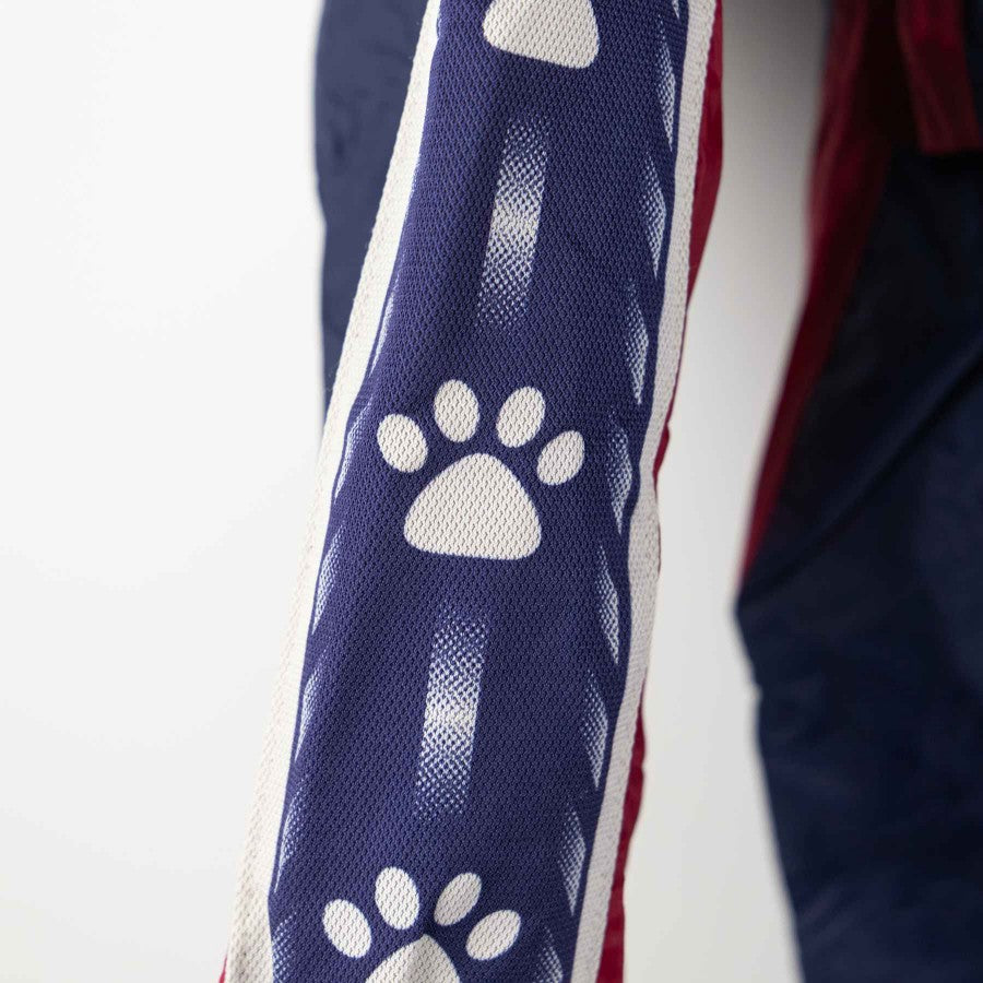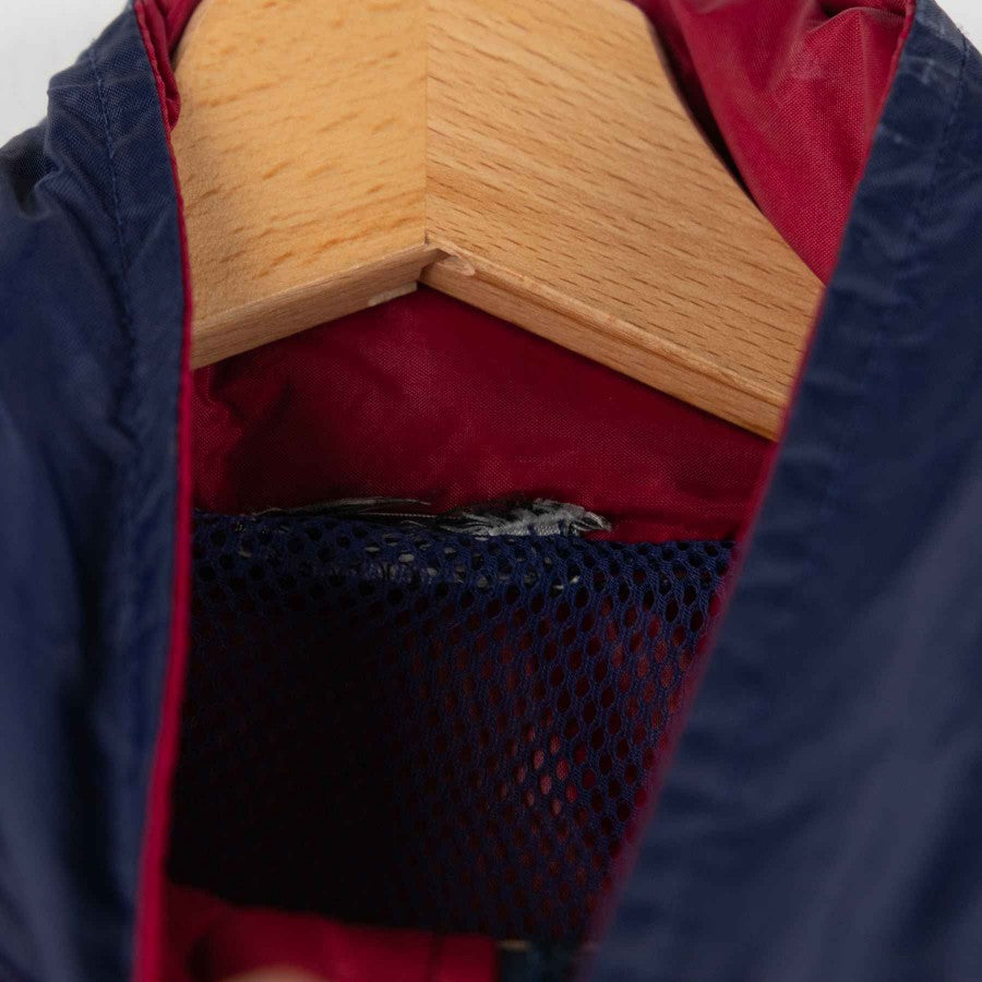 Il giaccone è di colore granata, con inserti in blu e grigio sulle spalle. Tasche laterali e chiusura centrale in zip blu.