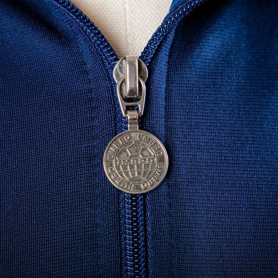 Giacca da tuta dell'Inter della collezione 1997/1998. Modello full zip di colore blu con inserti bianchi. Sulla parte frontale sono ricamati la patch dell'inter, lo sponsor commerciale Pirelli ed il logo dello sponsor tecnico Umbro. È inoltre completa di comode tasche laterali con zip. Sul retro ritroviamo applicati sponsor tecnico e sponsor commerciale.