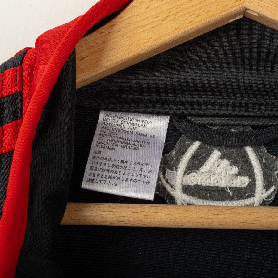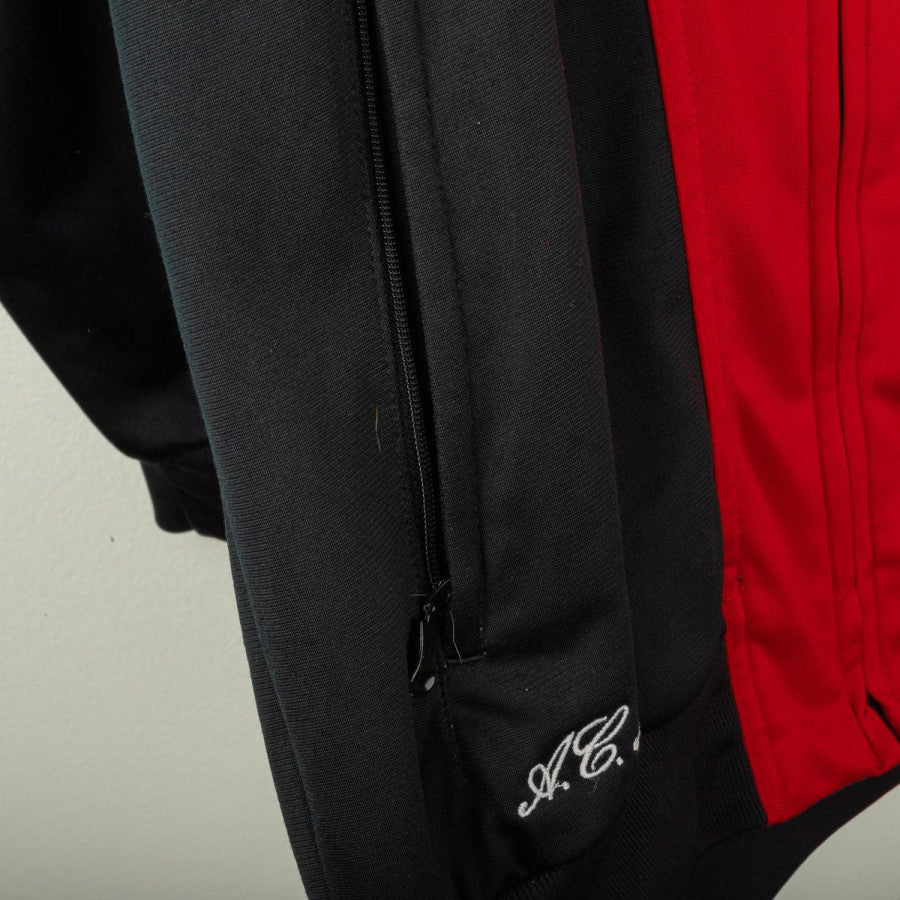 Giacca da tuta del Milan utilizzata nella stagione 2004/2005, prodotta da Adidas. Colore rosso e nero con inserti a contrasto e tre strisce rosse sulle maniche. Logo Adidas ricamato sul petto destro, stemma del club cucito lato cuore con stella gialla superiore e sponsor Opel ricamato al centro. Sul retro, grandi loghi Opel e Adidas stampati in bianco. Chiusura a zip integrale e tasche laterali con zip. Polsini e fondo elasticizzati. Taglia L.