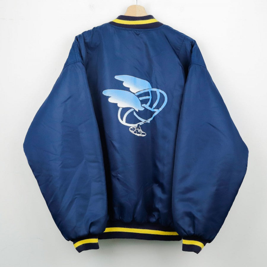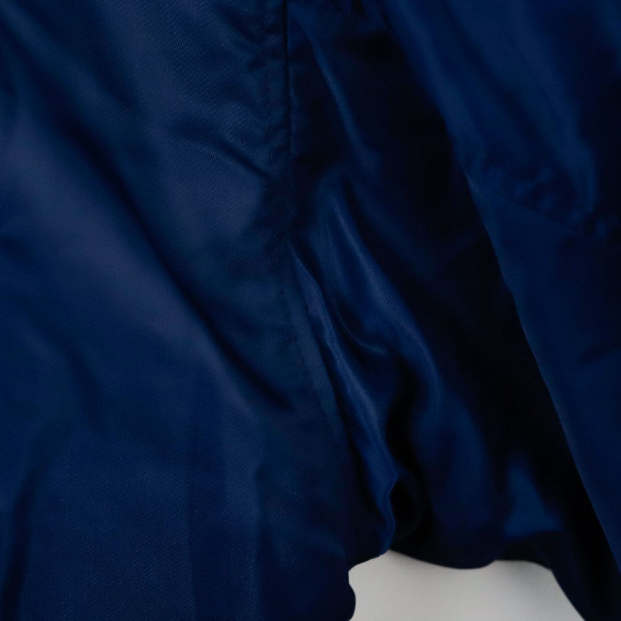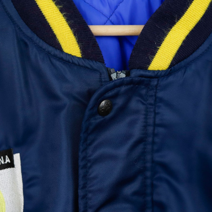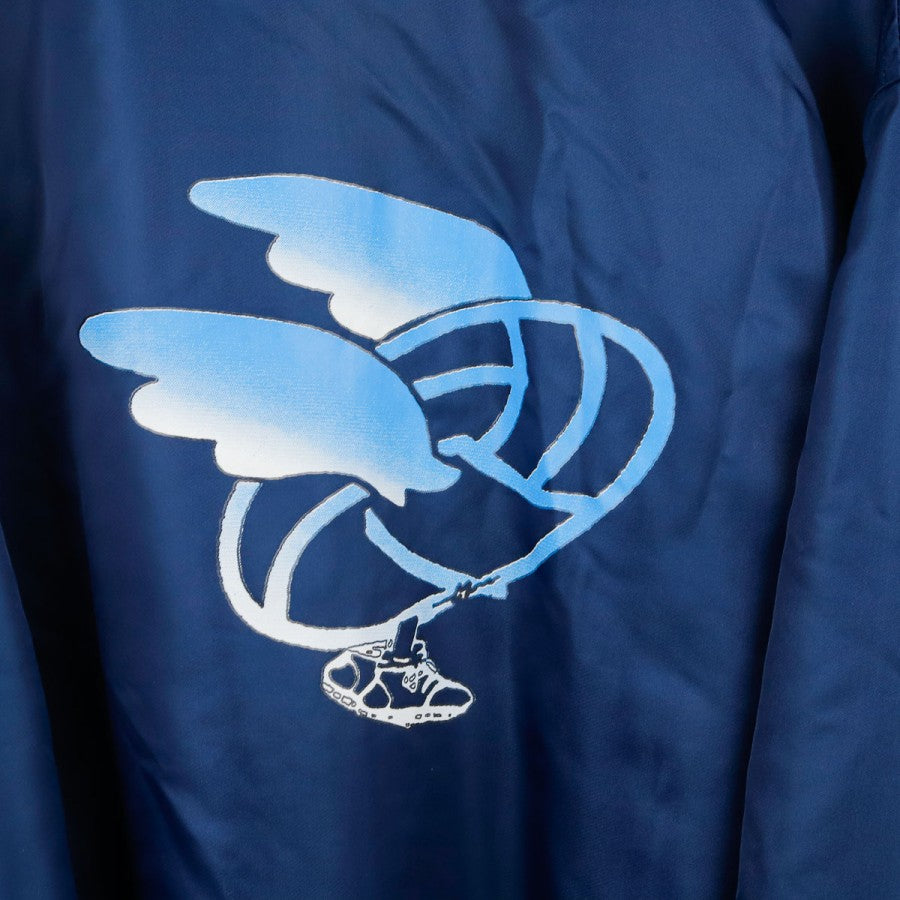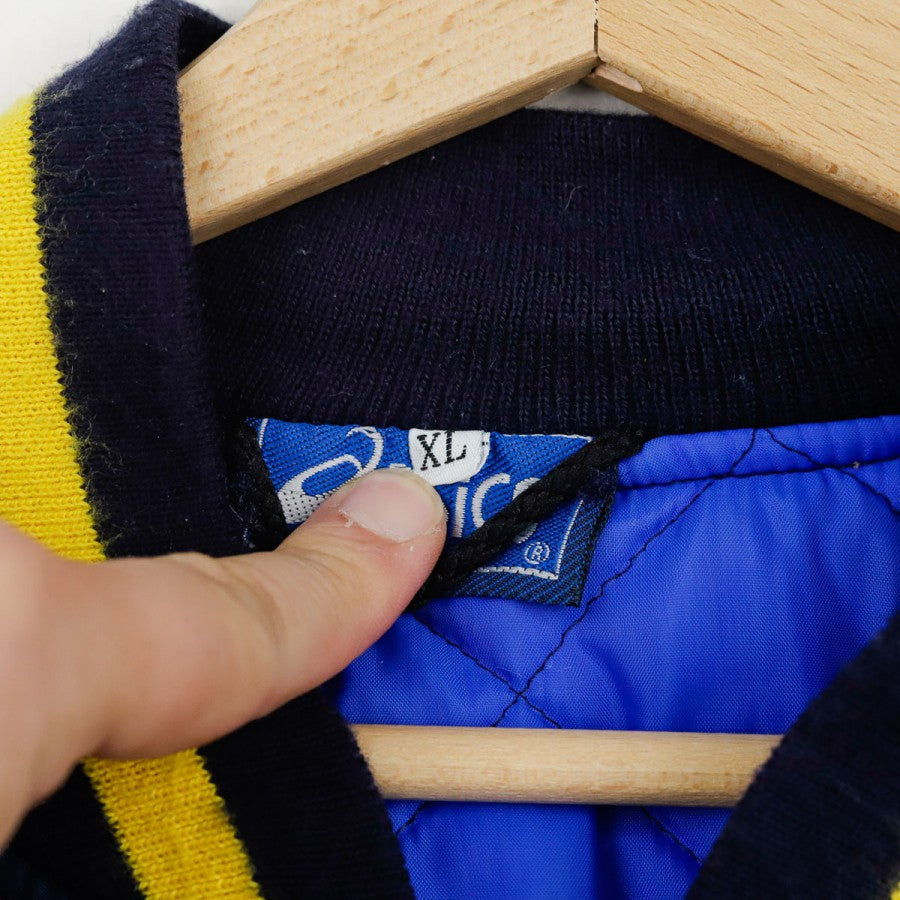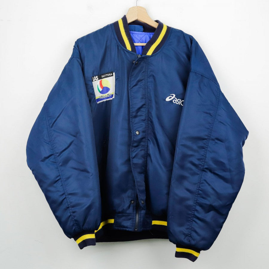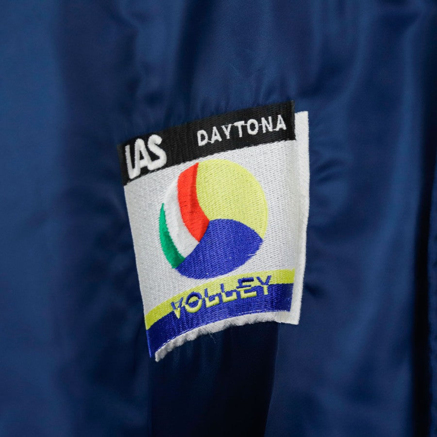 Giacca ufficiale da rappresentanza della squadra di volley Las Daytona per la stagione 1996/1997, prodotta dallo sponsor tecnico Asics. Il modello è un classico bomber sportivo anni '90, con imbottitura interna trapuntata, chiusura con zip e bottoni automatici, finiture a costine su polsini, colletto e fondo, e una colorazione blu navy con dettagli giallo-nera a contrasto. Sul petto sono cuciti il logo Asics e lo stemma del club Las Daytona Volley. Sul retro, un'ampia grafica con pallone alato e scarpetta dona un tocco unico e rappresentativo.