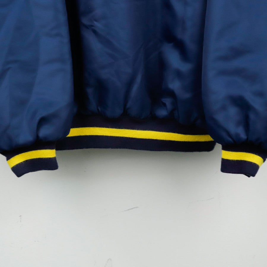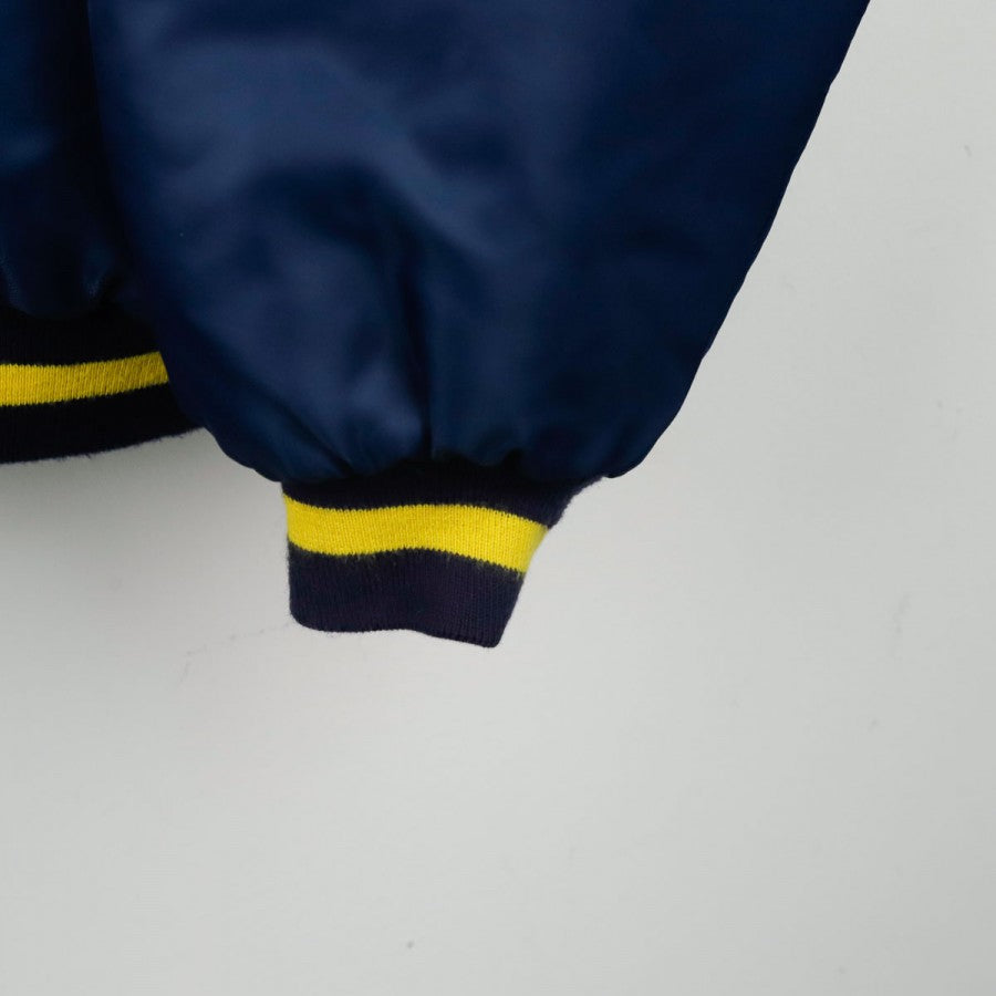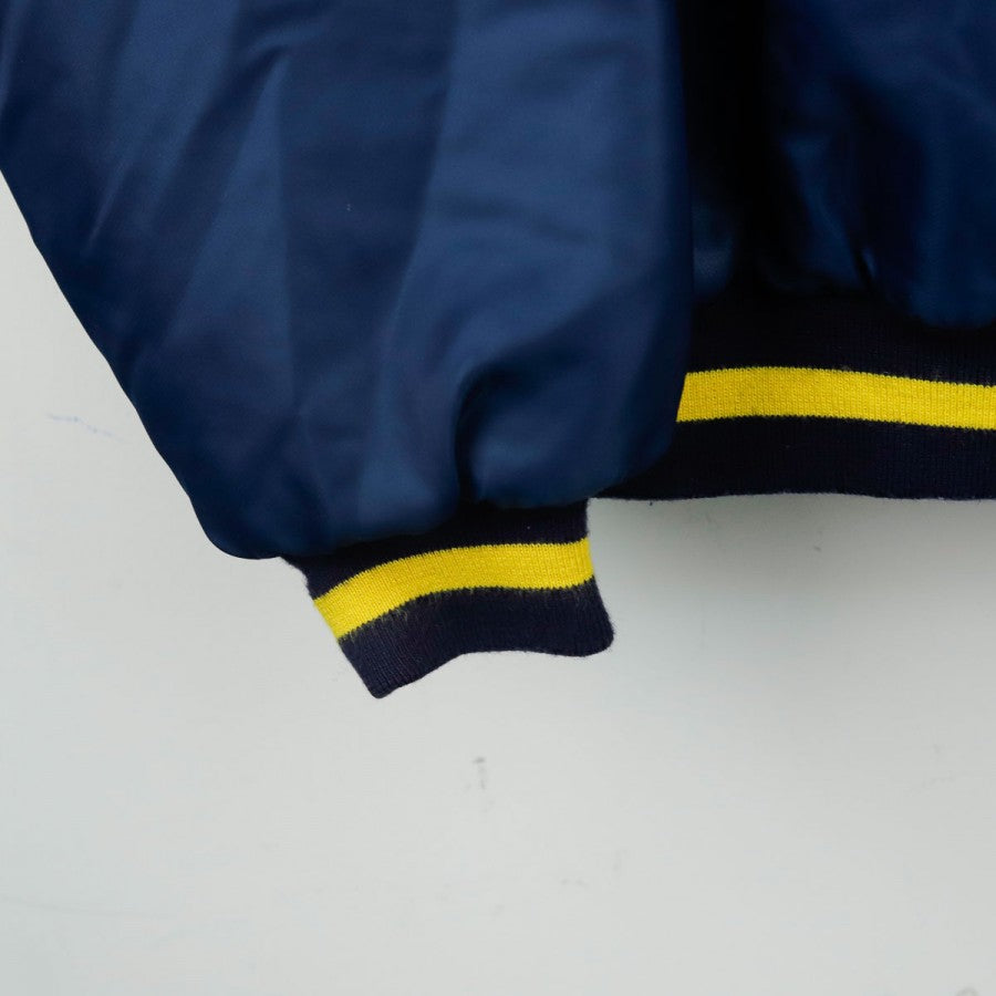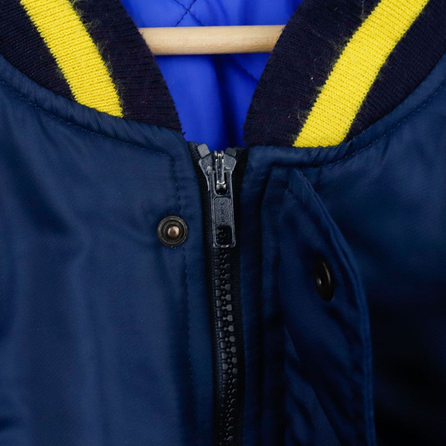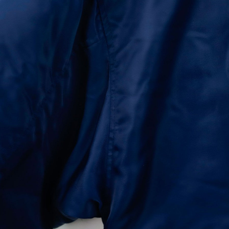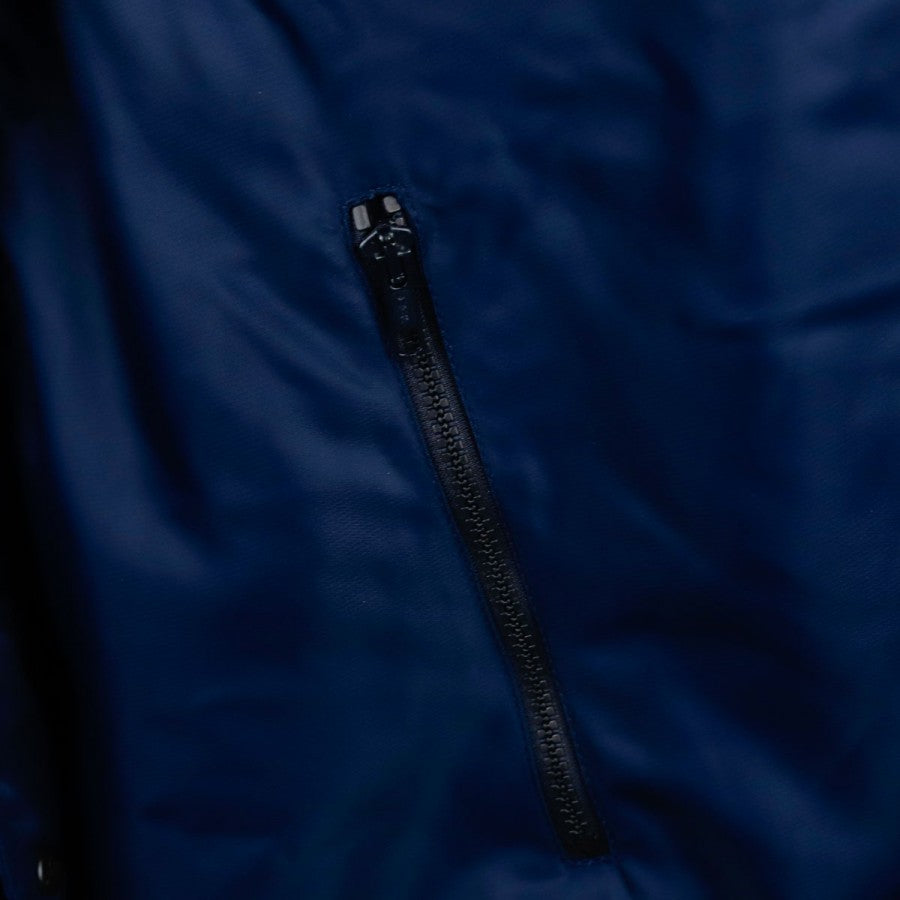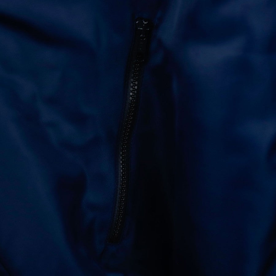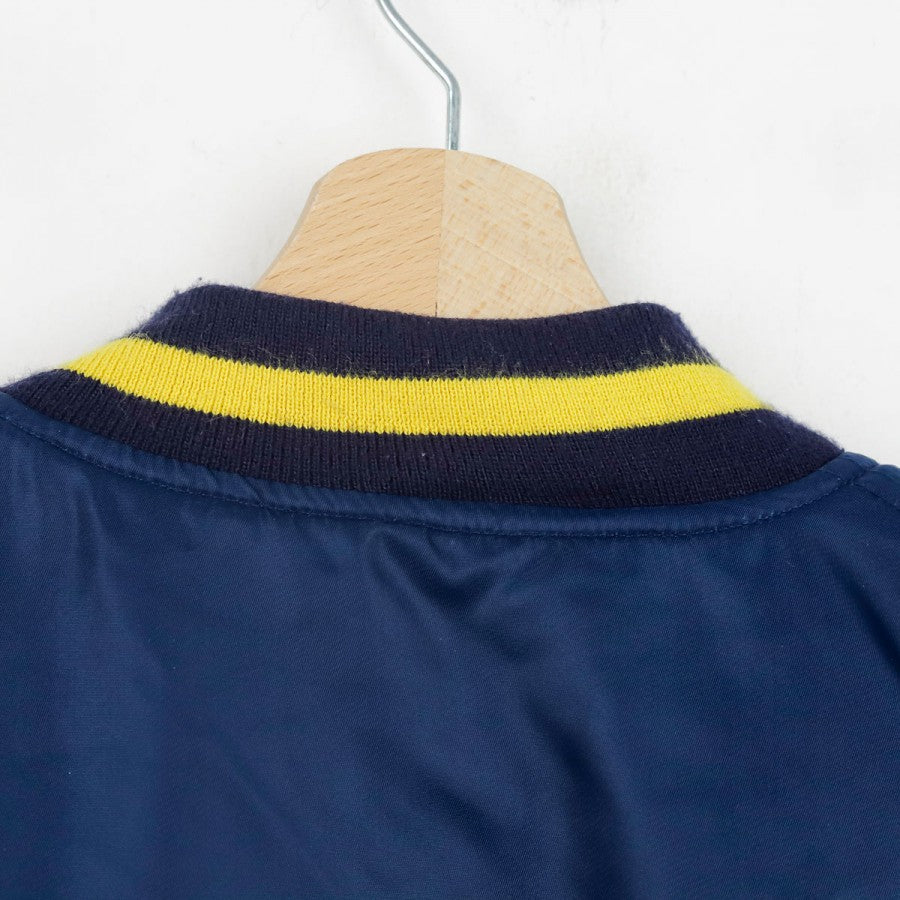 Giacca ufficiale da rappresentanza della squadra di volley Las Daytona per la stagione 1996/1997, prodotta dallo sponsor tecnico Asics. Il modello è un classico bomber sportivo anni '90, con imbottitura interna trapuntata, chiusura con zip e bottoni automatici, finiture a costine su polsini, colletto e fondo, e una colorazione blu navy con dettagli giallo-nera a contrasto. Sul petto sono cuciti il logo Asics e lo stemma del club Las Daytona Volley. Sul retro, un'ampia grafica con pallone alato e scarpetta dona un tocco unico e rappresentativo.