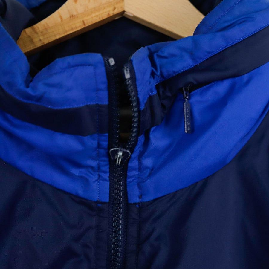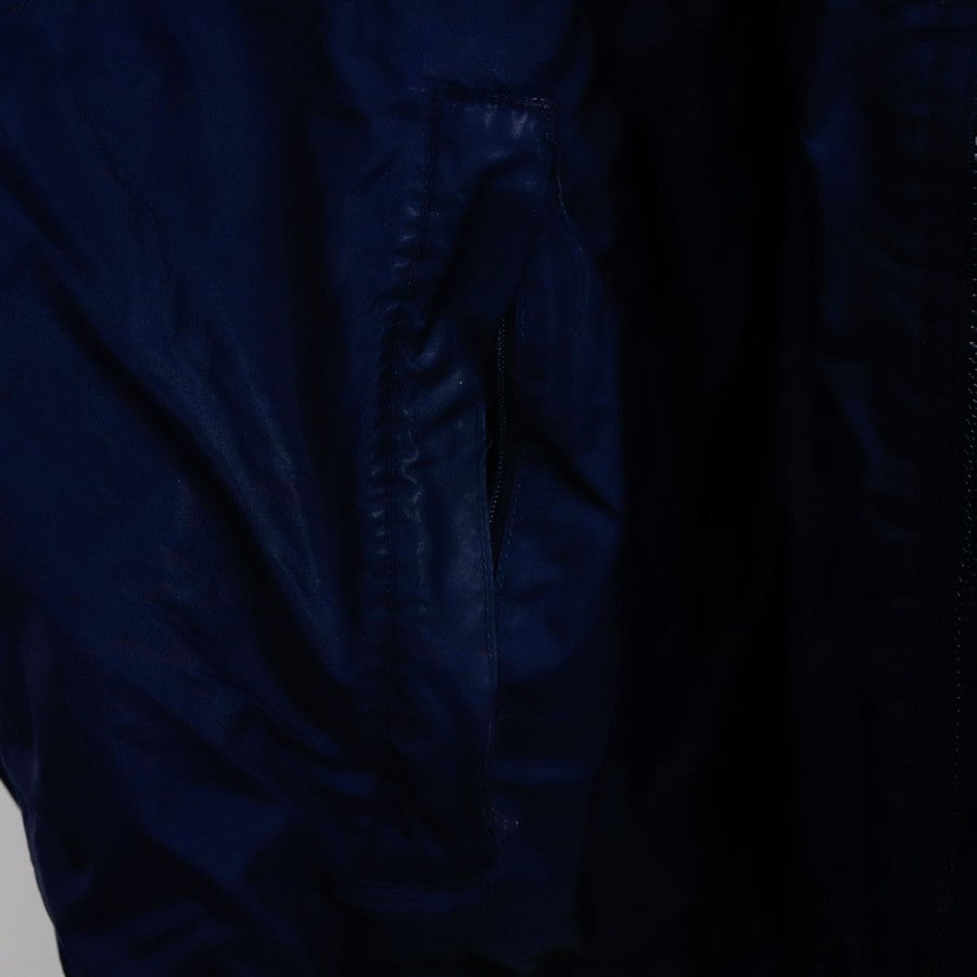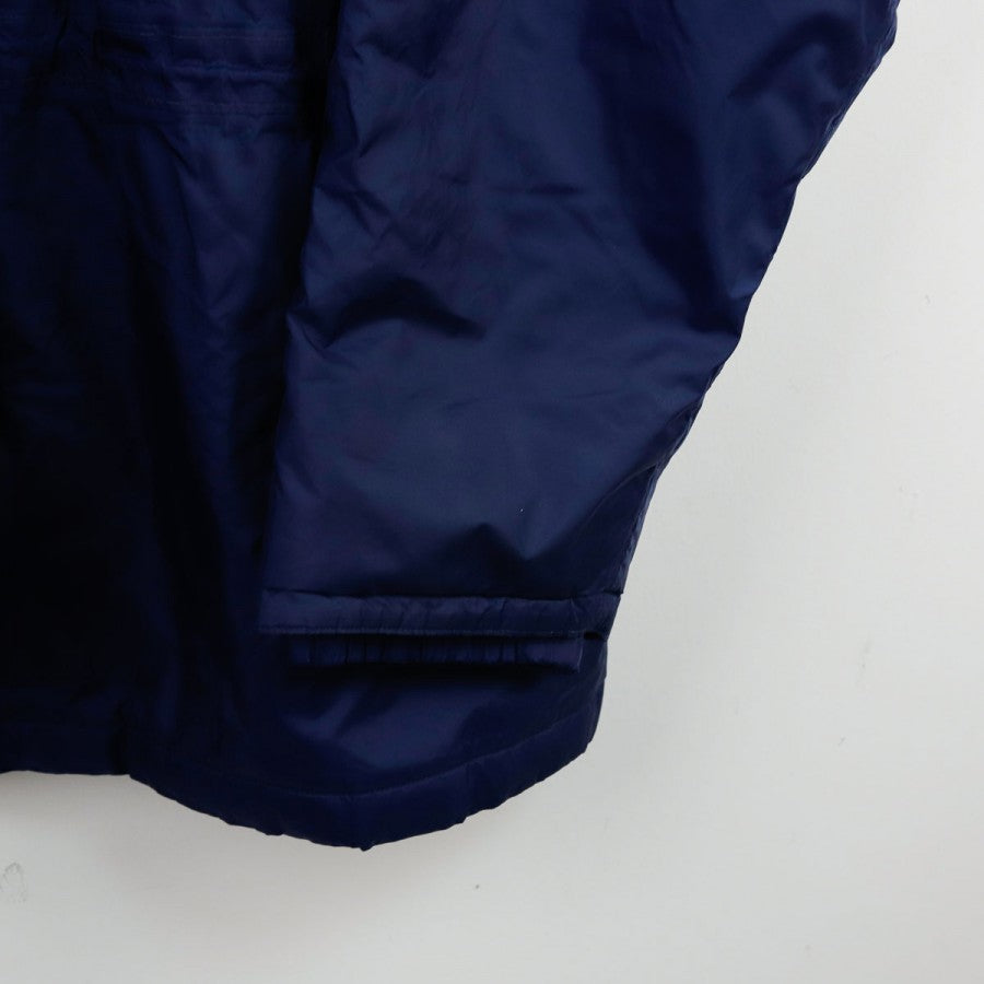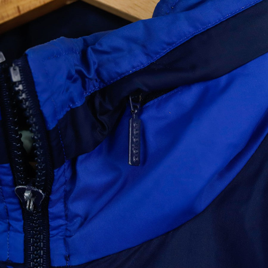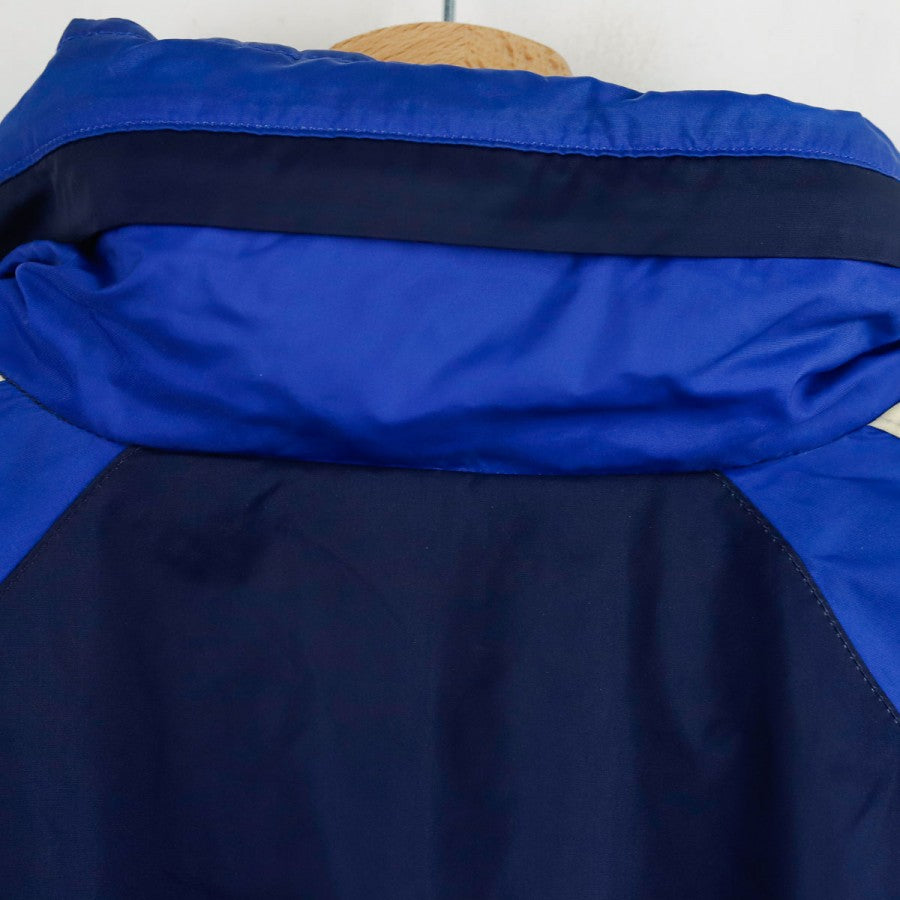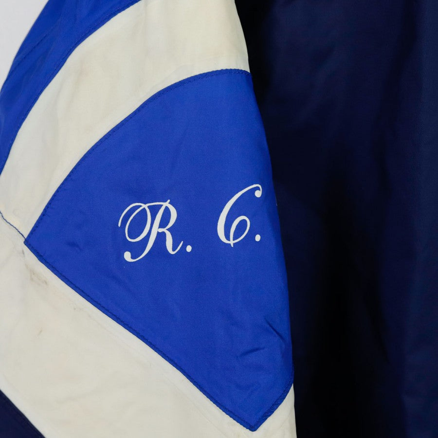 Giaccone ufficiale del Deportivo La Coruña per la stagione 1996/1997, realizzato dallo sponsor tecnico Adidas. Il capo è caratterizzato da una colorazione blu navy con inserti azzurri e dettagli bianchi sulle maniche. Le iconiche tre strisce Adidas sono presenti sulle spalle, mentre il logo Adidas in bianco è applicato sul petto. Sulle maniche è ricamato “R.C. Deportivo”. Il giaccone è imbottito, dotato di chiusura a zip, colletto alto e due tasche frontali. La taglia riportata è XL.