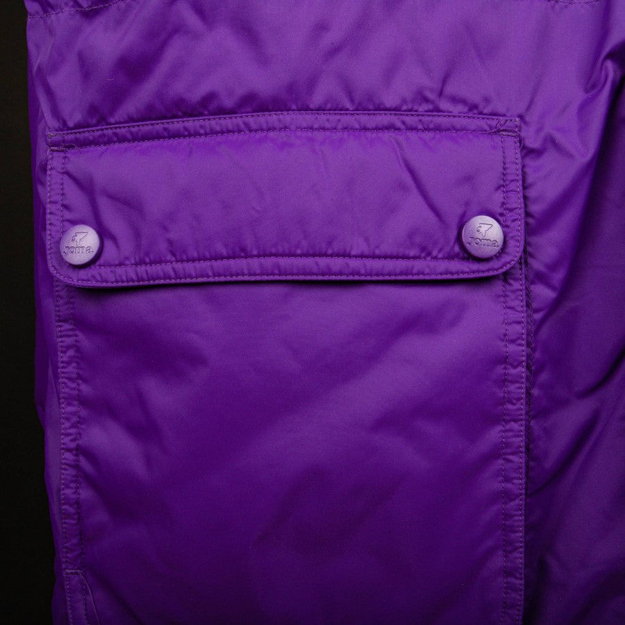 Modello di colore viola, full zip con cerniera personalizzata e bottoni a compresione. Tasche laterali ed interne. Lato cuore troviamo il logo Fiorentina, sulla destra logo Joma ricamato e Mazda.