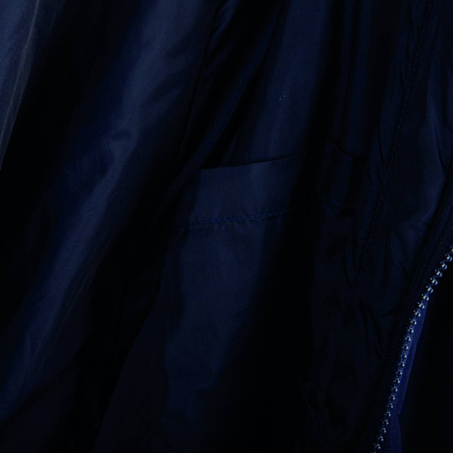 Modello di colore blu, full zip e tasche laterali con zip, cerniera personalizzata e bottoni a compresione. Lato cuore troviamo il logo Inter e lo sponsor commerciale Pirelli, sulla destra logo Umbro ricamato.