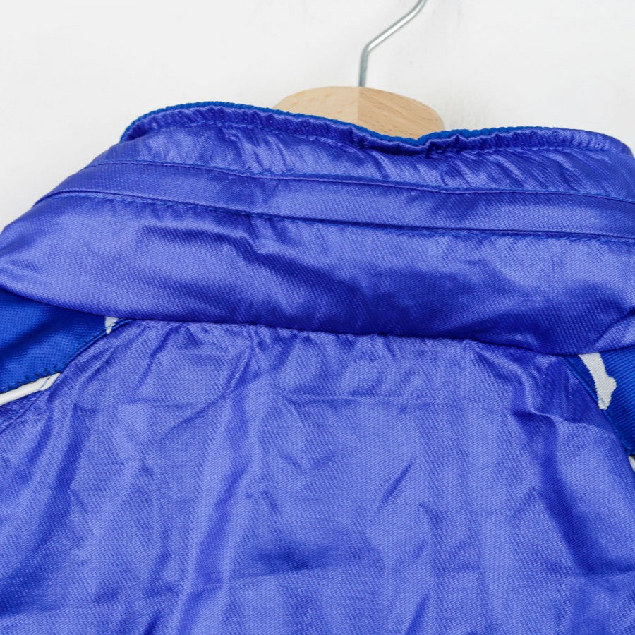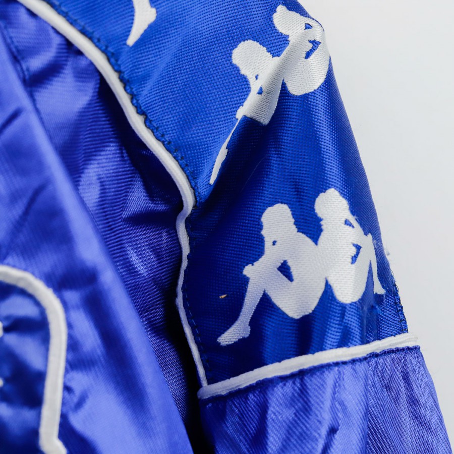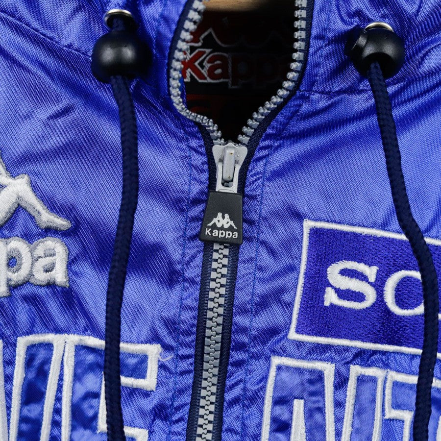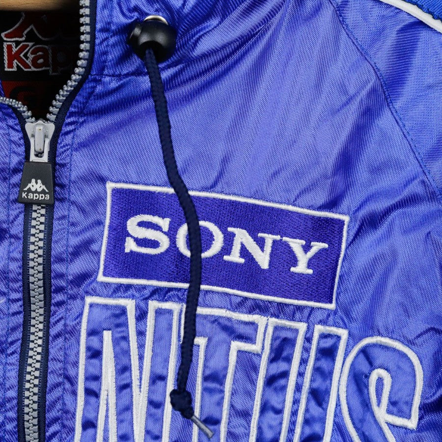 Giacca ufficiale Juventus stagione 1996/1997, realizzata dallo sponsor tecnico Kappa in una vivace colorazione blu. Presenta il logo commerciale Sony applicato sia frontalmente che sul retro, accompagnato dal lettering Juventus in grande evidenza. Completano il design i loghi Kappa ripetuti lungo le maniche e lo stemma del club cucito sul petto. Taglia non indicata sull'etichetta, ma visivamente comparabile a una L.