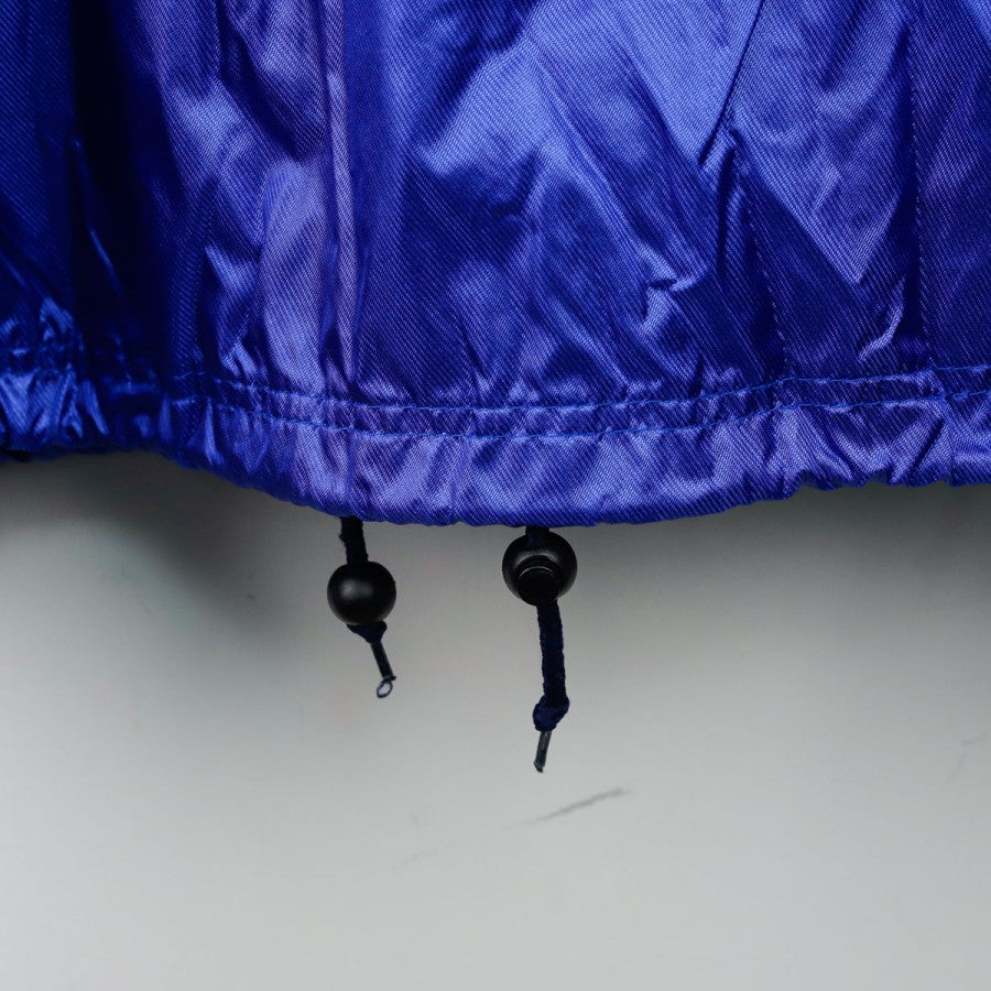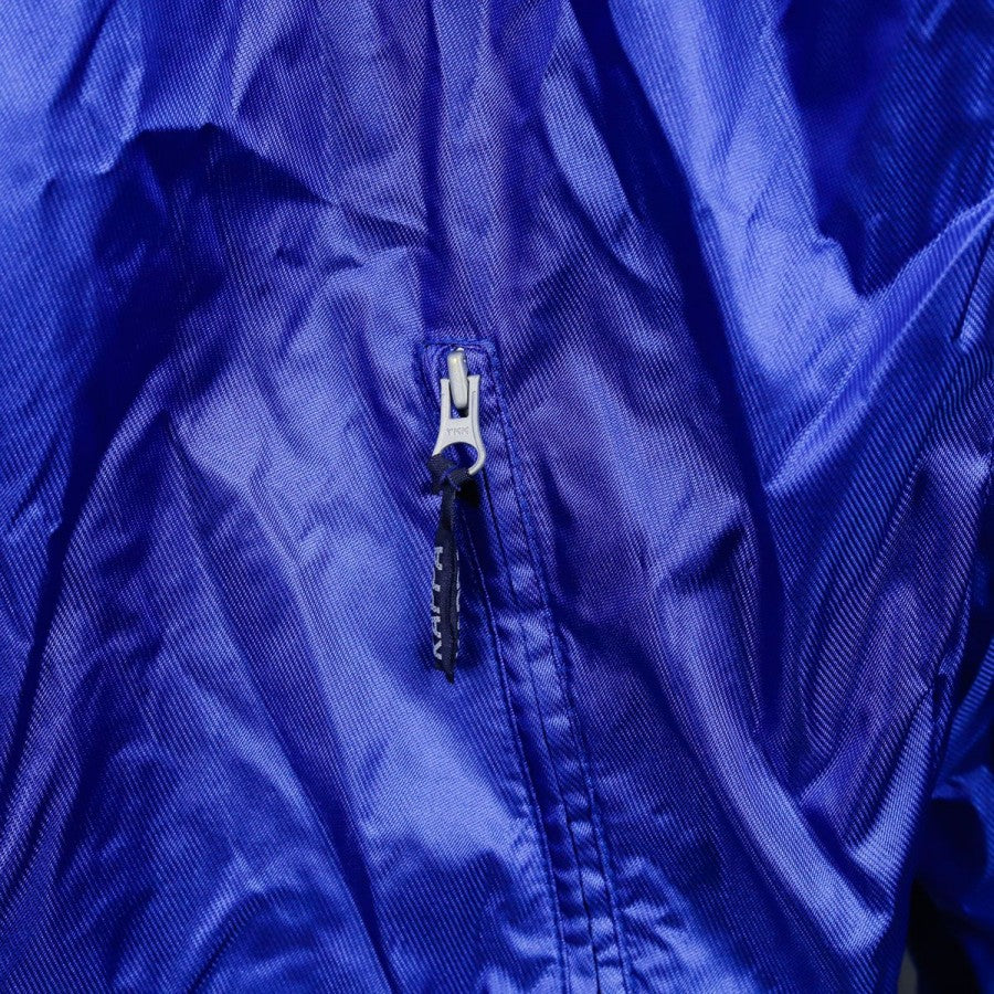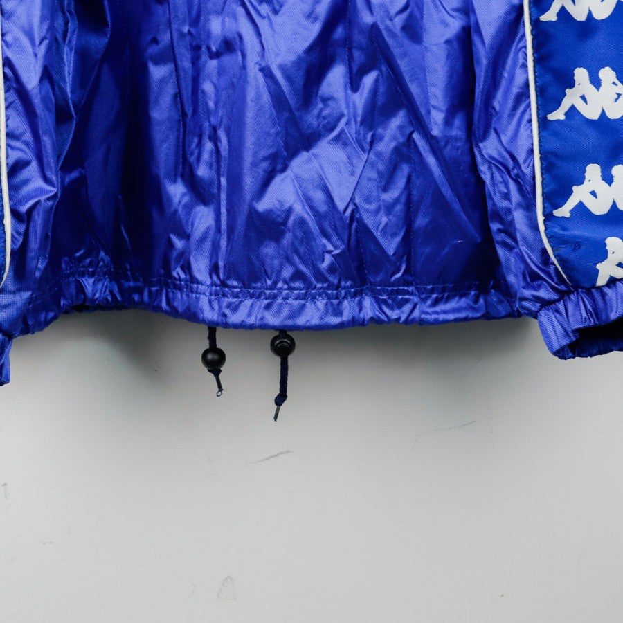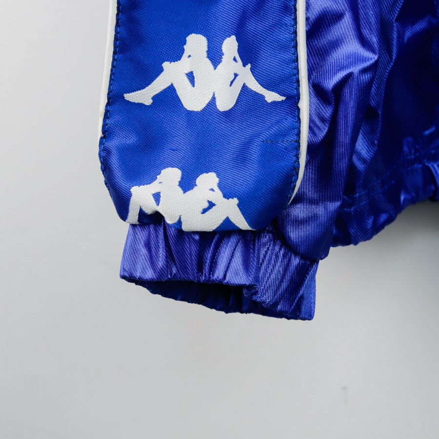 Giacca ufficiale Juventus stagione 1996/1997, realizzata dallo sponsor tecnico Kappa in una vivace colorazione blu. Presenta il logo commerciale Sony applicato sia frontalmente che sul retro, accompagnato dal lettering Juventus in grande evidenza. Completano il design i loghi Kappa ripetuti lungo le maniche e lo stemma del club cucito sul petto. Taglia non indicata sull'etichetta, ma visivamente comparabile a una L.