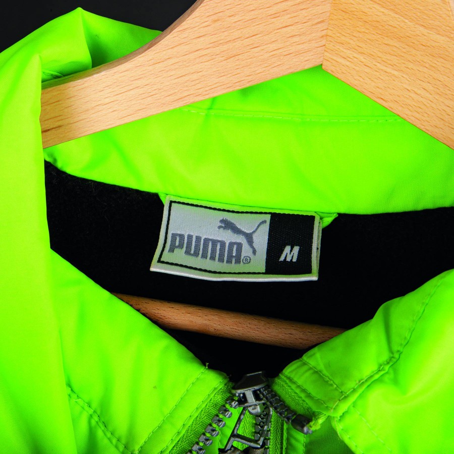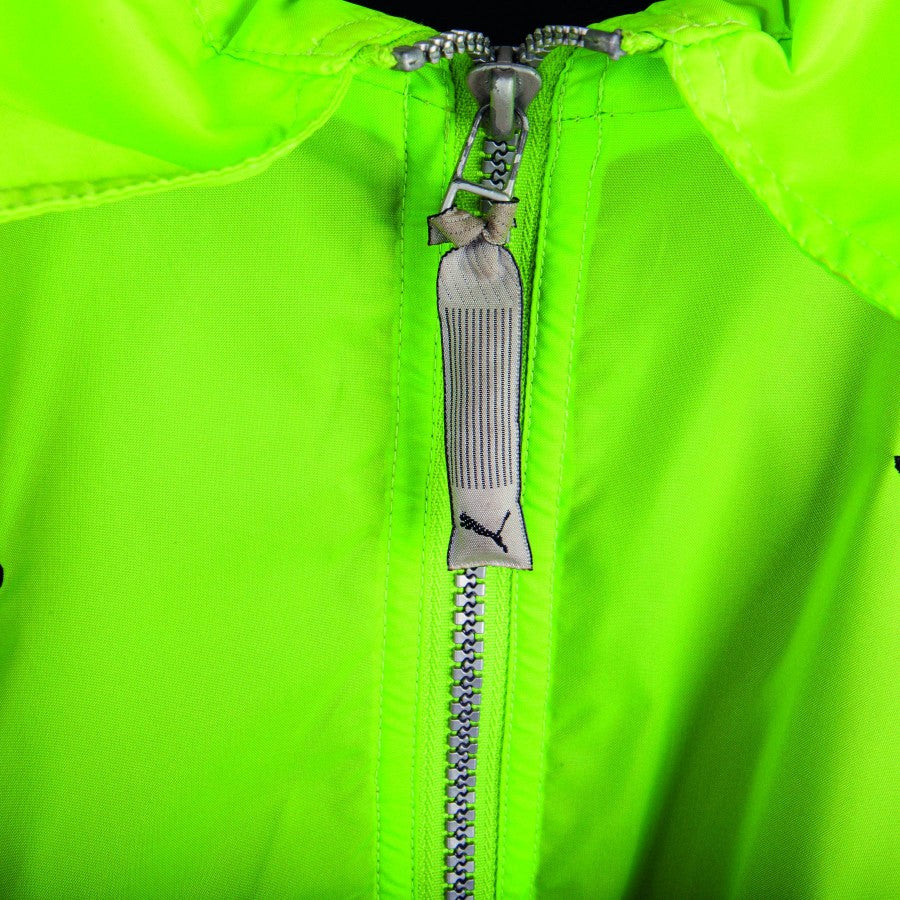Modello di colore verde con banda laterale Puma grigio scuro. Tasche laterali con zip, cerniera full zip. Lato cuore troviamo lo sponsor commerciale Lazio e siemens mobile phones, sulla destra logo Puma ricamato.
