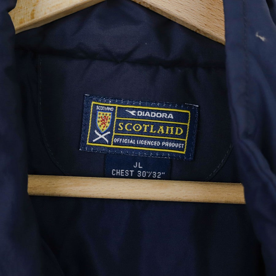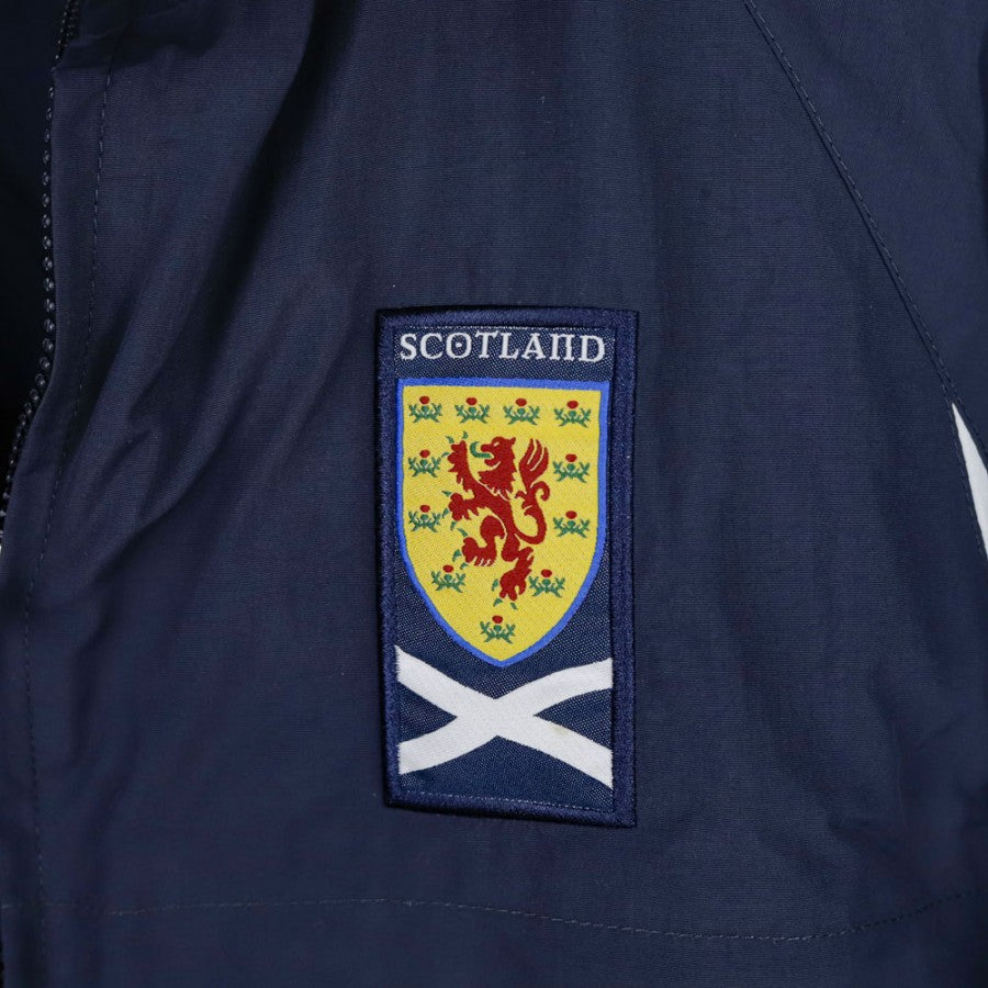 Giaccone della nazionale scozzese realizzato dallo sponsor tecnico Diadora per la stagione 2004/2005. Di colore blu presenta lo stemma della nazionale cucito sul petto come il lettering dello sponsor tecnico Diadora ricamato. Sponsor commerciale Safeway. Taglia JL.
