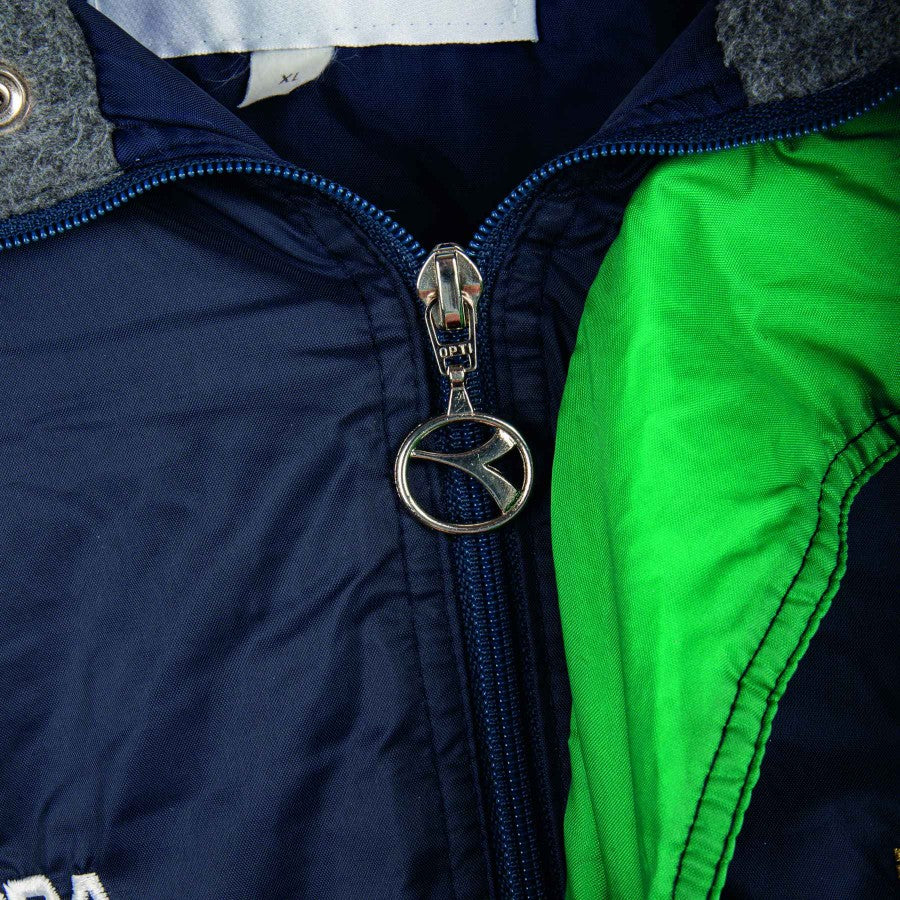 Modello di colore blu con banda laterale Diadora ed inserti verdi. Full zip con botoni a compresione. Lato cuore troviamo lo stemma della squadra sk rapid wien, sulla destra logo Diadora ricamato.