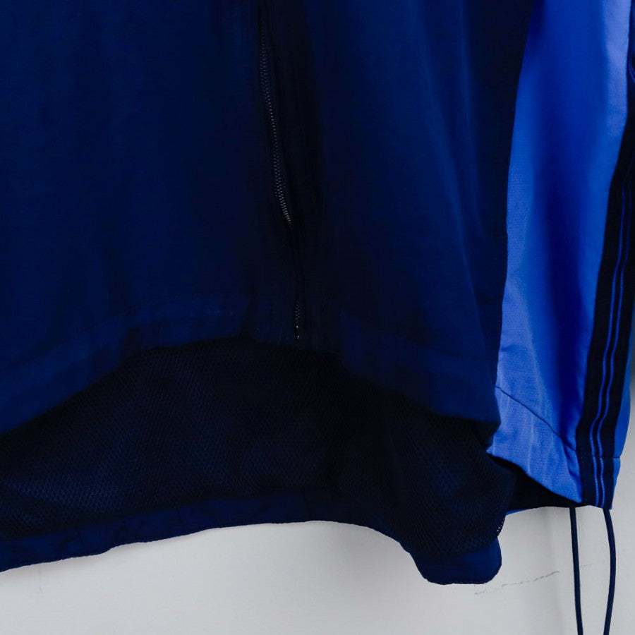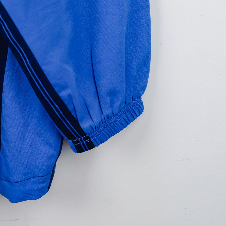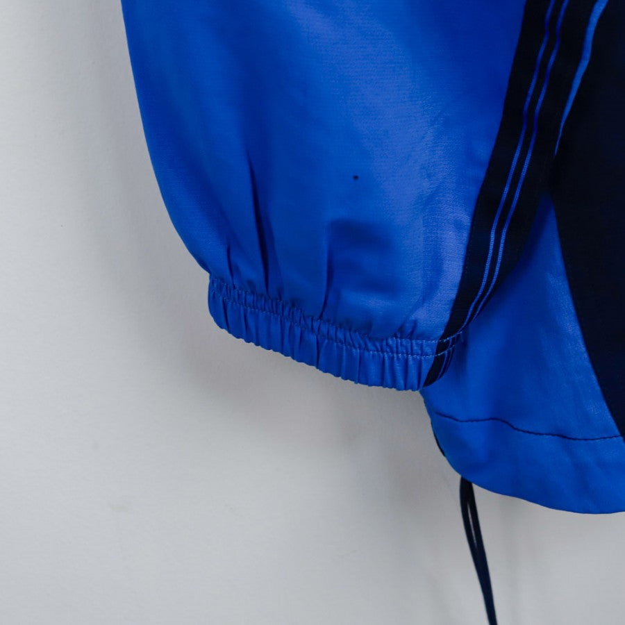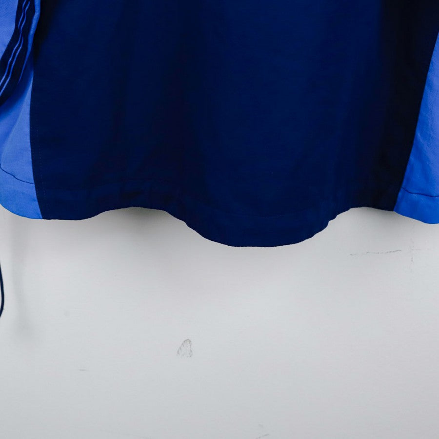 Giubbino ufficiale del SSC Napoli per la stagione 1998/1999 realizzato da Nike. Il modello è caratterizzato da un design a due tonalità di azzurro con zip centrale e coulisse regolabile in vita. Sul petto compaiono il logo Nike come sponsor tecnico e lo stemma classico della SSC Napoli, mentre sul retro si trova la scritta “NAPOLI” sotto al colletto e il celebre Swoosh bianco in grande formato. Taglia M.