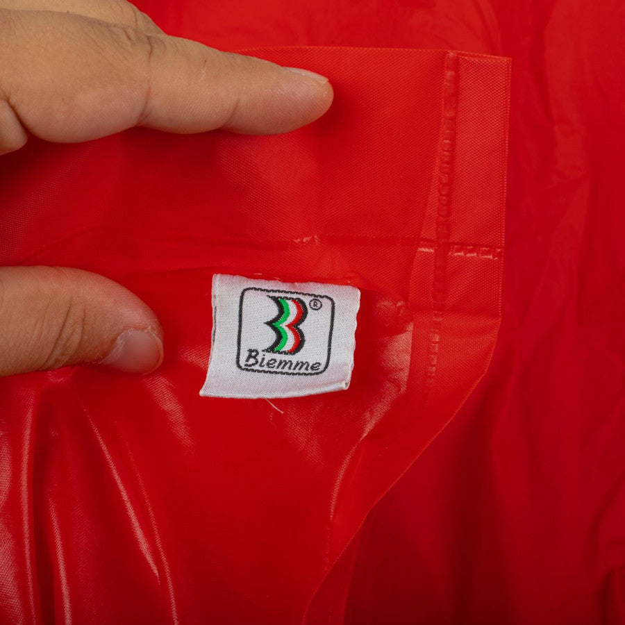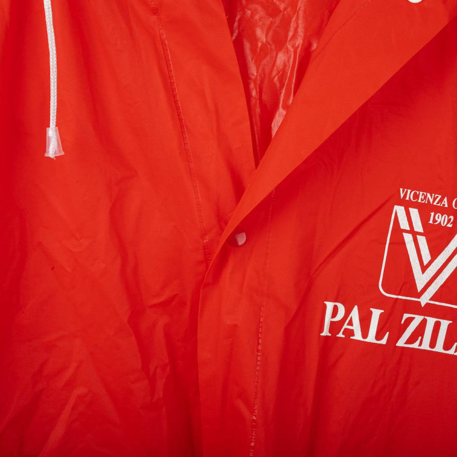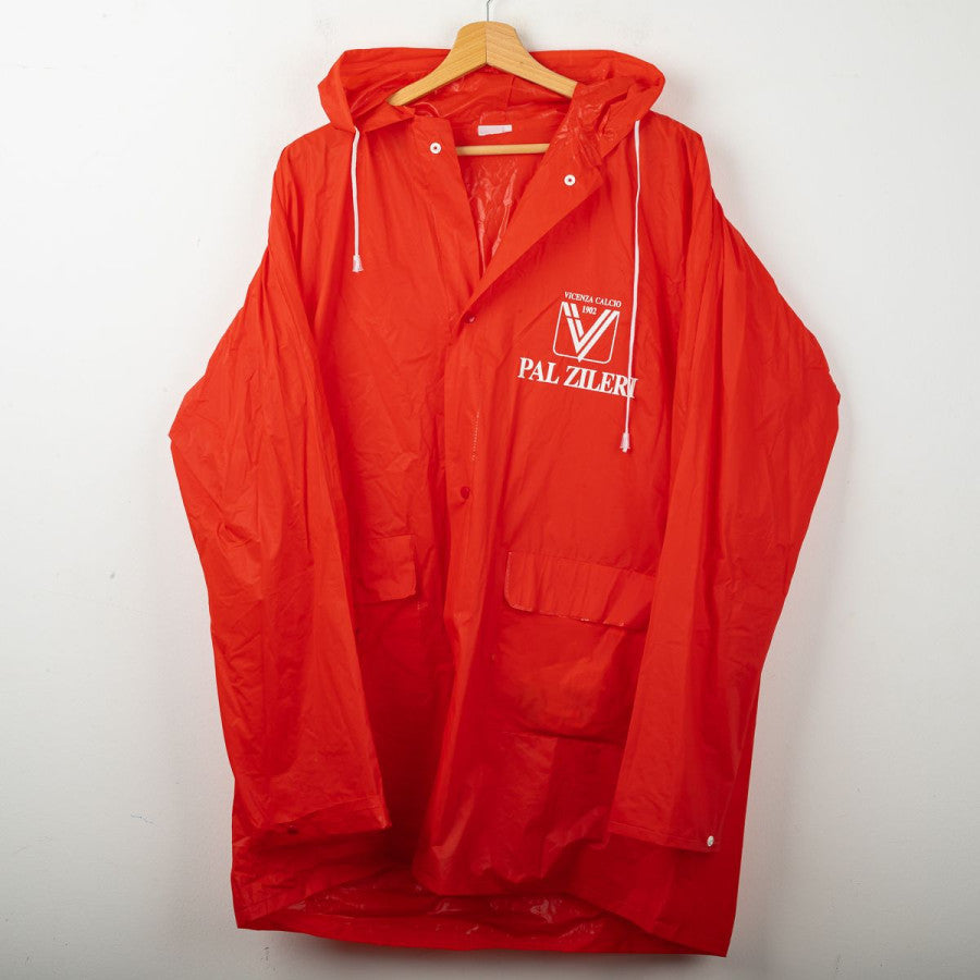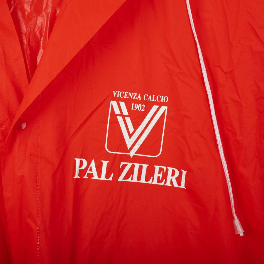 mpermeabile ufficiale del Vicenza Calcio della stagione 2002/2003, prodotto da Biemme. Colore rosso acceso con logo Vicenza Calcio 1902 e sponsor Pal Zileri stampati in bianco sul petto. Modello con cappuccio regolabile tramite cordini, chiusura frontale con bottoni a pressione e tasche anteriori con patta. Tessuto impermeabile leggero, ideale per le giornate di pioggia durante gli allenamenti o in panchina. Etichetta Biemme cucita all'interno. Prodotto ufficiale Biemme.