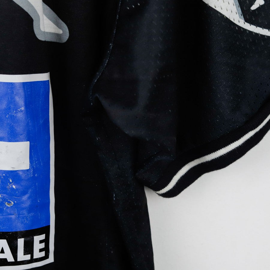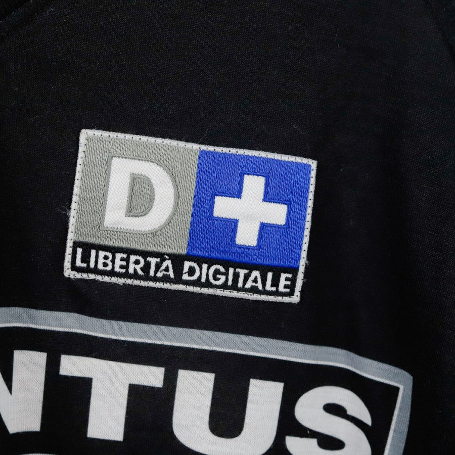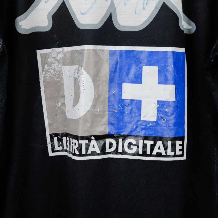 Questa maglia da allenamento della Juventus, prodotta da Kappa per la stagione 1999/2000, presenta un design iconico in nero con dettagli bianchi e il caratteristico motivo Kappa sulle maniche. Al centro della divisa troviamo la scritta "Juventus" e lo sponsor commerciale D+ Libertà Digitale. Il logo Kappa è posizionato sul petto e sulle maniche, mentre il colletto a V conferisce un tocco di stile sportivo.