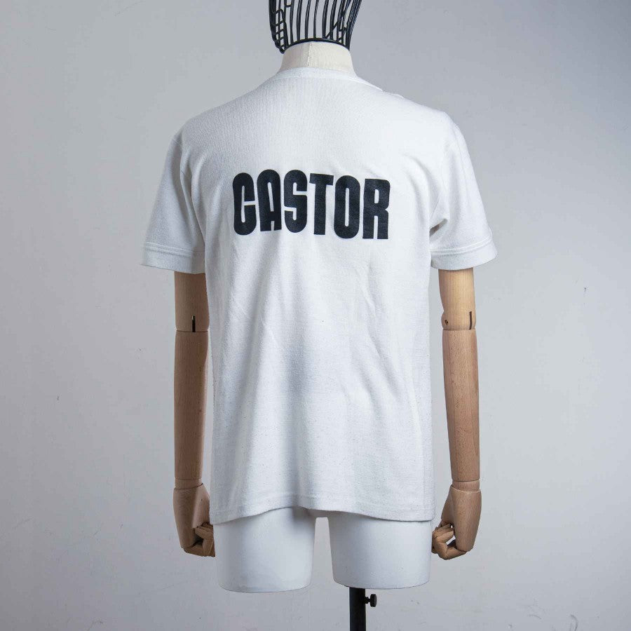 Maglia bianca da allenamento della Lazio stagione 1984/1985. Presenti i loghi verniciati Lazio e Castor (quest'ultimo anche sul retro) e il logo NR cucito sul lato destro.