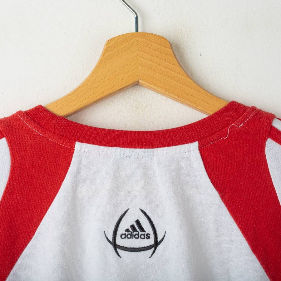 Maglia da allenamento ufficiale dell'AC Milan per la stagione 2004/2005, prodotta da Adidas. Il design presenta una base bianca con inserti rossi sulle spalle e le iconiche tre strisce Adidas lungo le maniche. Sul petto sono visibili il logo del club, lo sponsor tecnico Adidas e il main sponsor Opel, tutti ricamati. Sulla parte posteriore è presente il logo Adidas in alto. Modello a maniche corte in tessuto leggero e traspirante, ideale per gli allenamenti. Taglia indicata L.