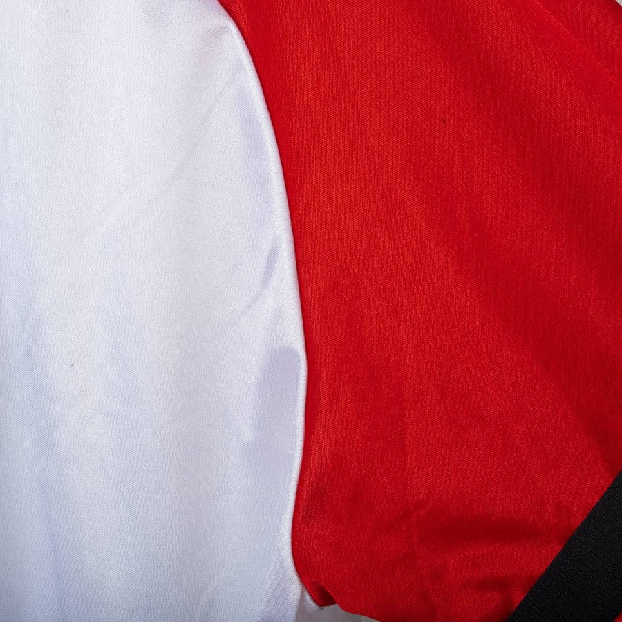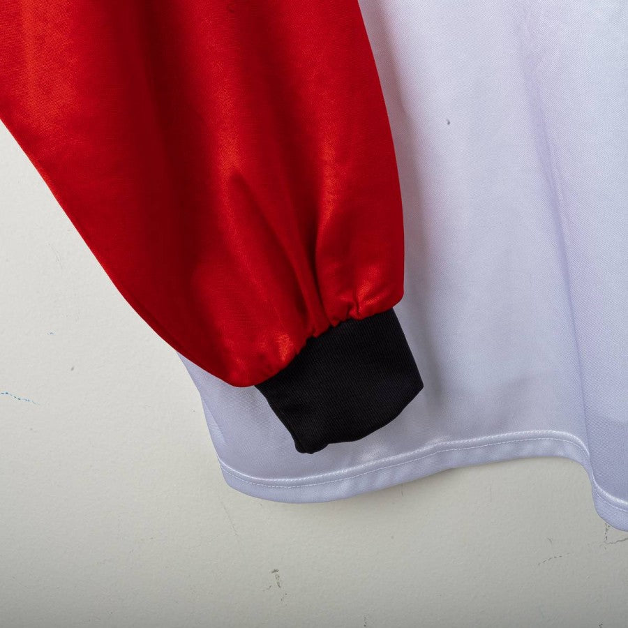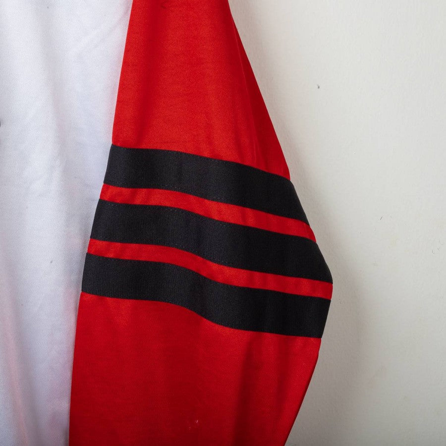 Maglia da allenamento del Milan stagione 1999/2000, prodotta da Adidas. Modello a manica lunga di colore bianco con maniche rosse e dettagli neri. Sponsor Opel e logo Adidas applicati sul fronte, maxi logo Adidas sul retro. Stemma del Milan cucito sul petto. Vestibilità regolare, taglia XXL. Prodotta in Italia.