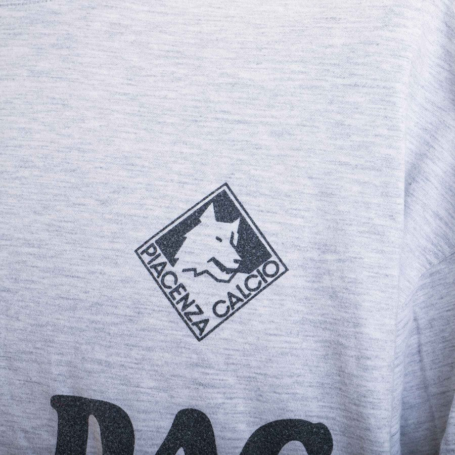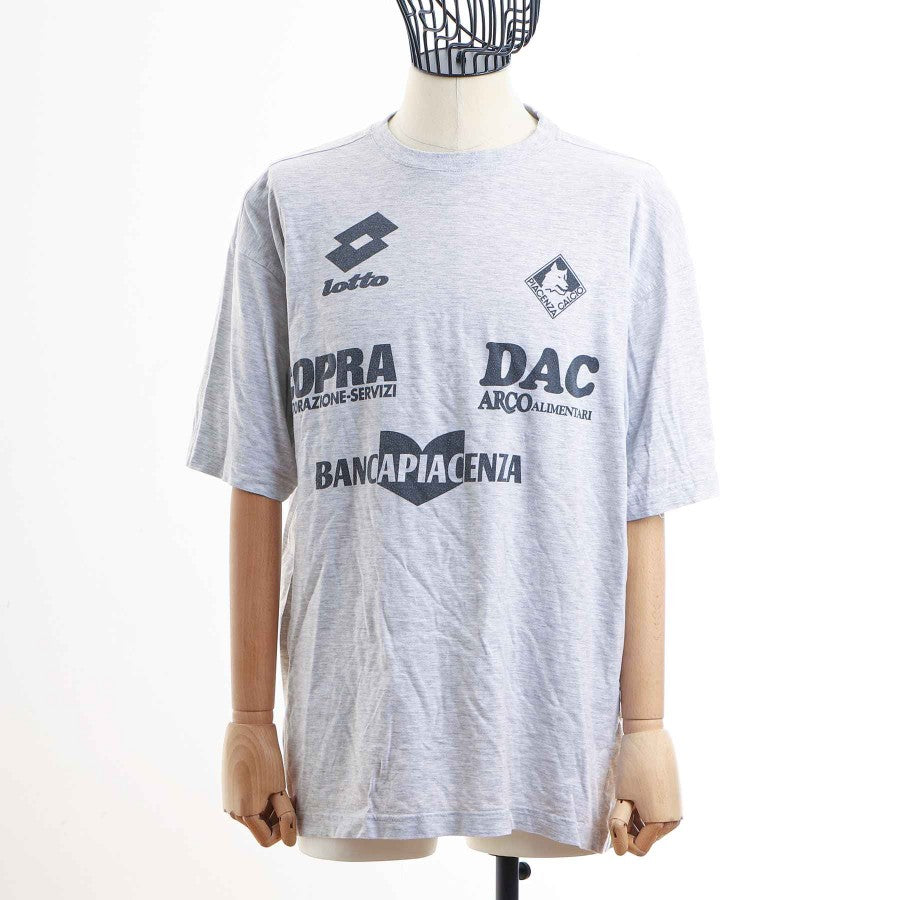 Maglietta d'allenamento grigia del Piacenza della stagione 1998/1999. T-shirt a maniche corte toalmente grigia con loghi sponsor commerciali in nero nella trama del tessuto. Logo Lotto presente nella trama sul lato destro fronte e in grande sul retro. Logo Piacenza, sempre sublimatico, lato cuore.