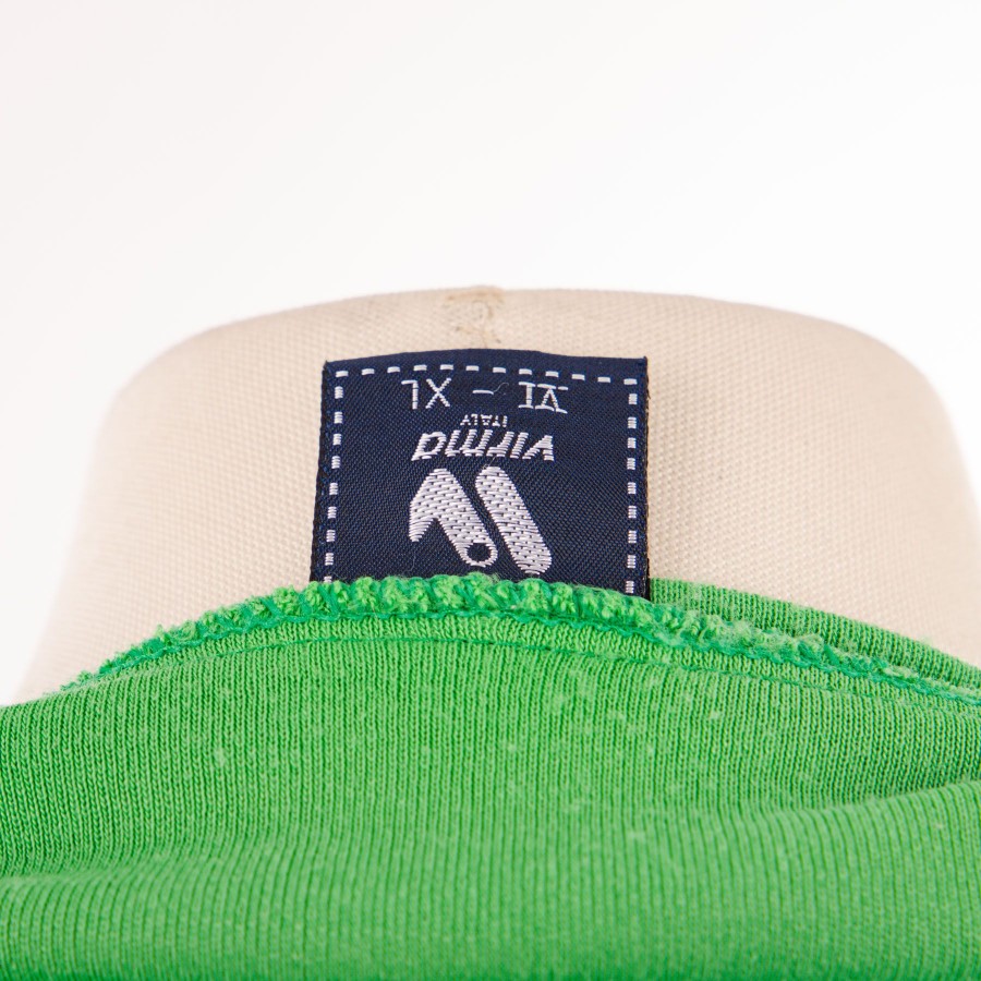 Il colore predominante dell'articolo, nella sua completezza, è il verde, benchè vi siano alcuni elementi distintivi, verniciati, tra il fronte e il retro: nella parte posteriore della maglia spadroneggia il logo dello sponsor tecnico in bianco, con in basso la scritta "virma", anch'essa in bianco; in quella frontale, sulla destra, c'è il medesimo particolare, sempre in bianco ma in dimensioni notevolmente ridotte, mentre a sinistra compare il logo della squadra, anch'esso in bianco con spazi vuoti riempiti dallo sfondo verde della maglia, perfettamente proporziato alle dimensioni dello sponsor tecnico.