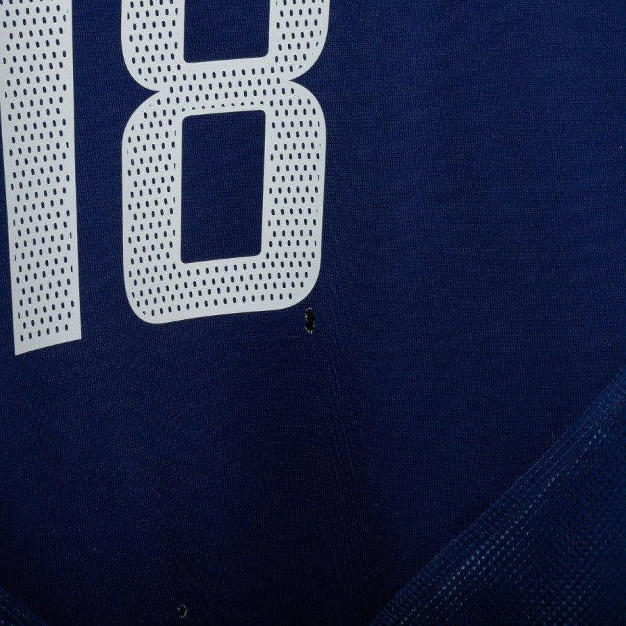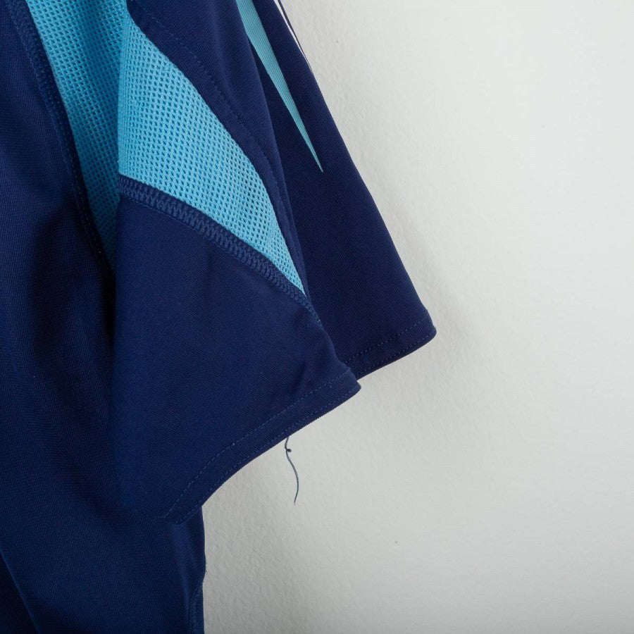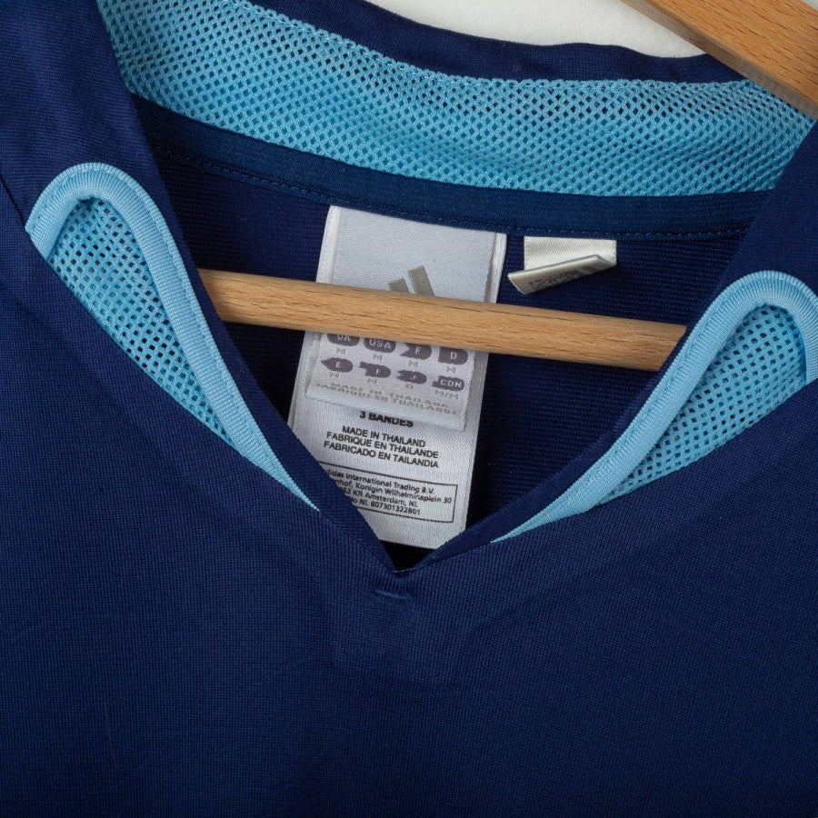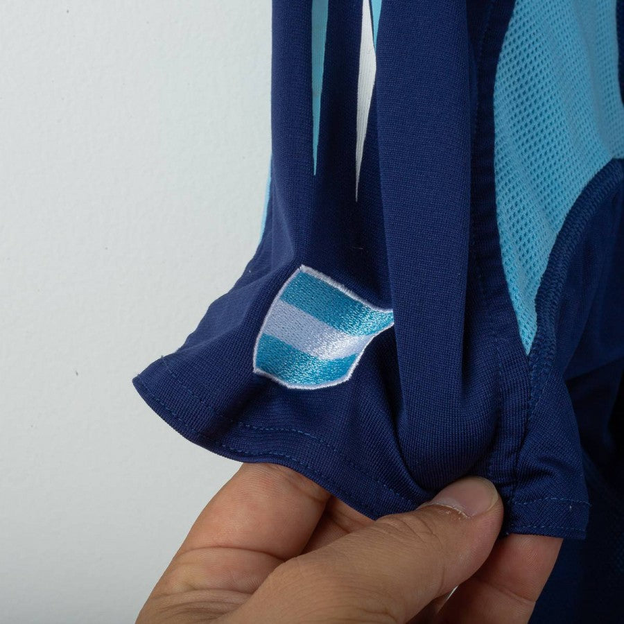 Maglia away dell'Argentina stagione 2004, prodotta da Adidas. Colore blu navy con inserti celesti e dettagli bianchi sulle spalle. Logo Adidas cucito sul petto destro, stemma AFA ricamato lato cuore con due stelle dorate. Numero 18 stampato sul fronte e retro con stile microforato, nome Messi applicato sul retro. Colletto a girocollo con inserti in contrasto e tessuto tecnico ClimaLite per leggerezza e traspirabilità. Una maglia storica, tra le prime indossate da Lionel Messi all'inizio della sua carriera in nazionale. Taglia M.