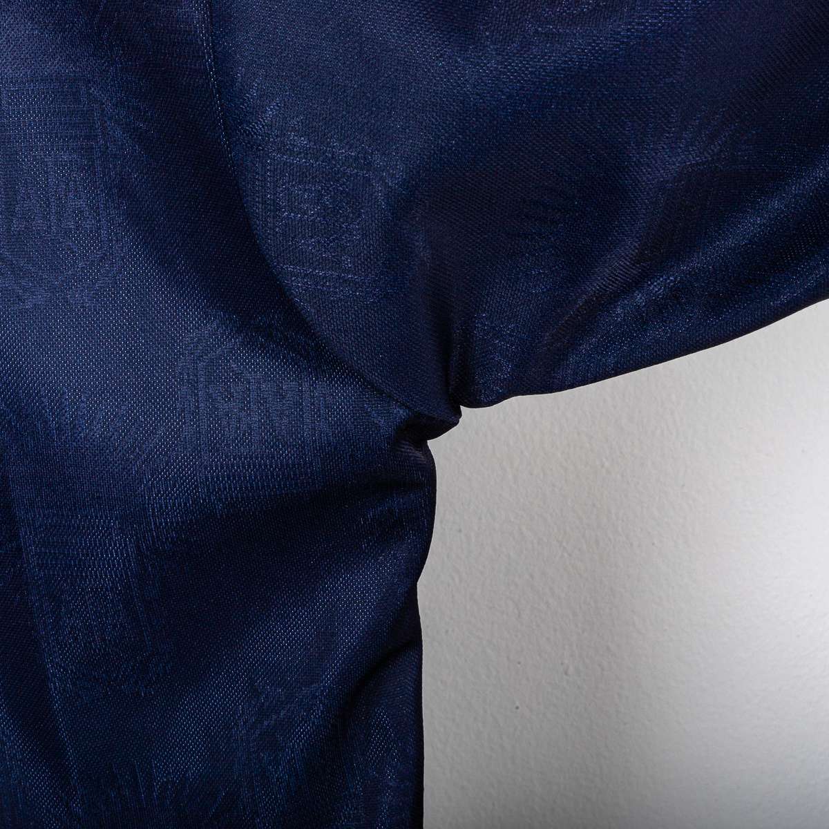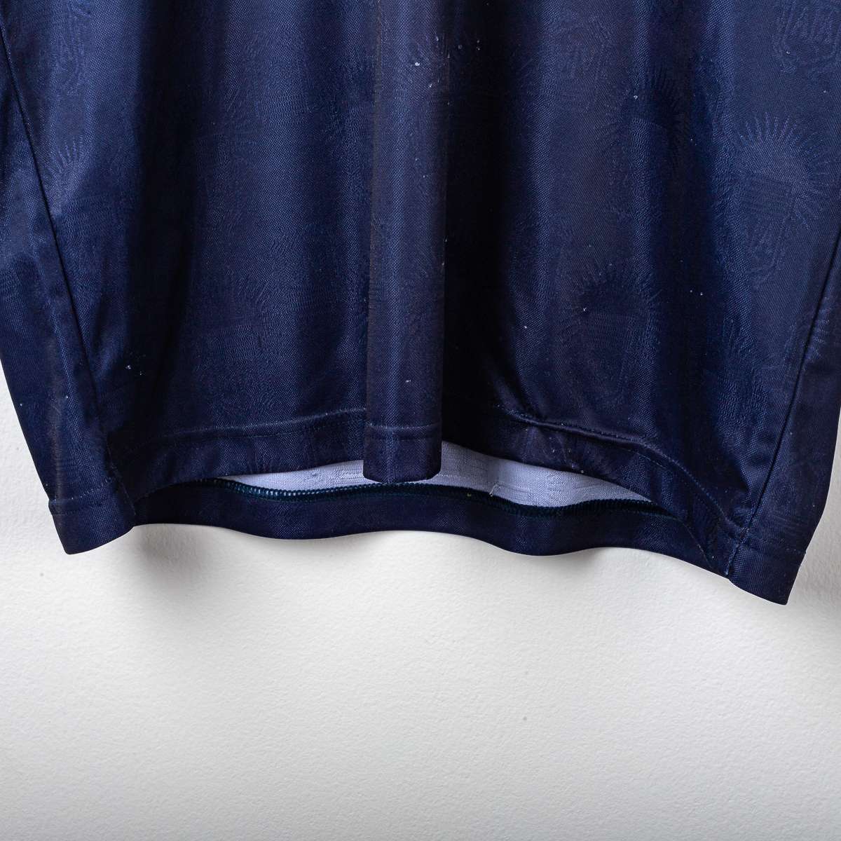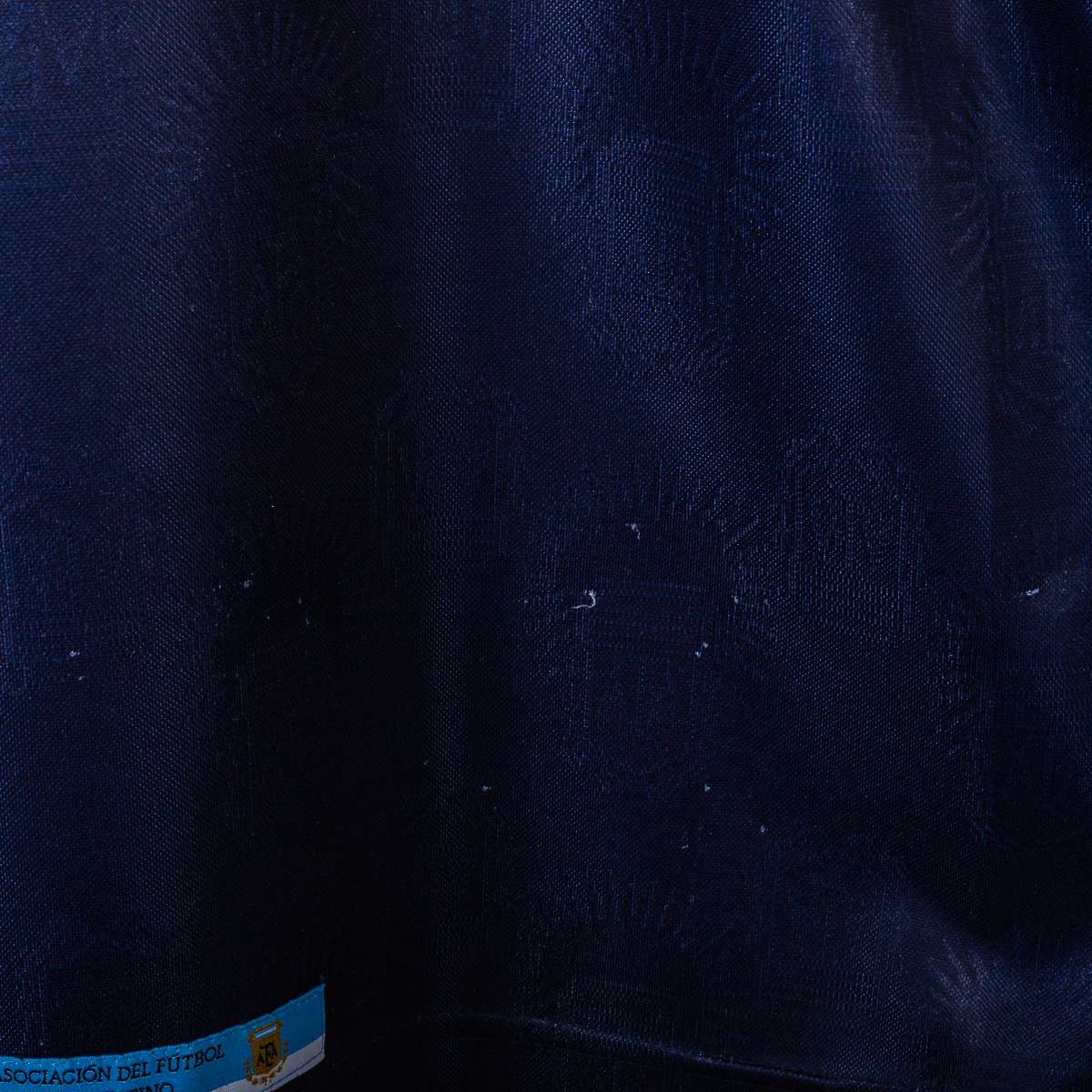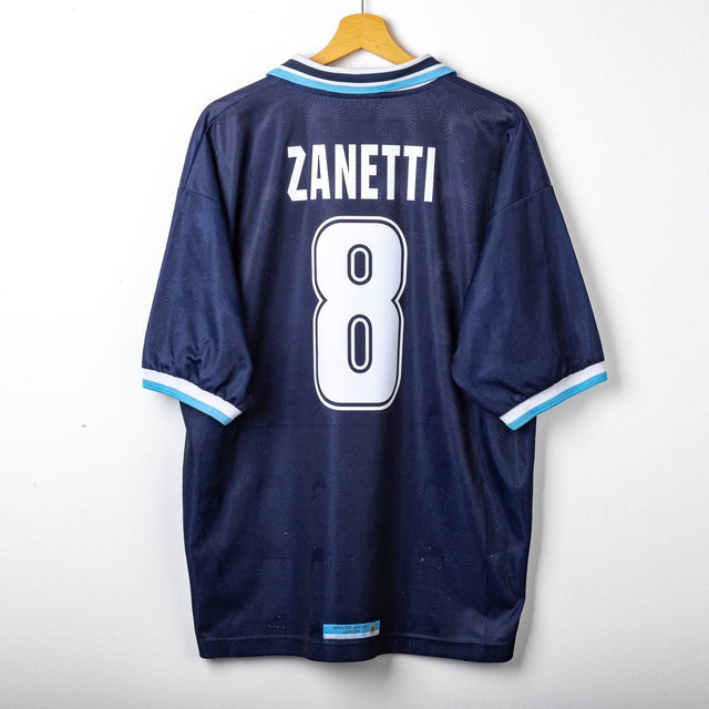 Maglia away della Nazionale Argentina stagione 1999/2000, prodotta da Reebok. Base blu navy con trama tono su tono e doppia banda orizzontale in azzurro sul petto, colletto a V con inserti bianchi e profili azzurri. Logo Reebok ricamato lato destro e Stemma AFA (Asociación del Fútbol Argentino) cucito lato cuore. Sul fronte numero 8 in bianco; sul retro nome Zanetti e numero 8 in bianco floccato. Etichette interne Reebok/AFA: taglia 42/44, composizione 100% poliestere.