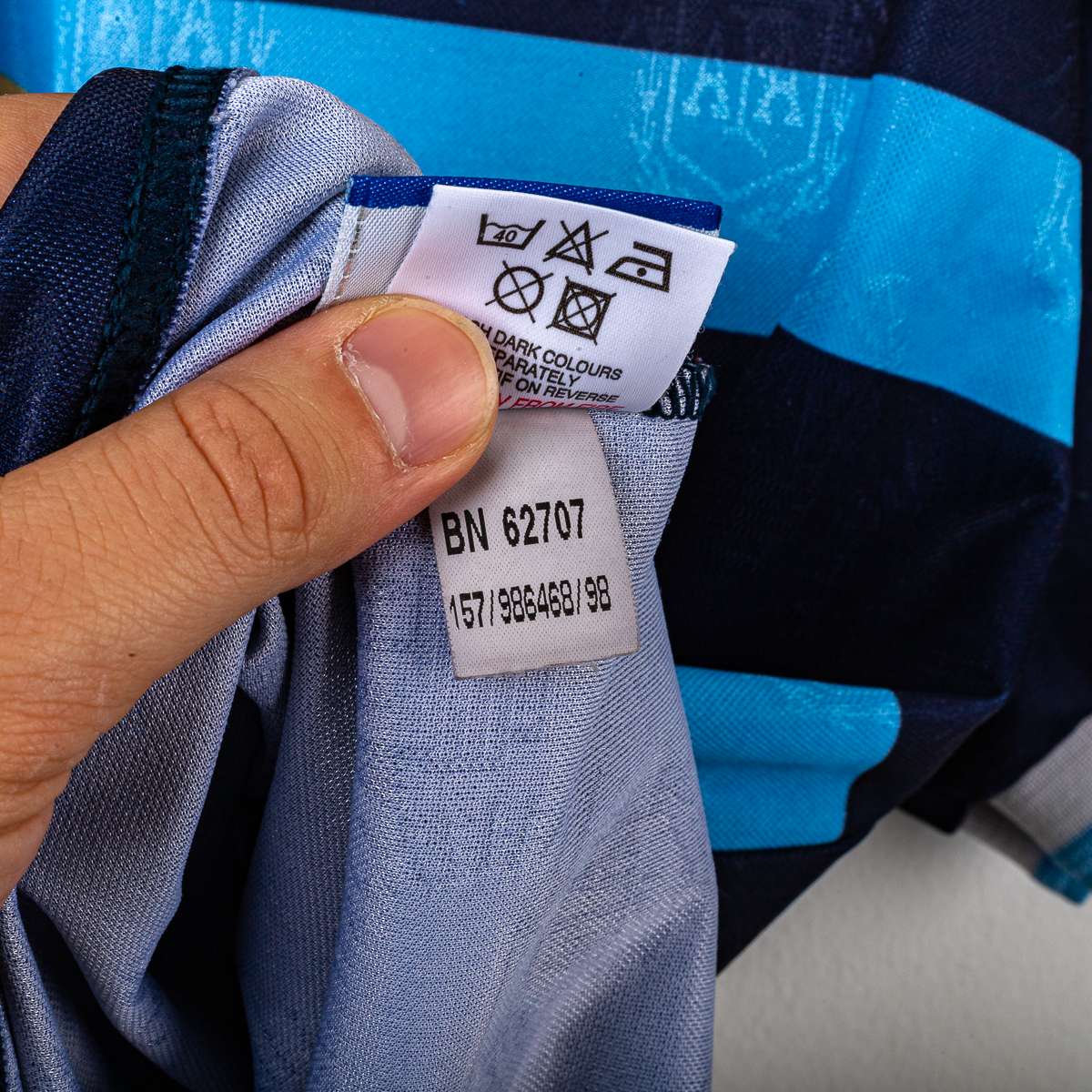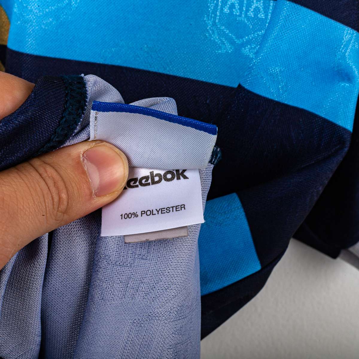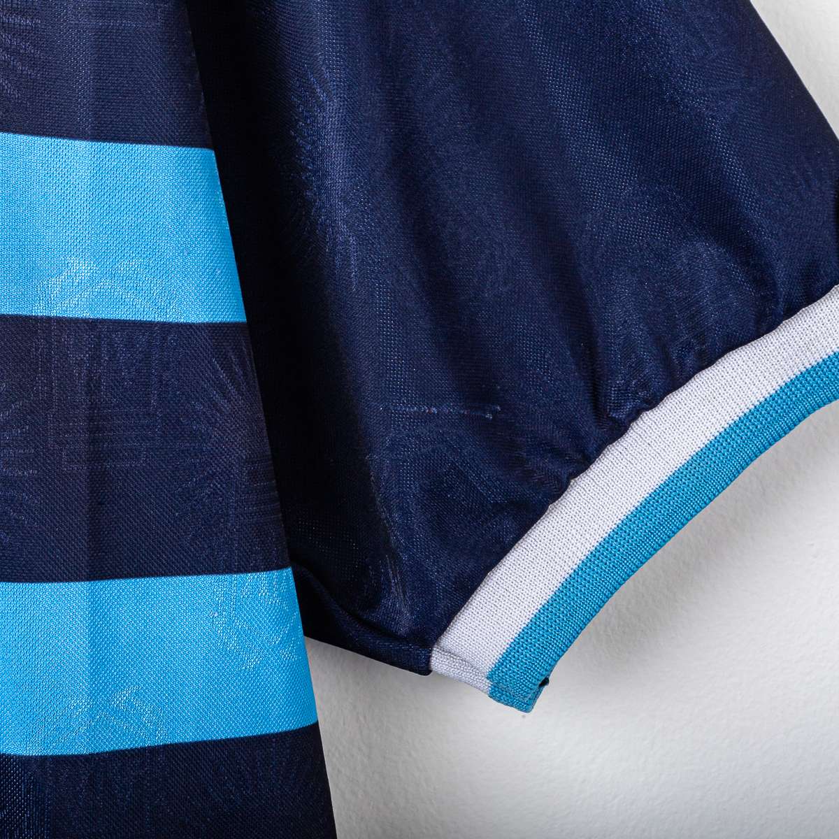 Maglia away della Nazionale Argentina stagione 1999/2000, prodotta da Reebok. Base blu navy con trama tono su tono e doppia banda orizzontale in azzurro sul petto, colletto a V con inserti bianchi e profili azzurri. Logo Reebok ricamato lato destro e Stemma AFA (Asociación del Fútbol Argentino) cucito lato cuore. Sul fronte numero 8 in bianco; sul retro nome Zanetti e numero 8 in bianco floccato. Etichette interne Reebok/AFA: taglia 42/44, composizione 100% poliestere.