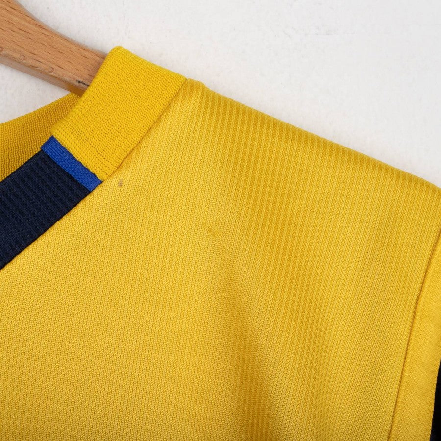 Maglia ufficiale away dell'Arsenal prodotta da Nike per la stagione 1999/2000, con personalizzazione Thierry Henry n.14. Colore giallo con inserti blu navy su fianchi e maniche. Logo Nike ricamato sul petto destro e stemma Arsenal “The Gunners” cucito lato cuore. Sponsor SEGA applicato in flock nero sul fronte. Nome “HENRY” e numero 14 stampati in nero con bordo bianco sul retro, con font ufficiale Premier League e loghi cuciti alla base dei numeri. Tecnologia Dri-Fit. Taglia M.