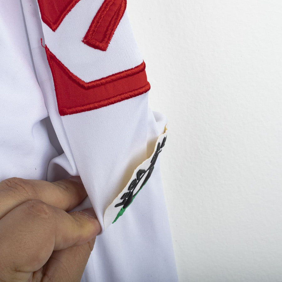 Maglia away del Calcio Catania indossata nella stagione 2009/2010, prodotta da Legea. Design bianco con banda diagonale rossa e celeste sul fronte. Stemma del Catania ricamato lato cuore e logo Legea cucito lato destro. Sponsor Energia Siciliana e Provincia di Catania stampati sul petto. Patch Serie A TIM applicata sulla manica destra. Nome Maxi e numero 11 applicati in stampa azzurra sul retro. Colletto rotondo con dettagli rossi e celesti. Manica lunga. Taglia L.
