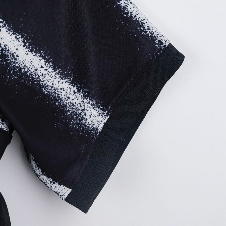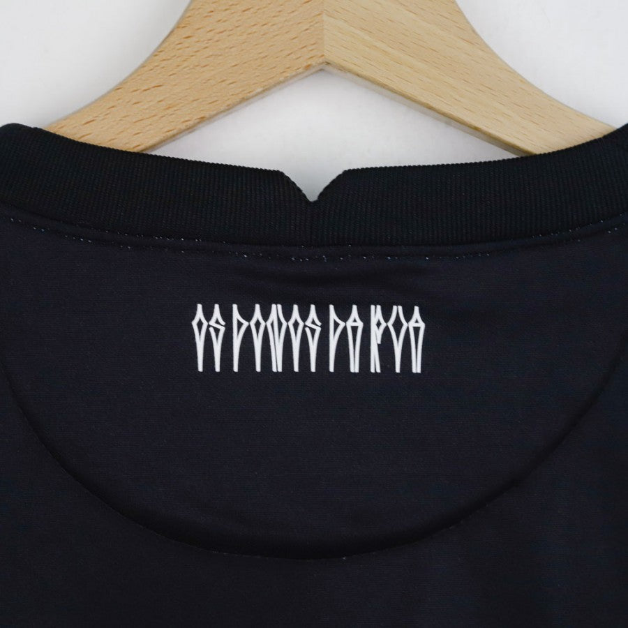 Maglia away Corinthians realizzata dallo sponsor tecnico Nike per la stagione 2021/2022. Di colore nero presenta delle righe bianche verticali con effetto verniciato. Lo stemma del club è cucito sul lato del cuore, il logo dello sponsor tecnico ricamato. Taglia L.